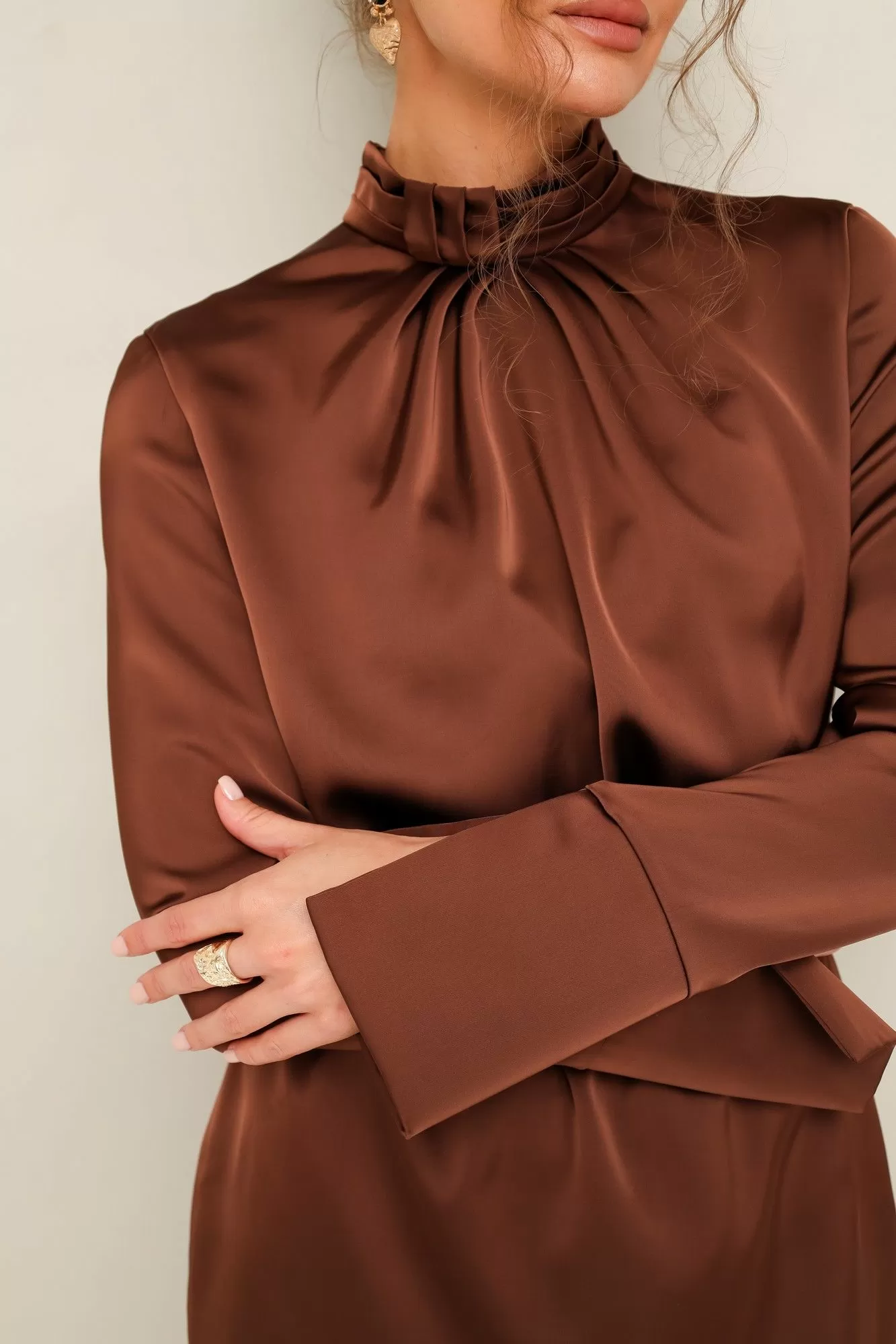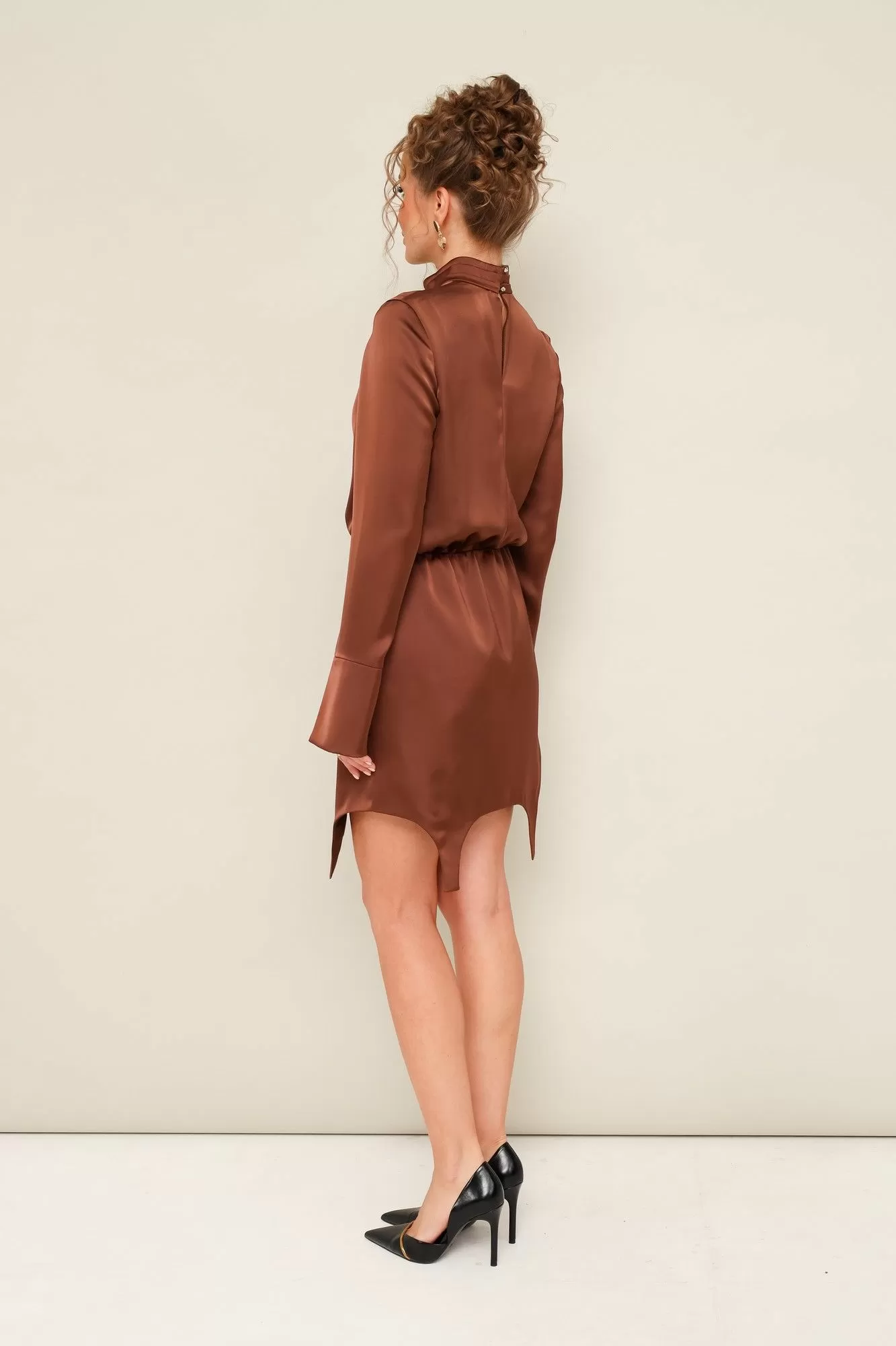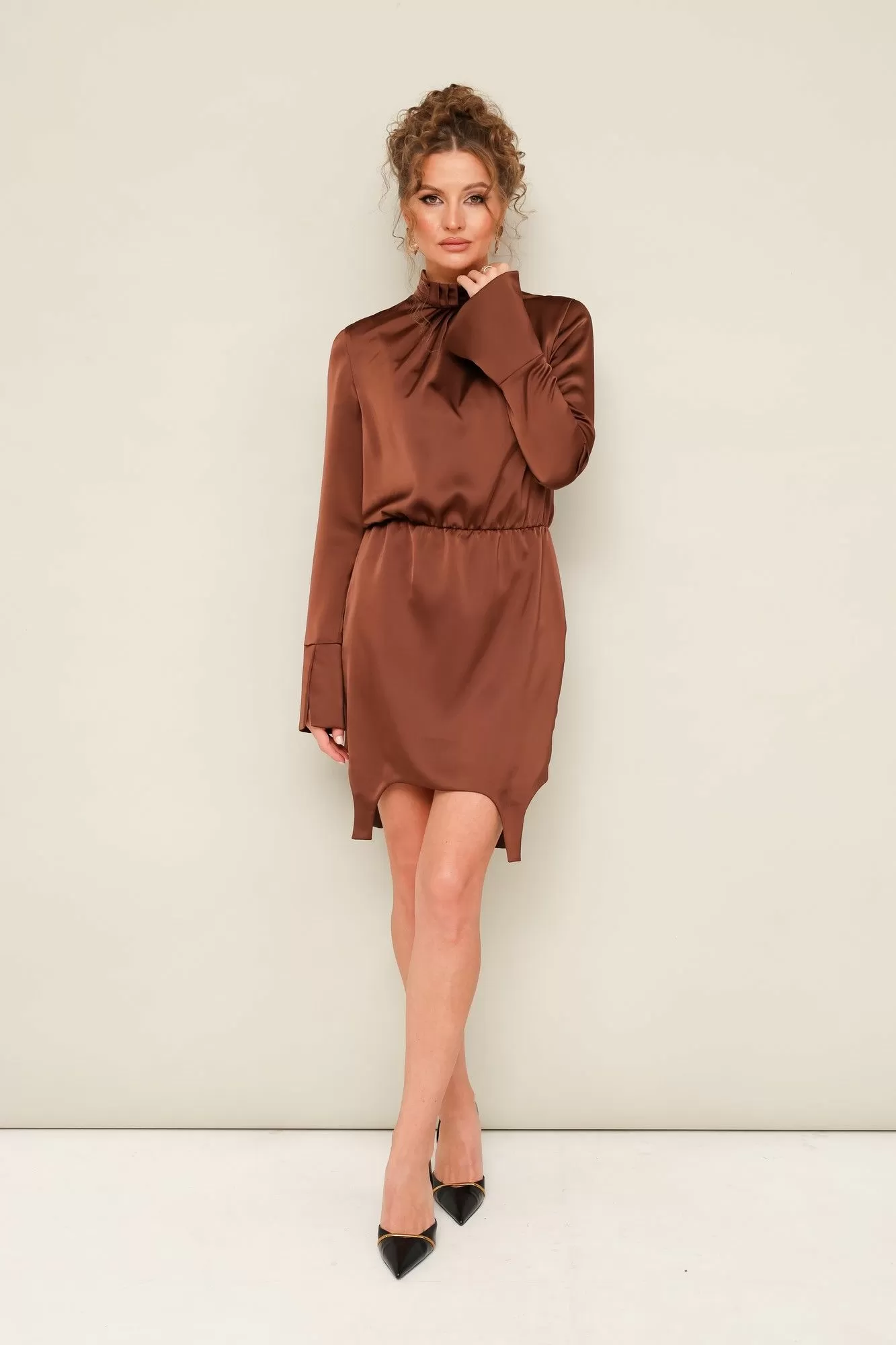 Стильное платье полуприлегающего силуэта, выполнено из струящейся ткани с матовым блеском. Платье отрезное по линии талии на резинке. Горловина с отрезной стойкой и лиф переда декорированы складками. Втачные длинные рукава с манжетами. В среднем шве спинки обработана застёжка на стойке на пуговицы и навесные петли. Низ платья фигурной формы.