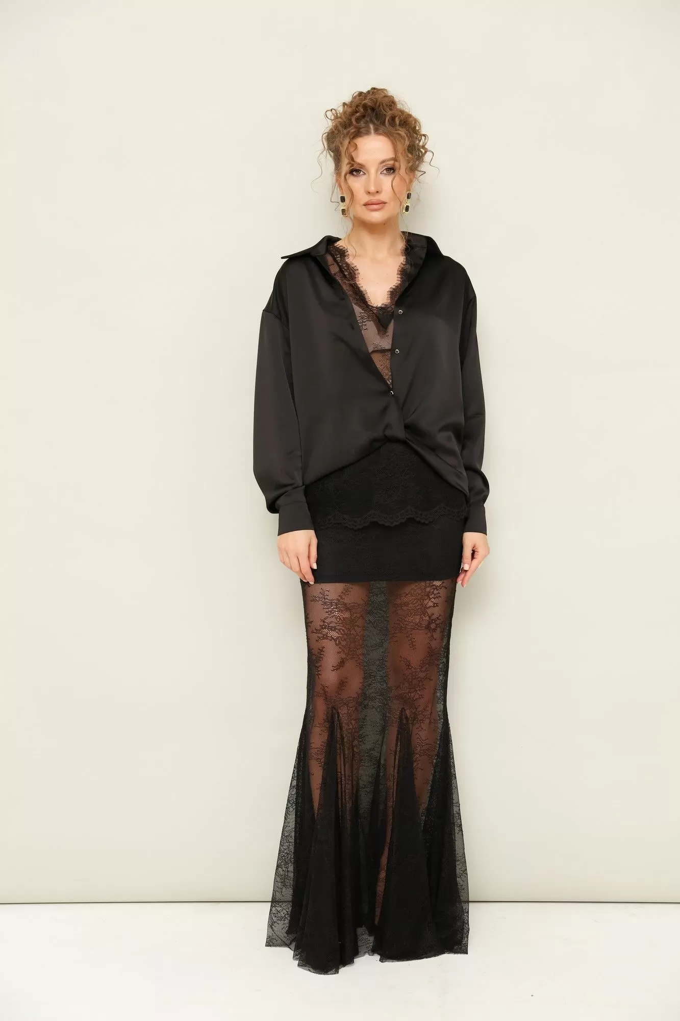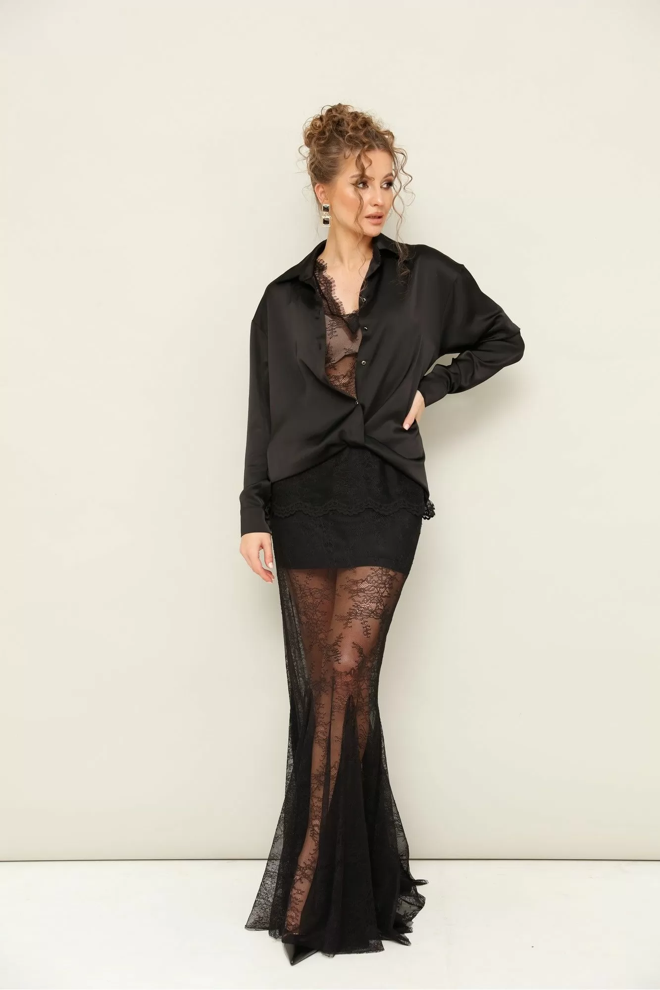 Силуэтная юбка годе с расклешением от линии колен с втачными клиньями. Юбка выполнена из изысканного французского кружева. Пояс обработан резинкой для комфорта и регуляции размера.