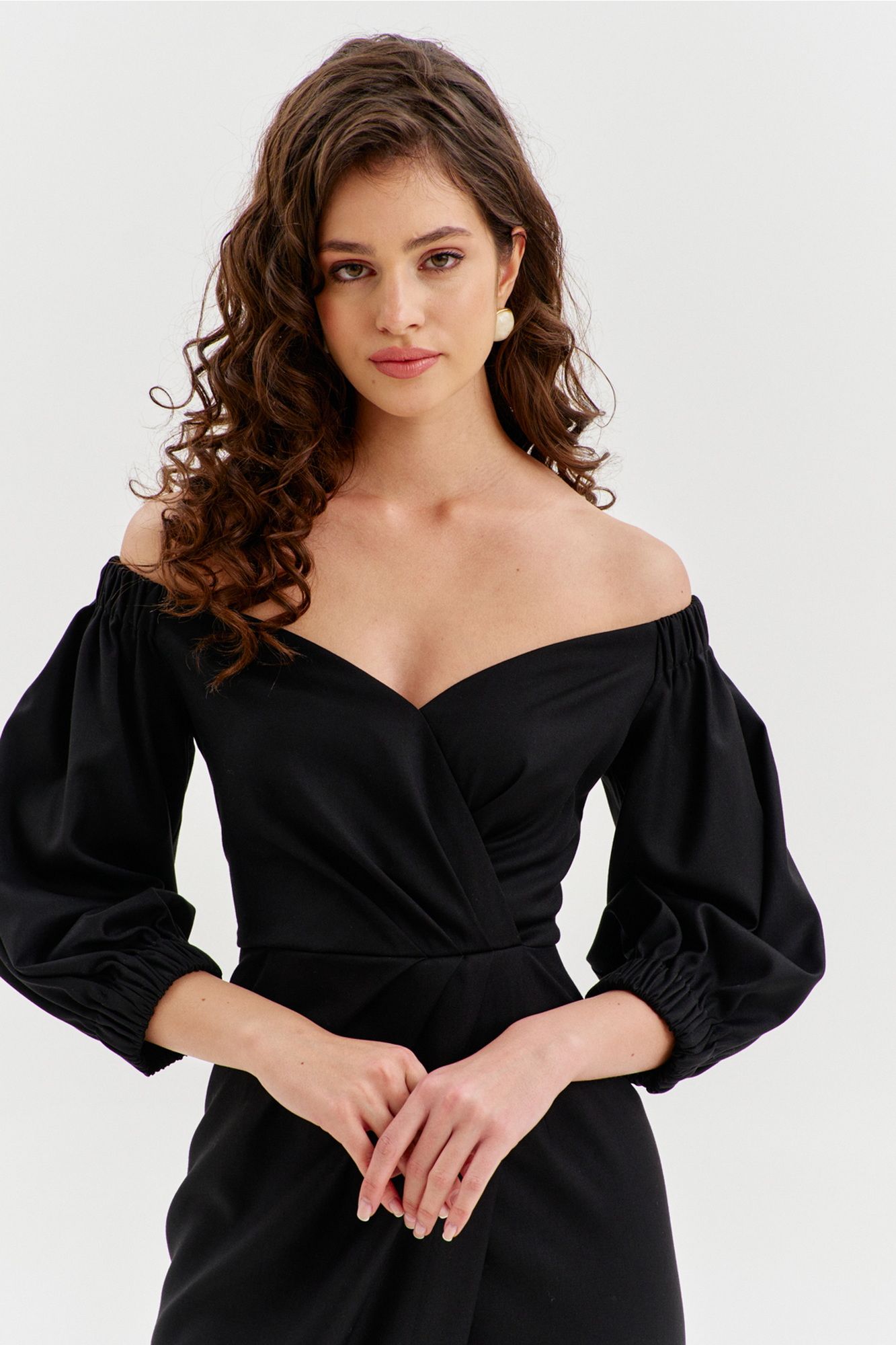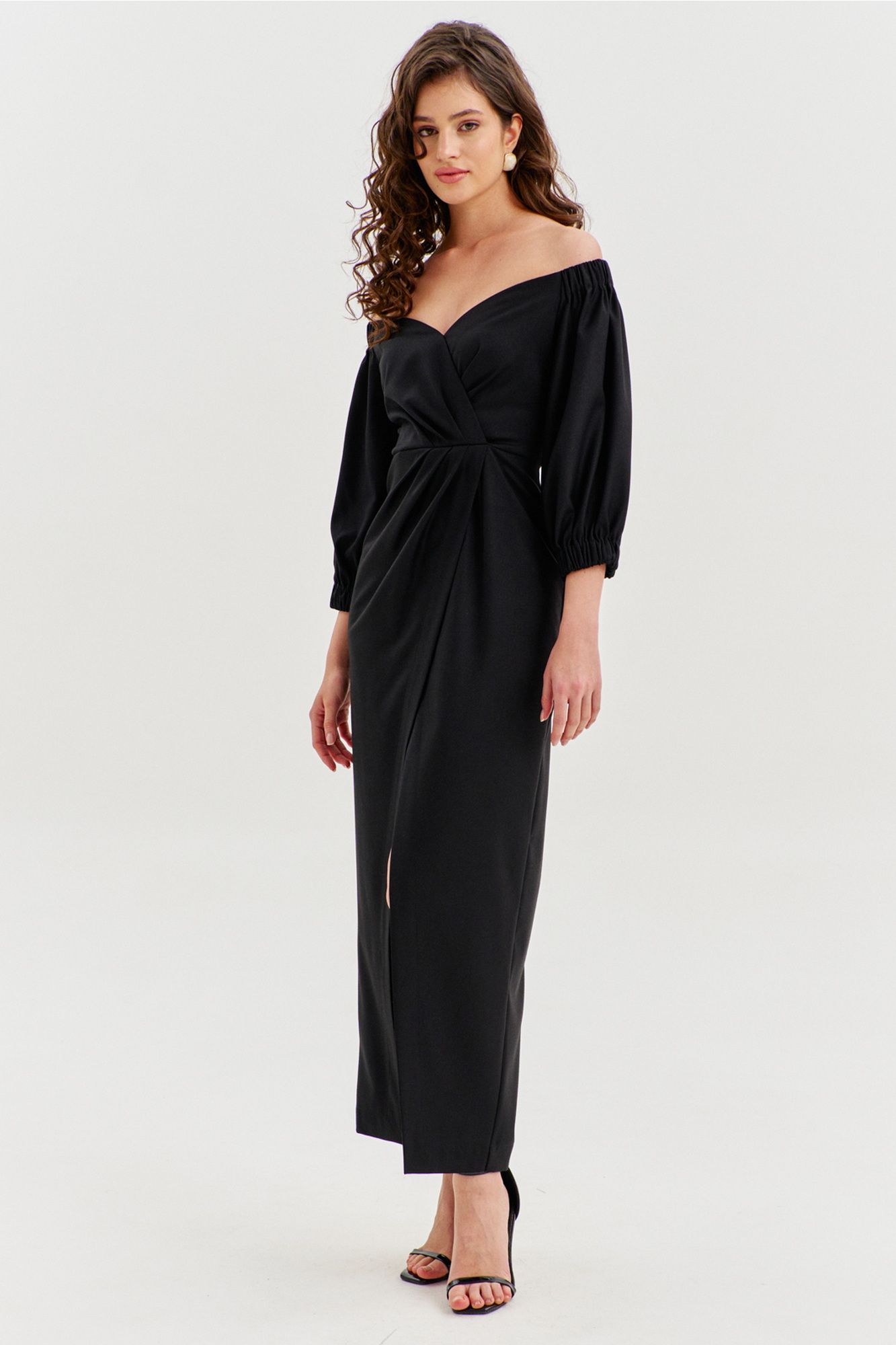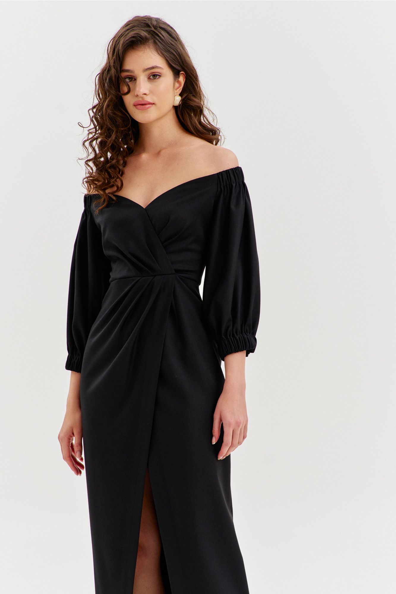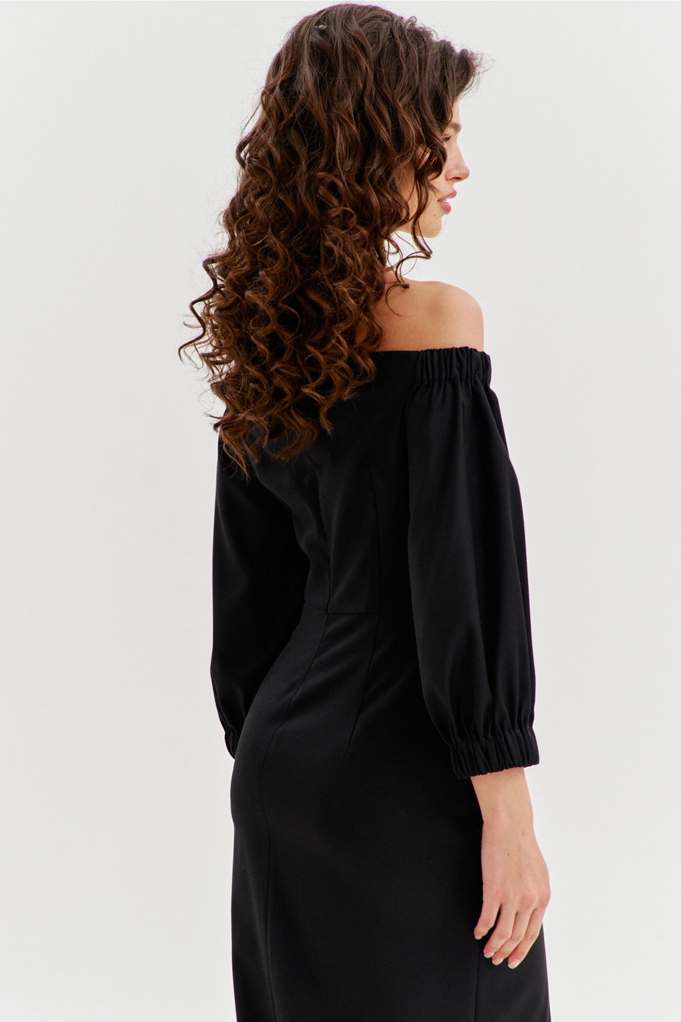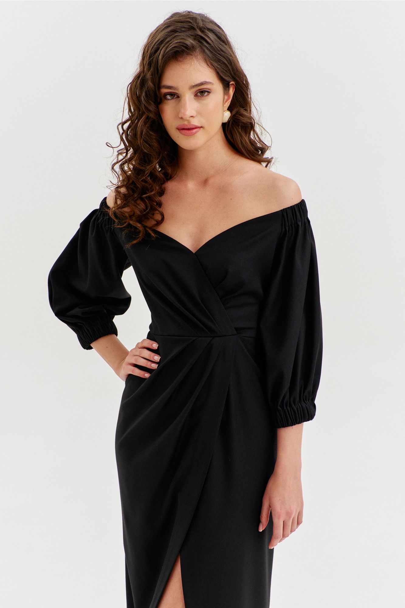 Платье полуприлегающего силуэта, длиной чуть ниже щиколотки. Платье отрезное по линии талии. Лиф спинки с талиевыми вытачками. Юбка спинки с талиевыми вытачками. В среднем шве спинки обработана застежка на потайную тесьму-«молнию». Лиф переда выполнен на запах с мягкими односторонними складками. Юбка переда выполнена на запах. Верхнее переднее полотнище с мягкими односторонними складками. Платье с открытыми плечами. Рукава одношовные, втачные, длиной 3/4. По окату рукава и низу вставлена резинка.