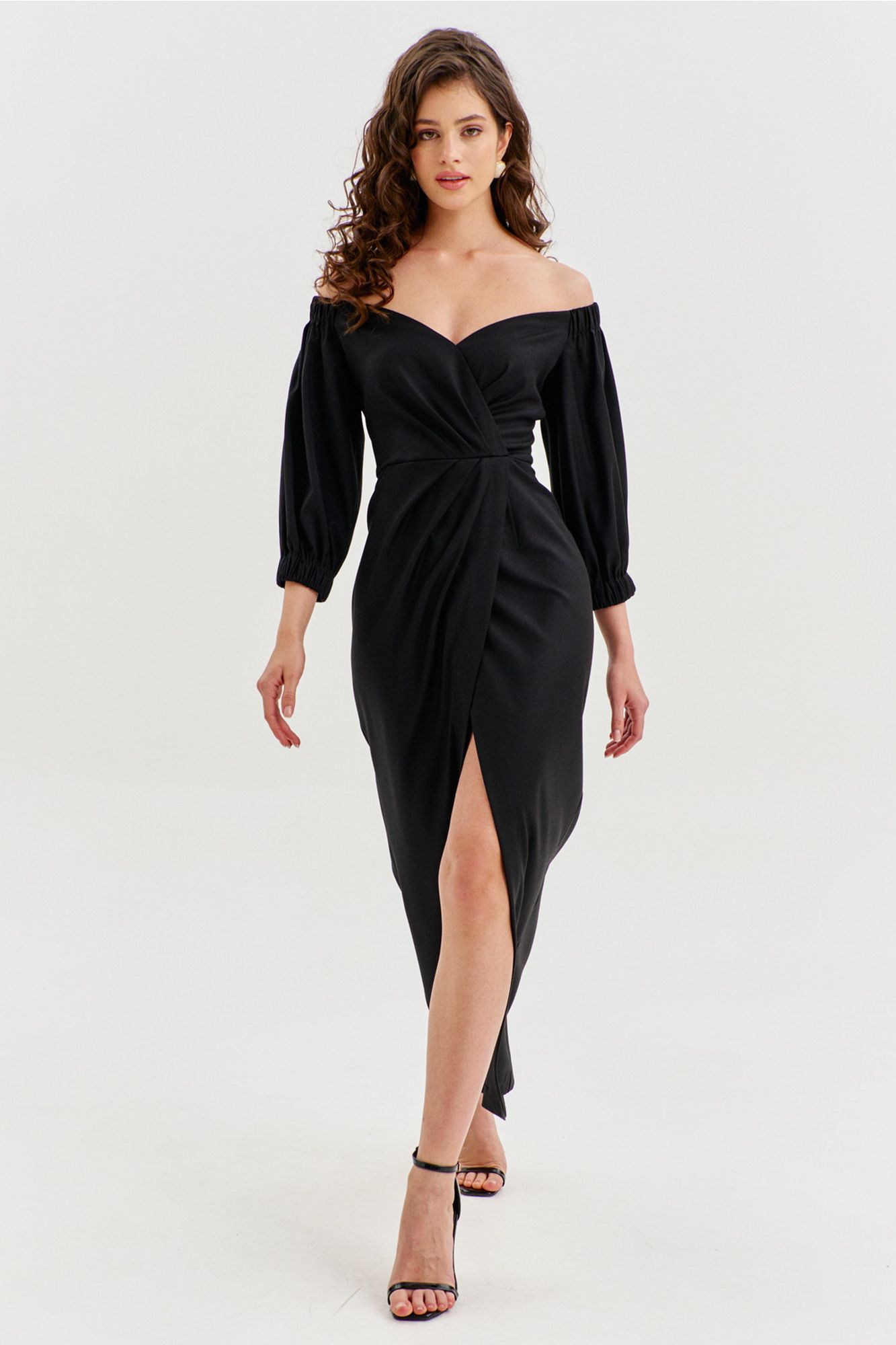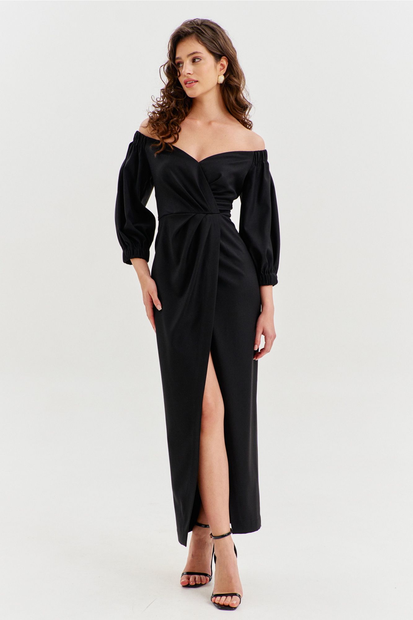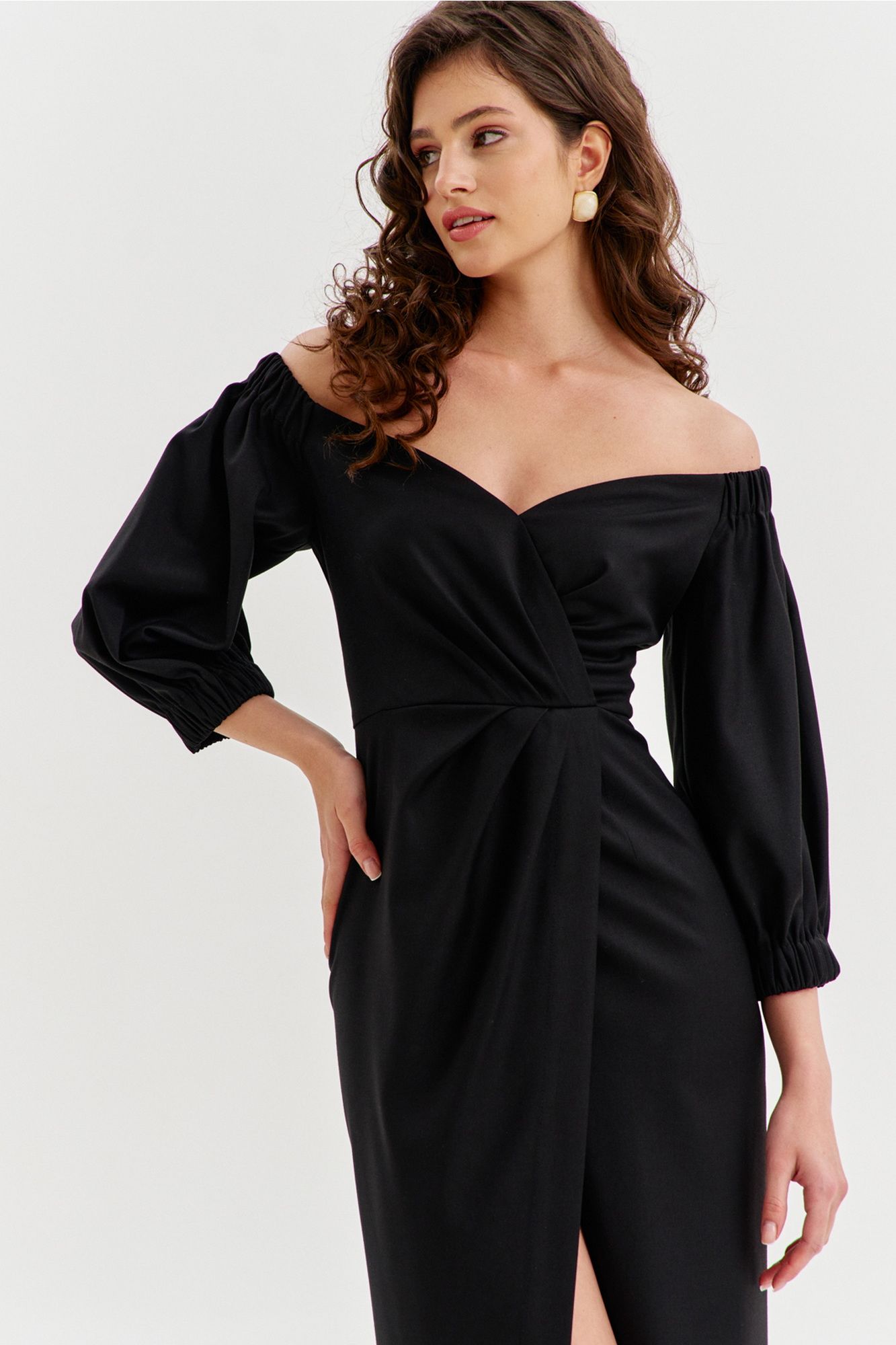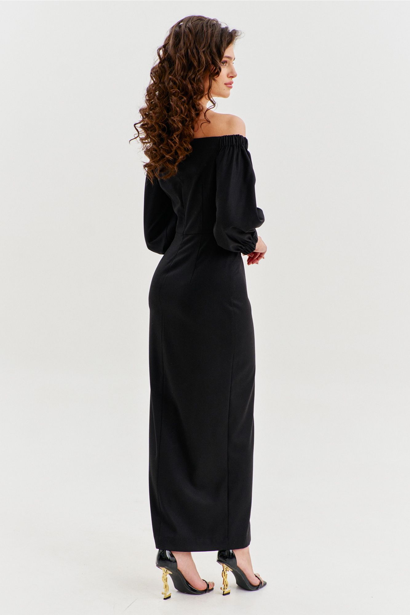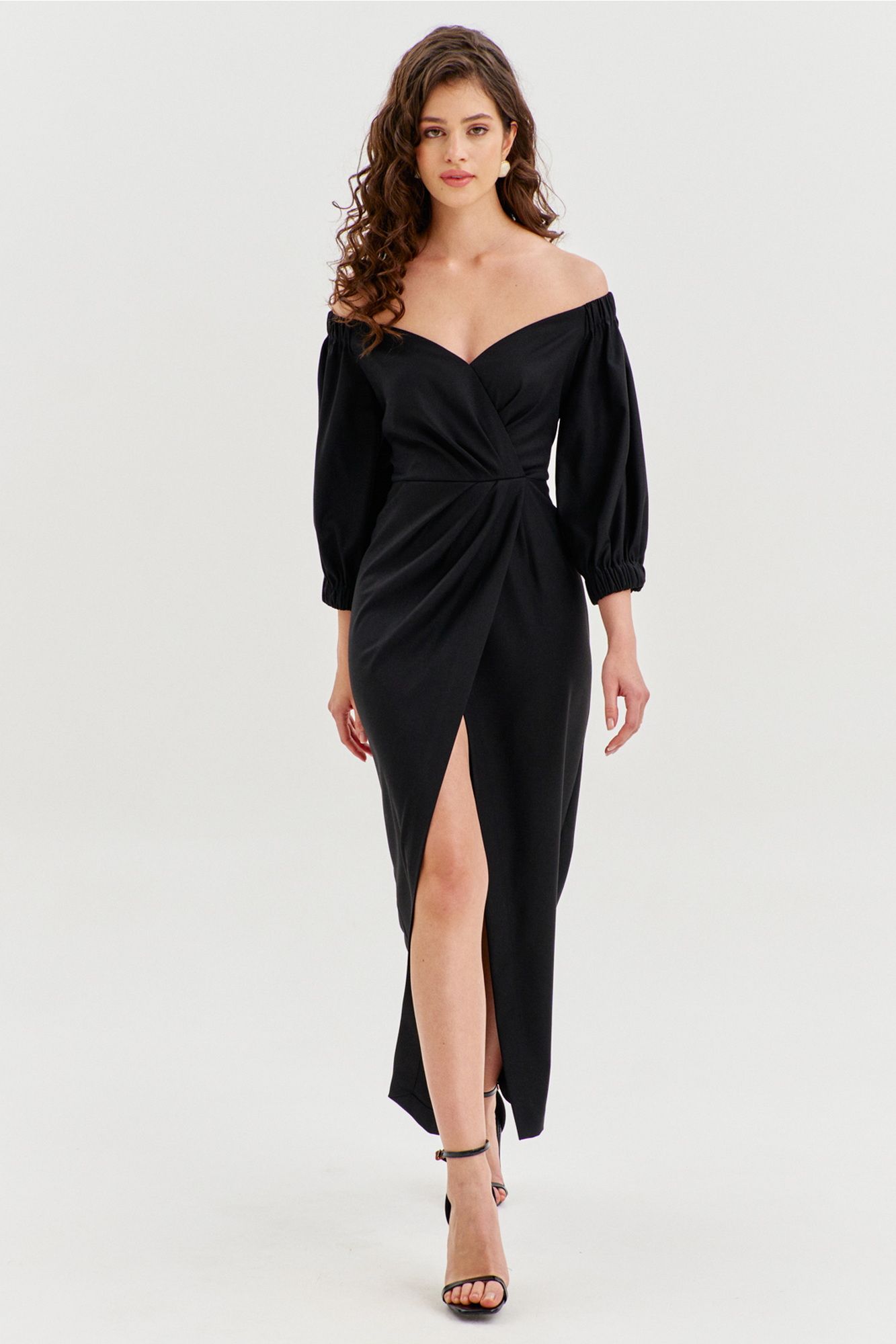 Платье полуприлегающего силуэта, длиной чуть ниже щиколотки. Платье отрезное по линии талии. Лиф спинки с талиевыми вытачками. Юбка спинки с талиевыми вытачками. В среднем шве спинки обработана застежка на потайную тесьму-«молнию». Лиф переда выполнен на запах с мягкими односторонними складками. Юбка переда выполнена на запах. Верхнее переднее полотнище с мягкими односторонними складками. Платье с открытыми плечами. Рукава одношовные, втачные, длиной 3/4. По окату рукава и низу вставлена резинка.