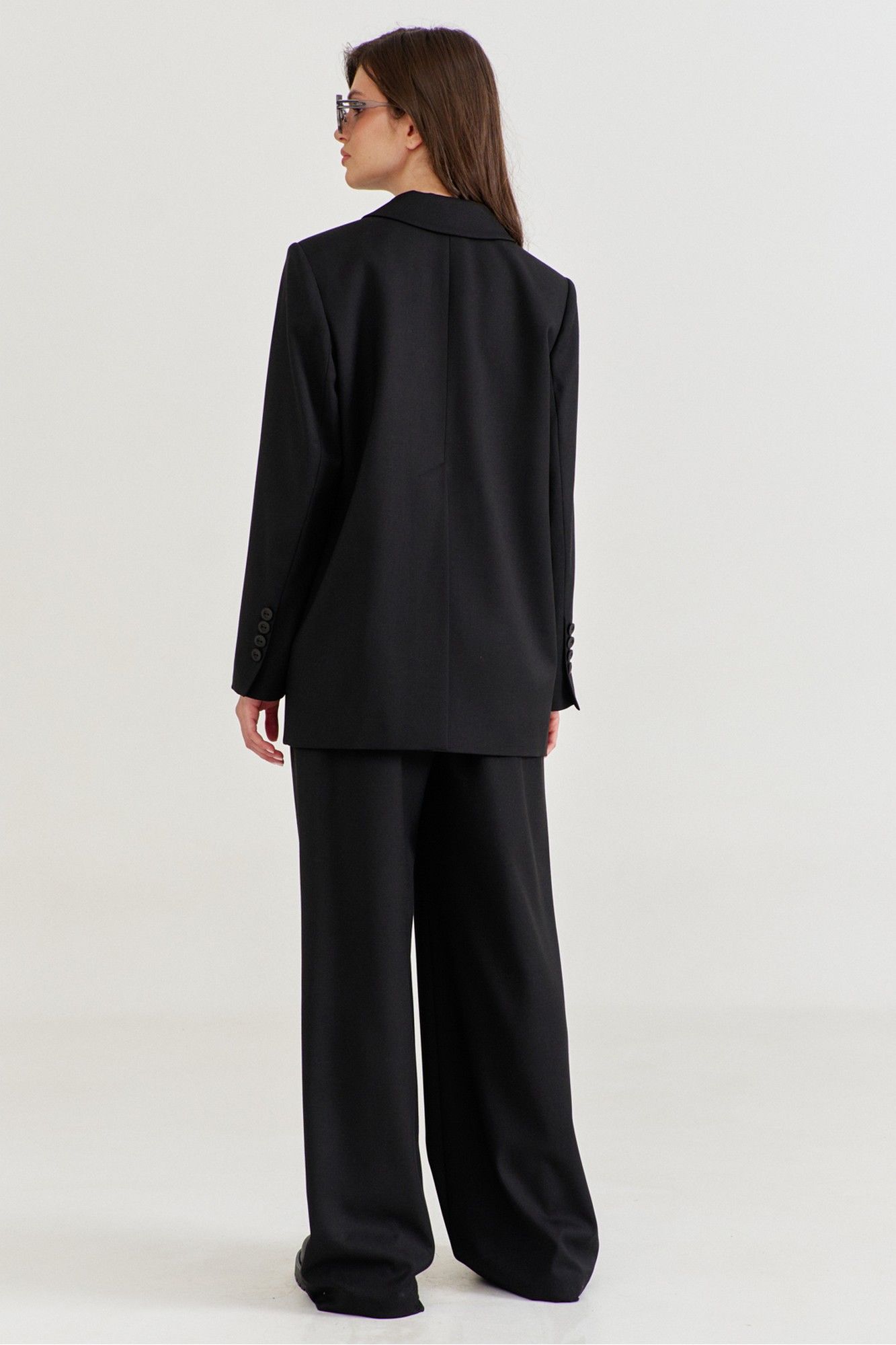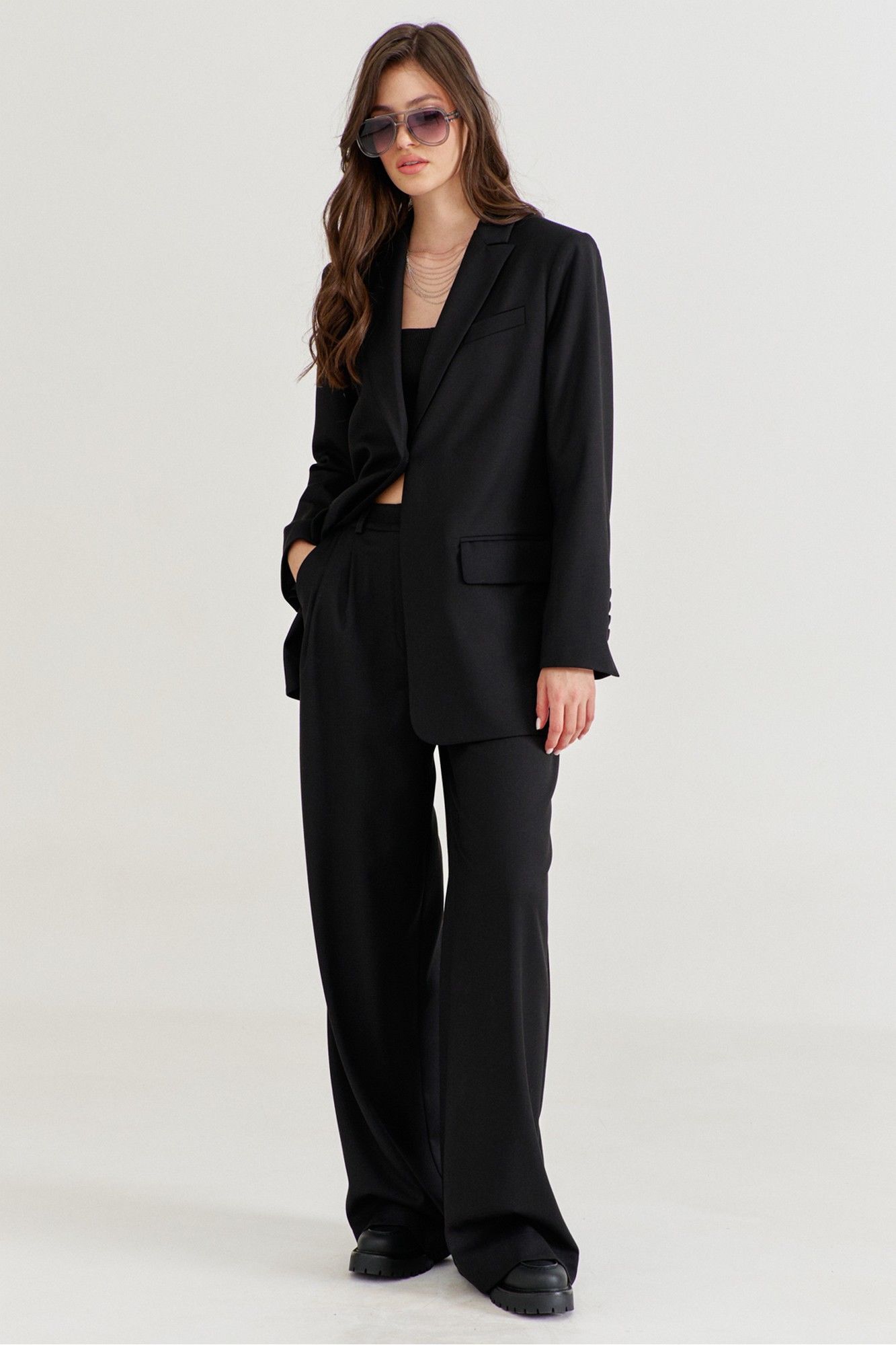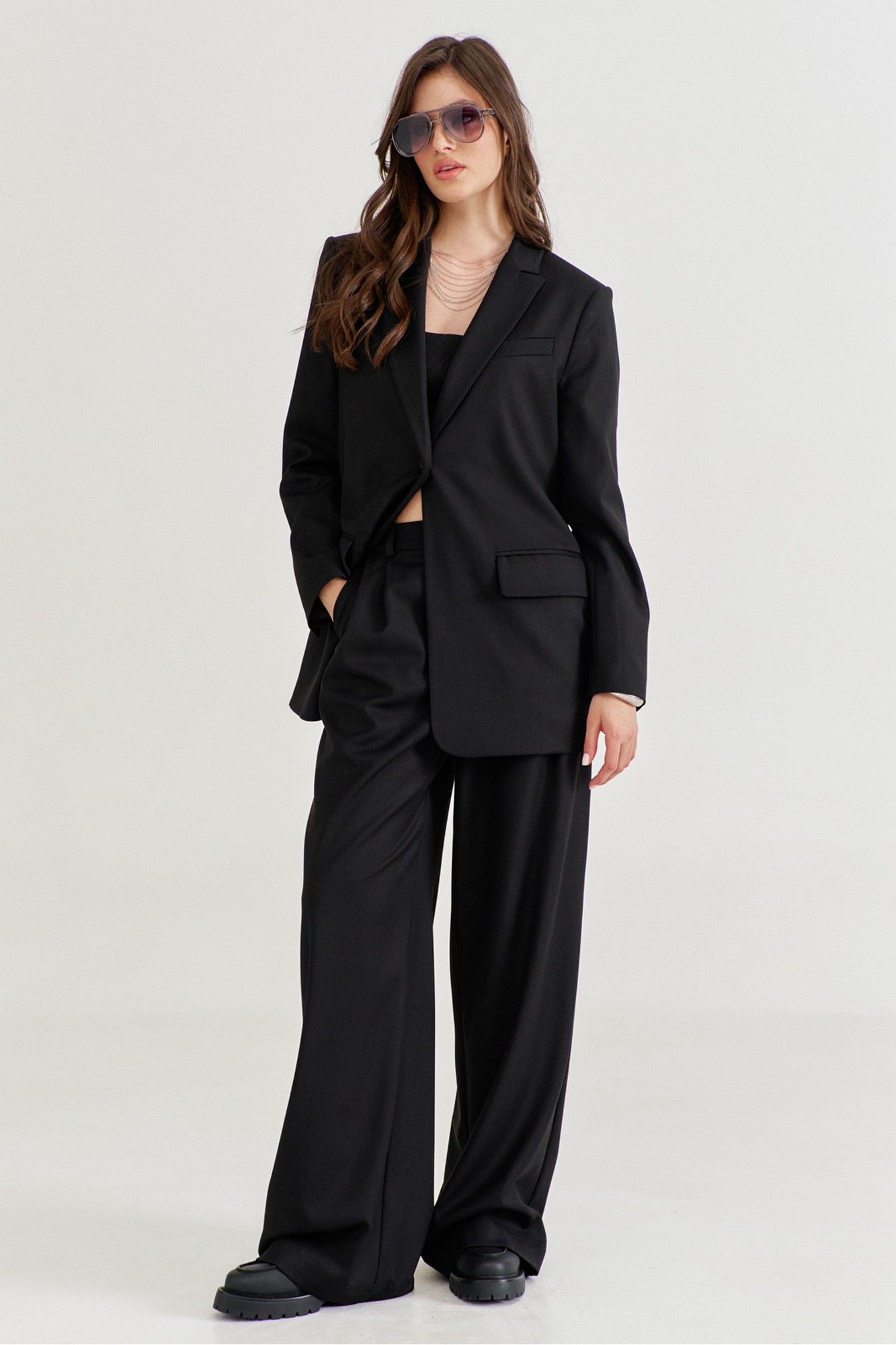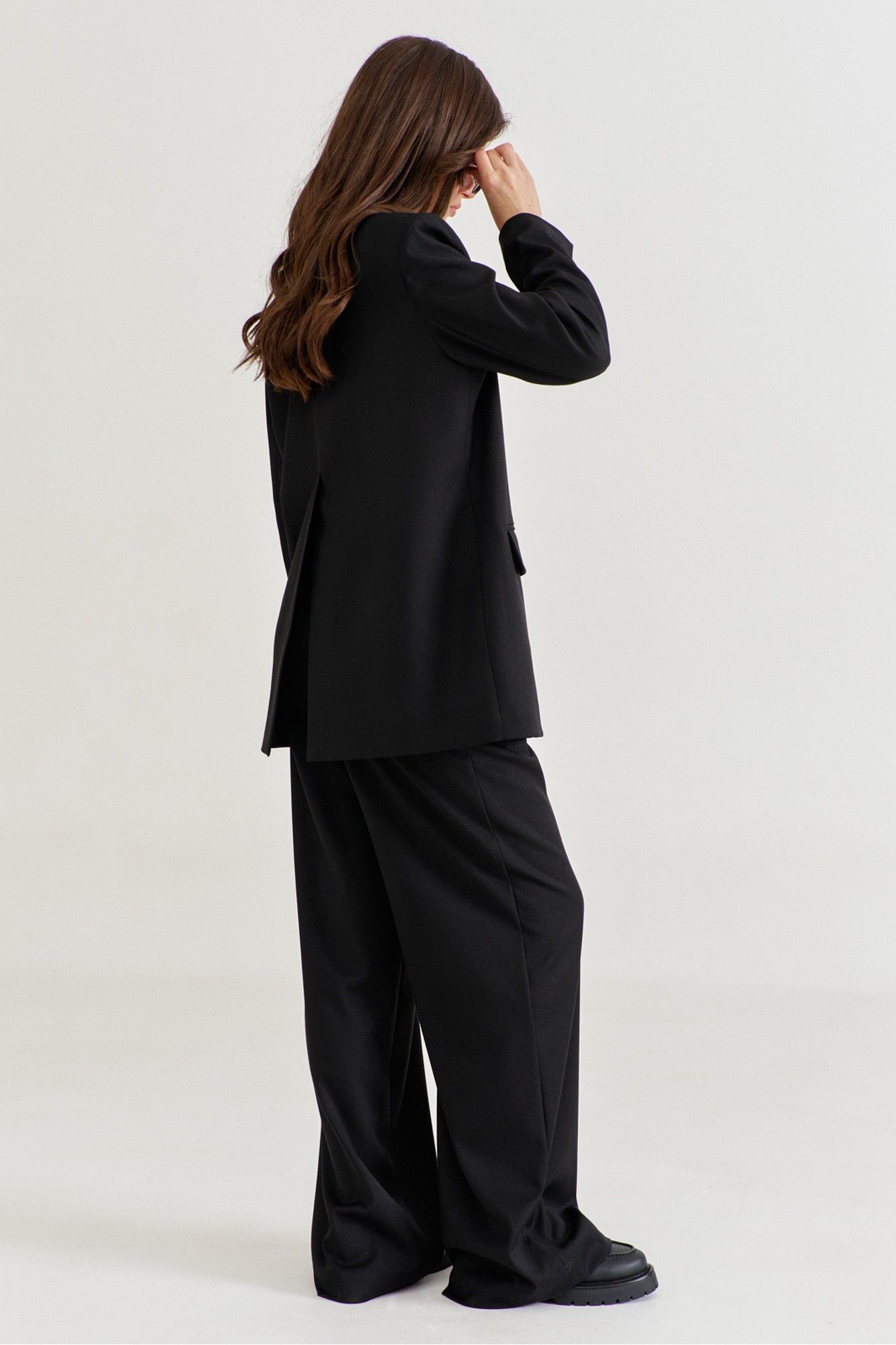 Костюм женский, состоящий из жакета и брюк. Жакет прямого силуэта, длиной ниже линии бедер. Спинка со средним швом, в котором обработана высокая шлица. По переду обработаны карманы «в рамку» с клапаном. В области груди на левом переде обработан карман-обманка с листочкой. Рукава длинные, двушовные, втачные. По низу рукава, в локтевом шве обработана шлица. Воротник пиджачного типа с лацканами. Застежка по переду на петлю и пуговицу. Жакет на подкладке, с плечевыми накладками. Брюки длинные, широкие. По задним половинкам талиевые вытачки. По передним половинкам односторонние складки, боковые карманы и застежка на тесьму-«молнию» с гульфиком и откоском. Брюки на притачном поясе, по спинке с резинкой. По поясу вставлены шлевки.