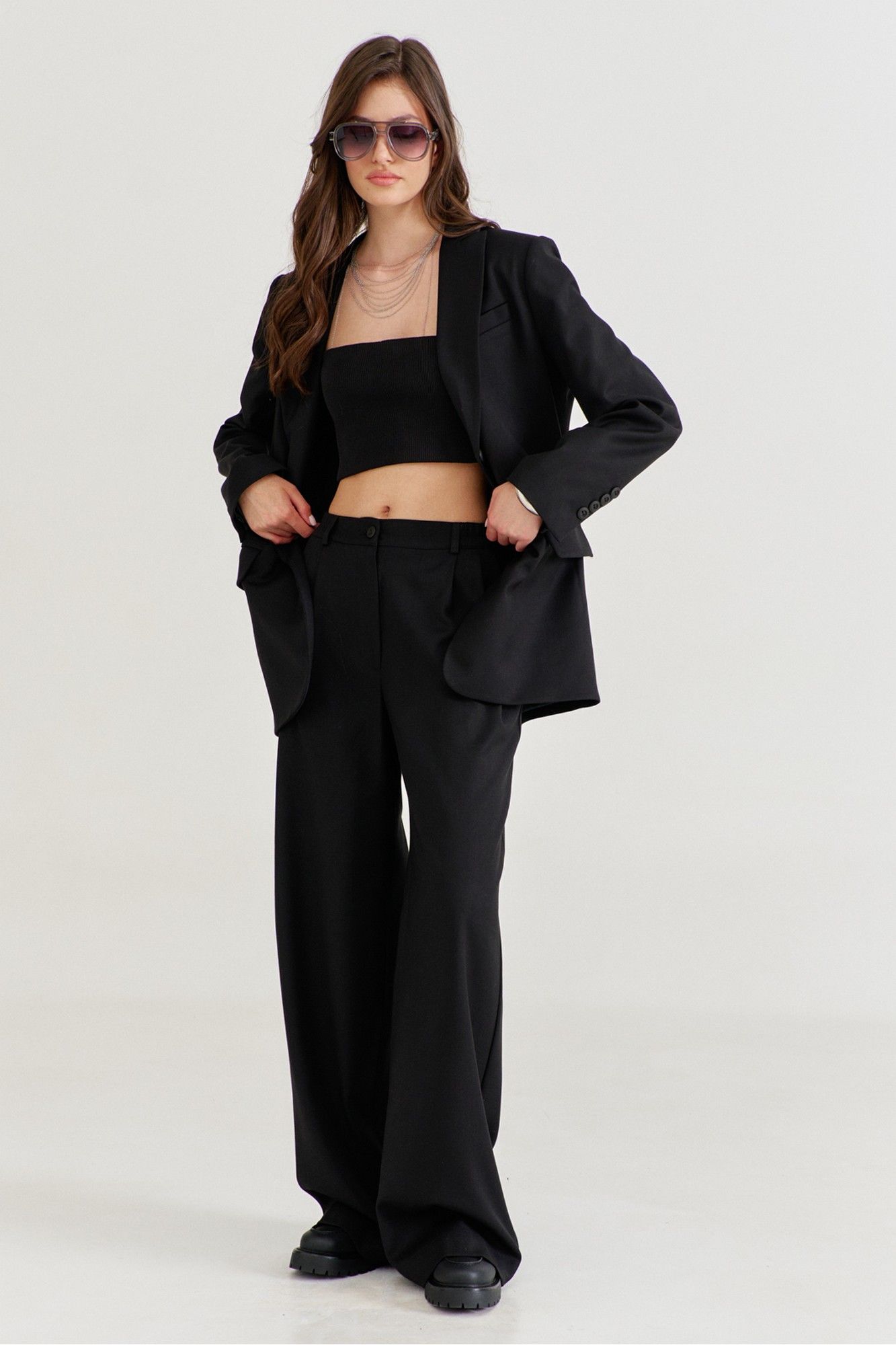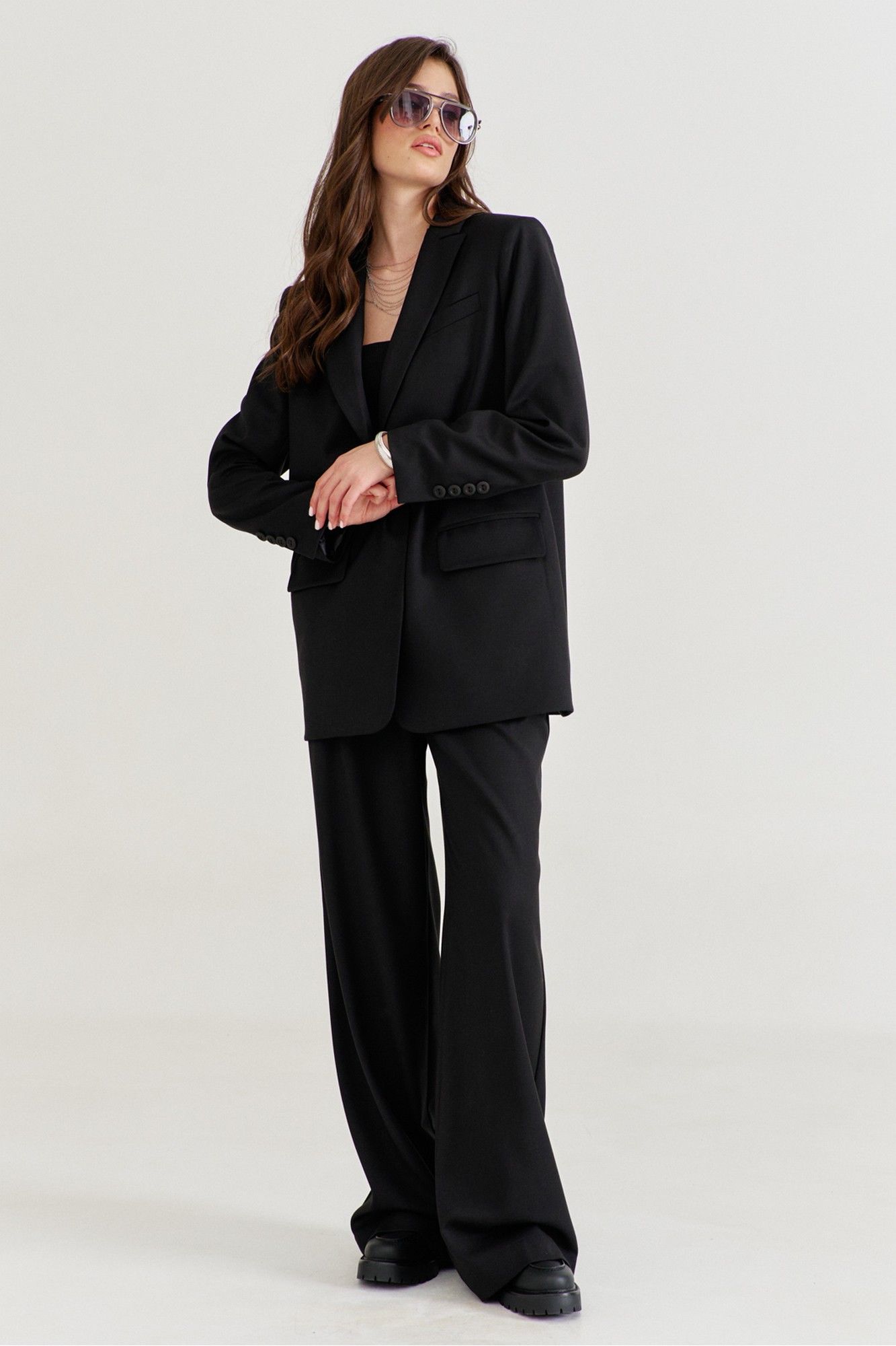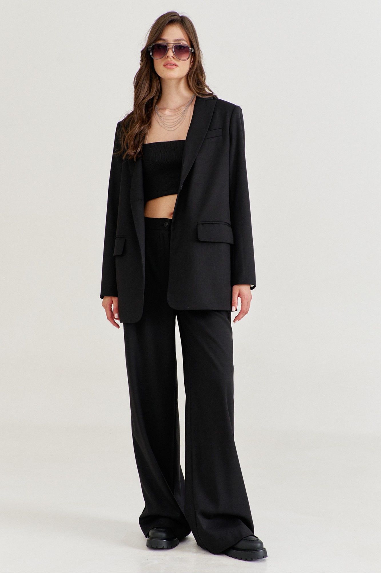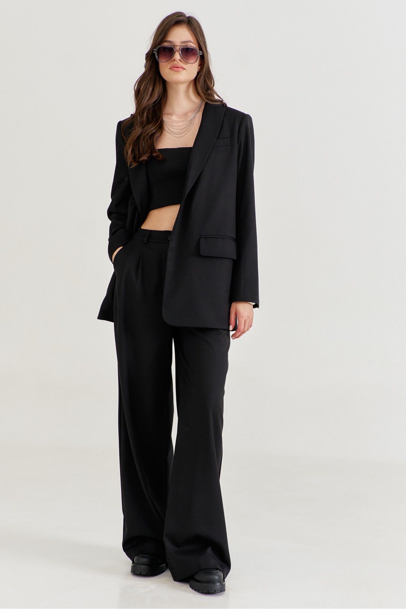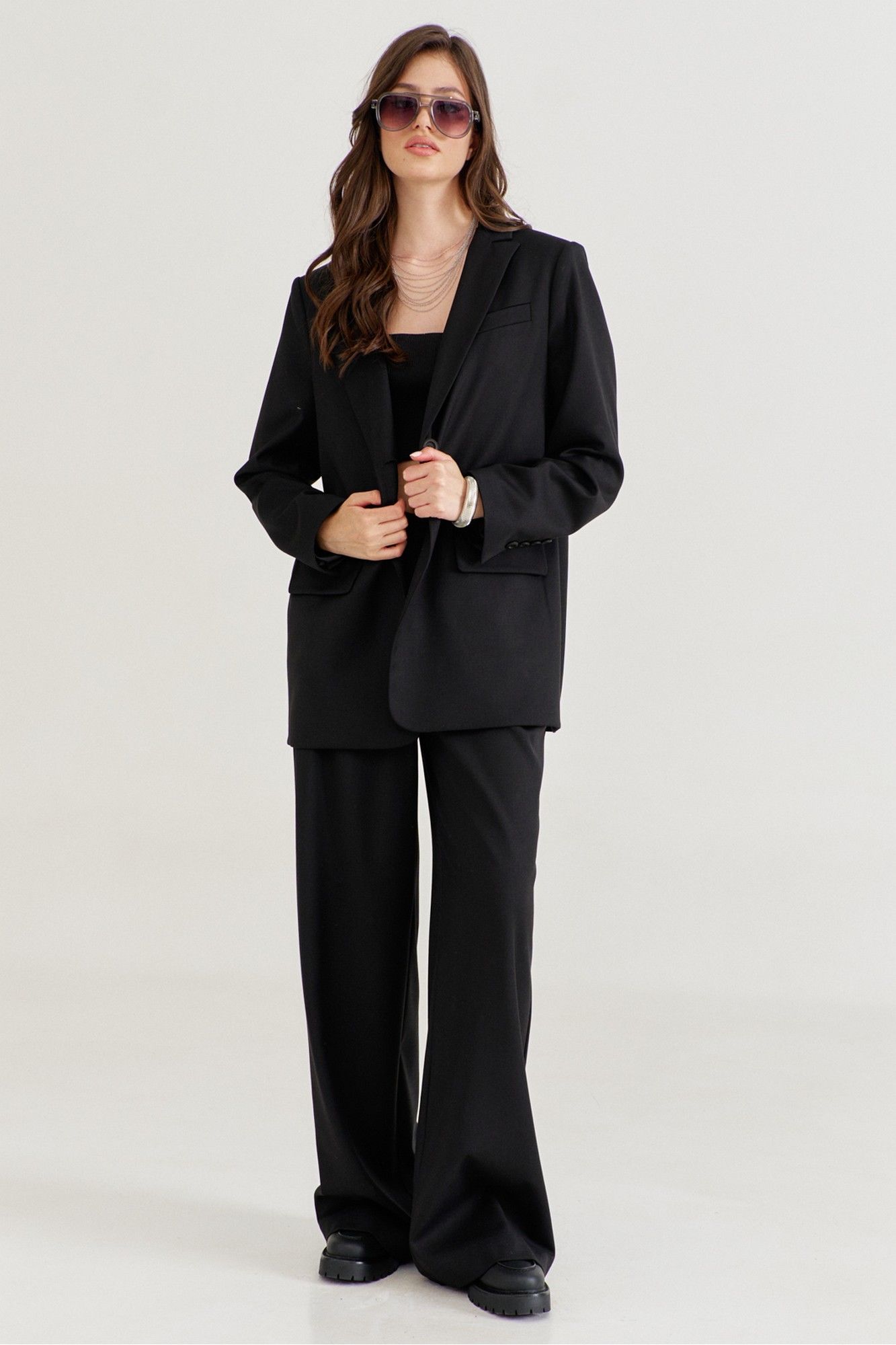Костюм женский, состоящий из жакета и брюк. Жакет прямого силуэта, длиной ниже линии бедер. Спинка со средним швом, в котором обработана высокая шлица. По переду обработаны карманы «в рамку» с клапаном. В области груди на левом переде обработан карман-обманка с листочкой. Рукава длинные, двушовные, втачные. По низу рукава, в локтевом шве обработана шлица. Воротник пиджачного типа с лацканами. Застежка по переду на петлю и пуговицу. Жакет на подкладке, с плечевыми накладками. Брюки длинные, широкие. По задним половинкам талиевые вытачки. По передним половинкам односторонние складки, боковые карманы и застежка на тесьму-«молнию» с гульфиком и откоском. Брюки на притачном поясе, по спинке с резинкой. По поясу вставлены шлевки.