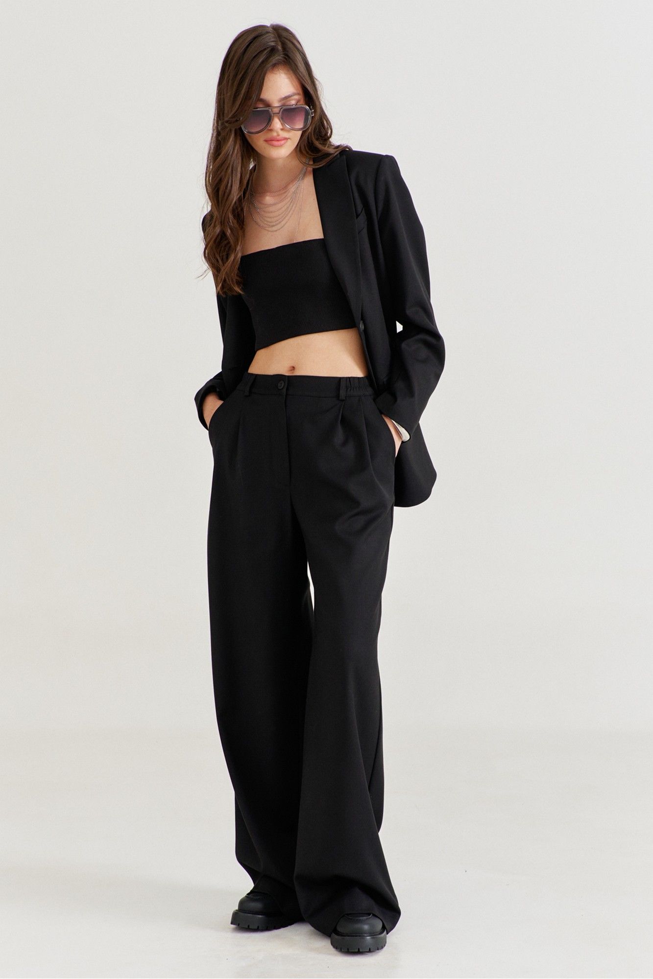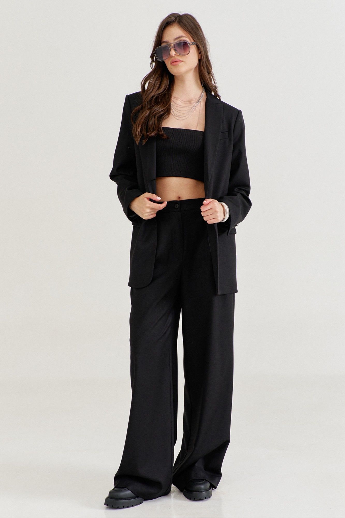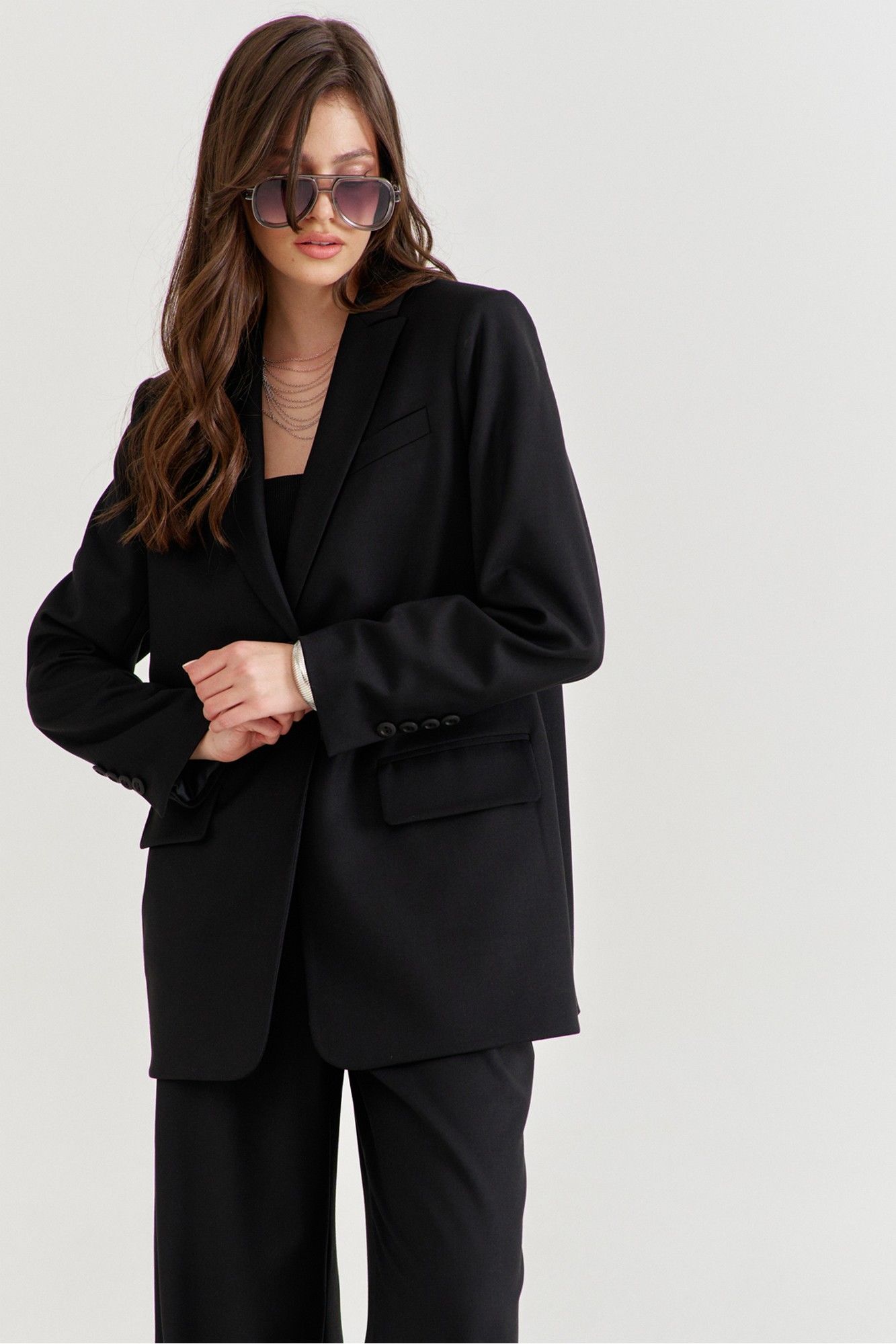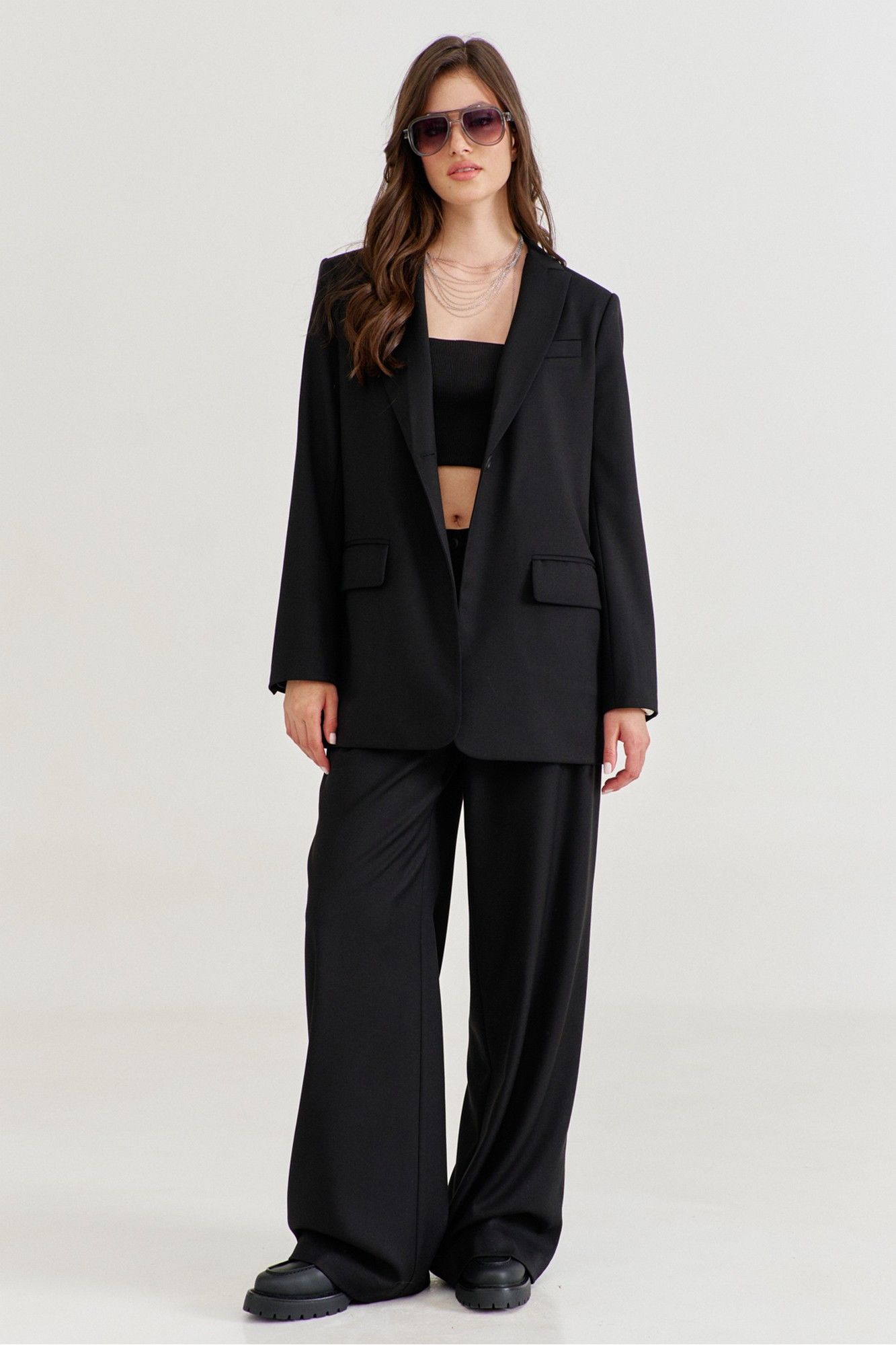 Костюм женский, состоящий из жакета и брюк. Жакет прямого силуэта, длиной ниже линии бедер. Спинка со средним швом, в котором обработана высокая шлица. По переду обработаны карманы «в рамку» с клапаном. В области груди на левом переде обработан карман-обманка с листочкой. Рукава длинные, двушовные, втачные. По низу рукава, в локтевом шве обработана шлица. Воротник пиджачного типа с лацканами. Застежка по переду на петлю и пуговицу. Жакет на подкладке, с плечевыми накладками. Брюки длинные, широкие. По задним половинкам талиевые вытачки. По передним половинкам односторонние складки, боковые карманы и застежка на тесьму-«молнию» с гульфиком и откоском. Брюки на притачном поясе, по спинке с резинкой. По поясу вставлены шлевки.