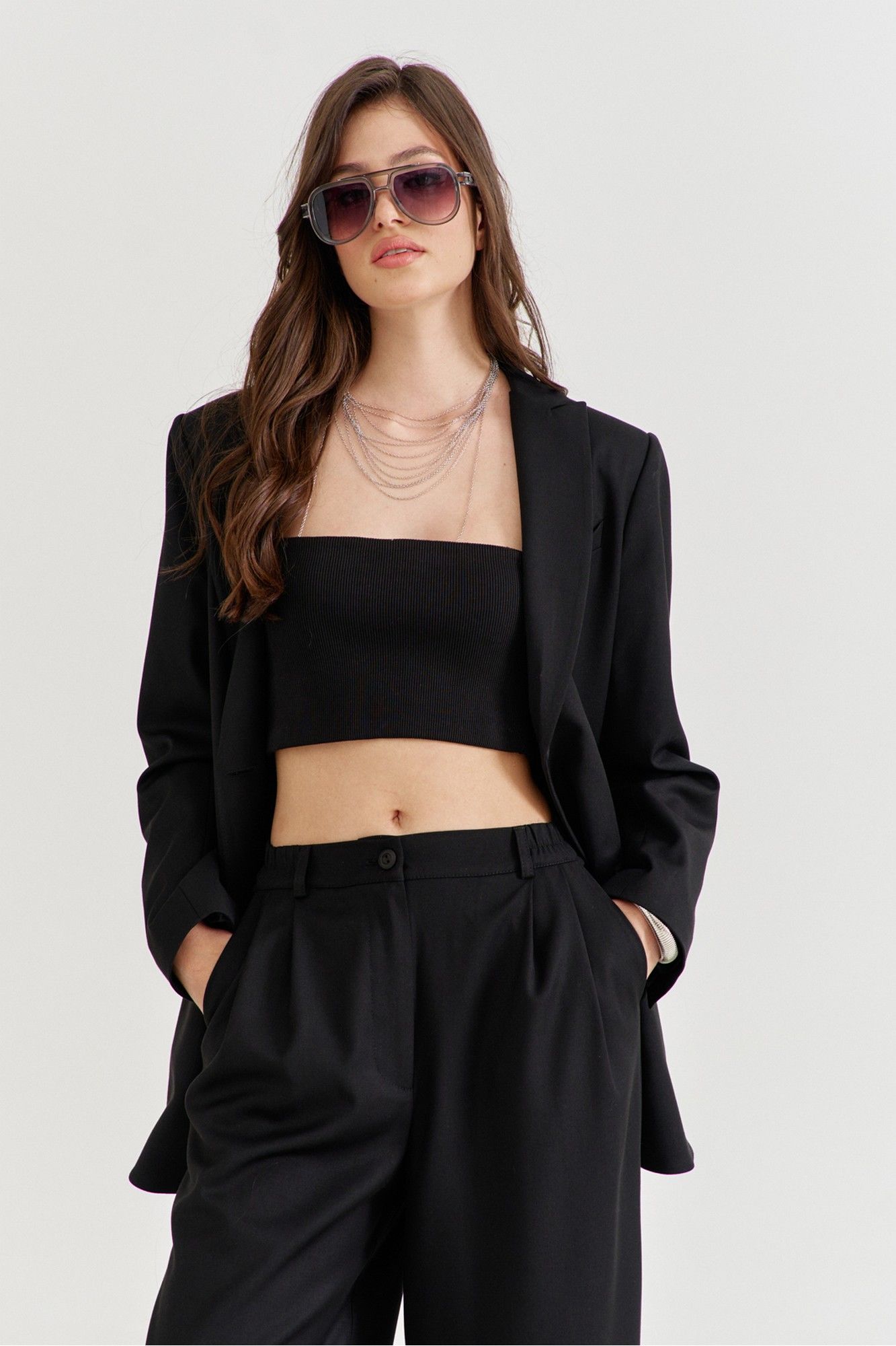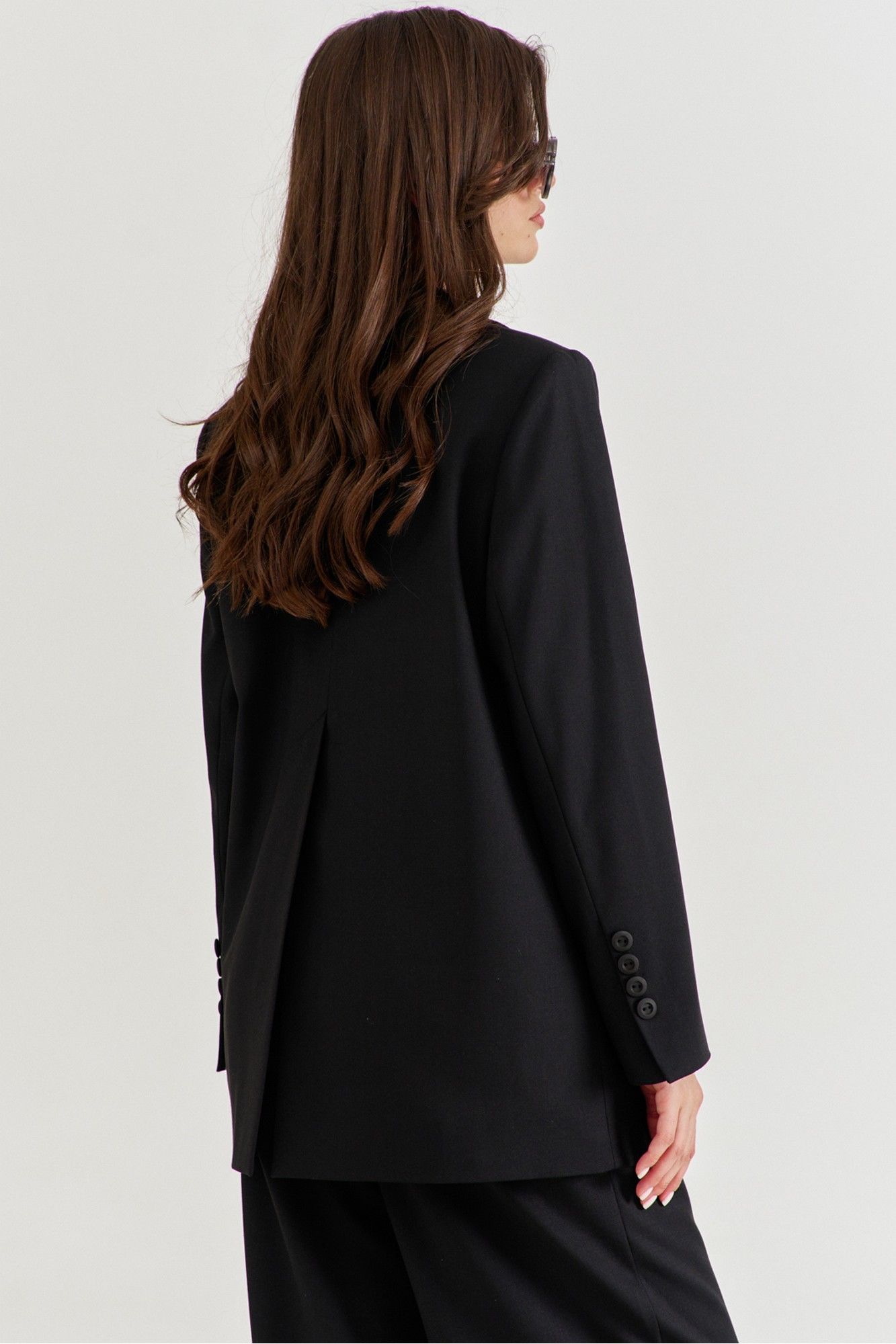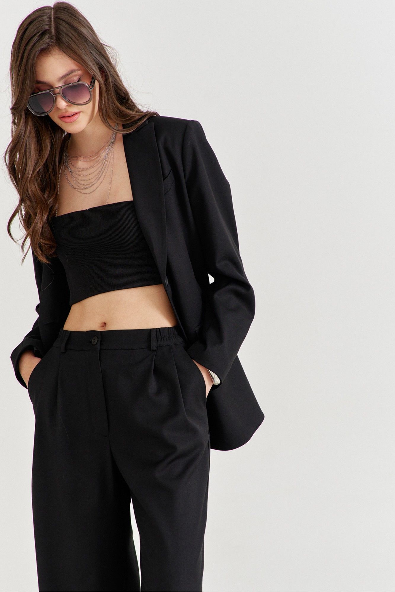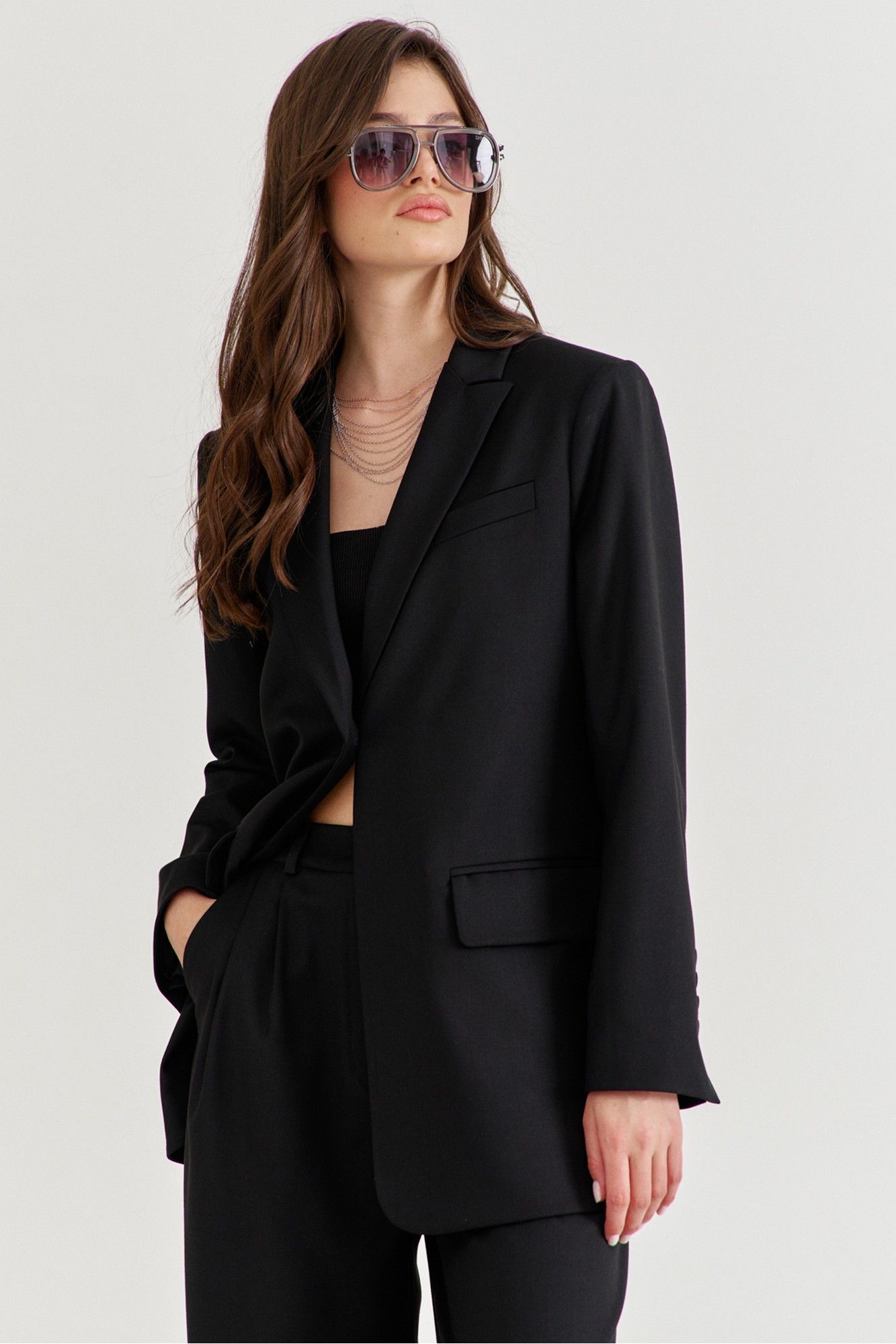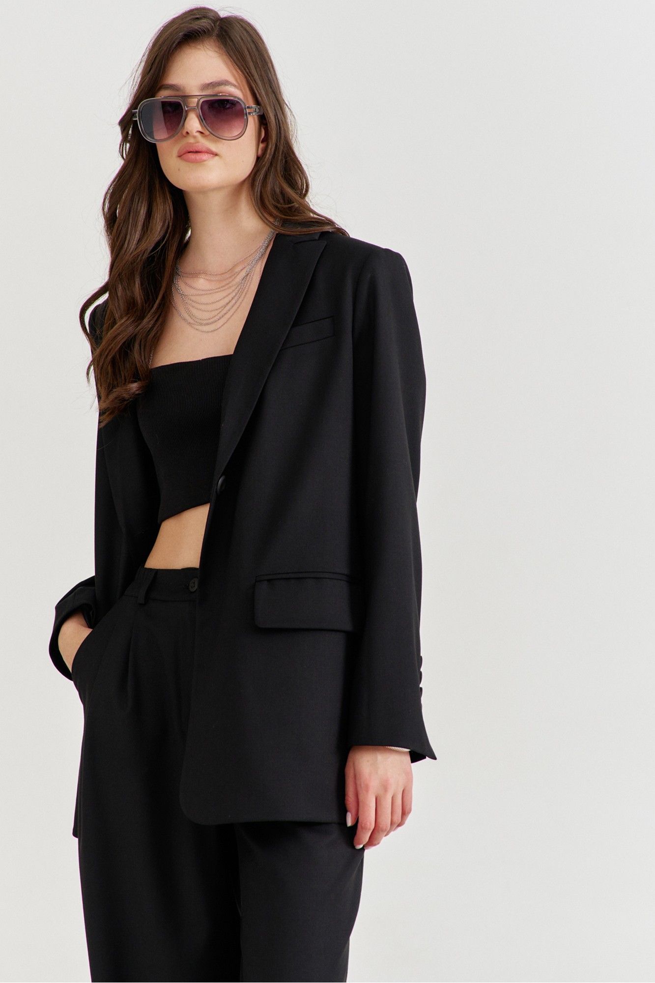 Костюм женский, состоящий из жакета и брюк. Жакет прямого силуэта, длиной ниже линии бедер. Спинка со средним швом, в котором обработана высокая шлица. По переду обработаны карманы «в рамку» с клапаном. В области груди на левом переде обработан карман-обманка с листочкой. Рукава длинные, двушовные, втачные. По низу рукава, в локтевом шве обработана шлица. Воротник пиджачного типа с лацканами. Застежка по переду на петлю и пуговицу. Жакет на подкладке, с плечевыми накладками. Брюки длинные, широкие. По задним половинкам талиевые вытачки. По передним половинкам односторонние складки, боковые карманы и застежка на тесьму-«молнию» с гульфиком и откоском. Брюки на притачном поясе, по спинке с резинкой. По поясу вставлены шлевки.