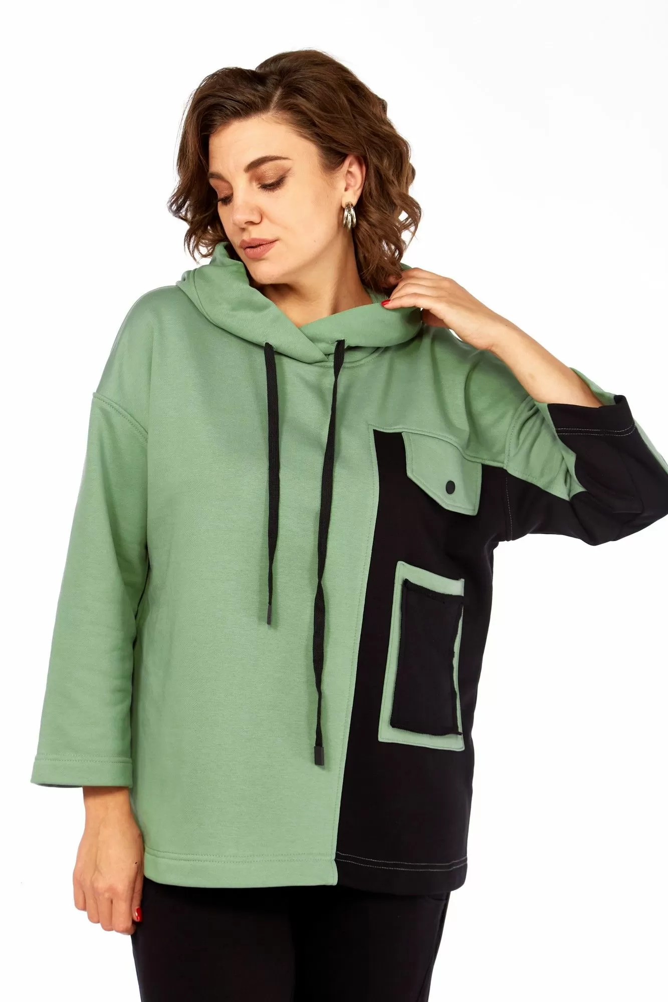 Удобный и практичный повседневный женский комплект в стиле спорт-шик из качественного футера трехнитка. Данная модель состоит из спортивных брюк и объемного худи в сочетании контрастных тканей. Перед ассиметричный с накладным карманом и декоративным клапаном. Горловина оформлена капюшоном. Спинка прямая. Рукав двухшовный со спущенной линией плеча длиной 7/8.