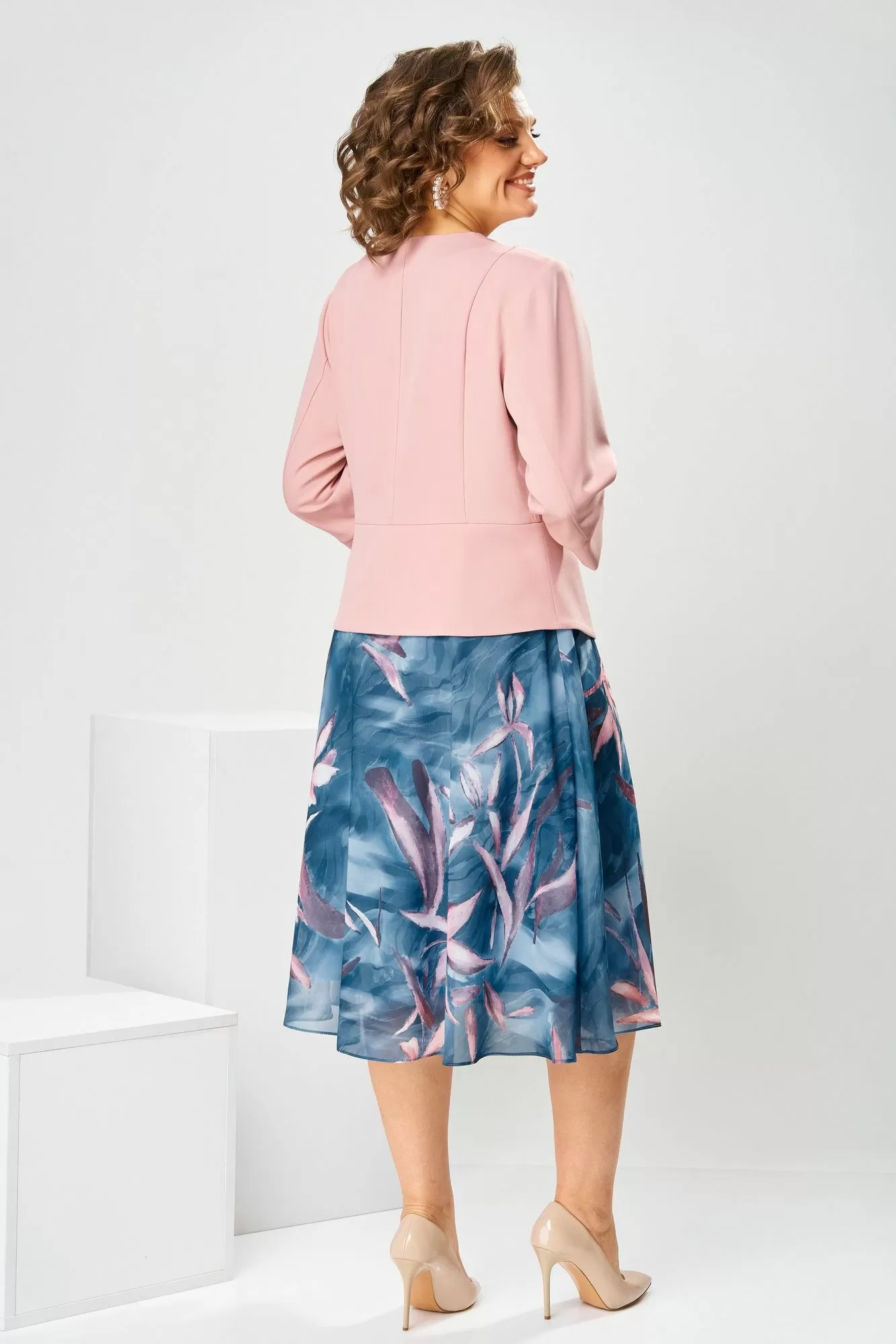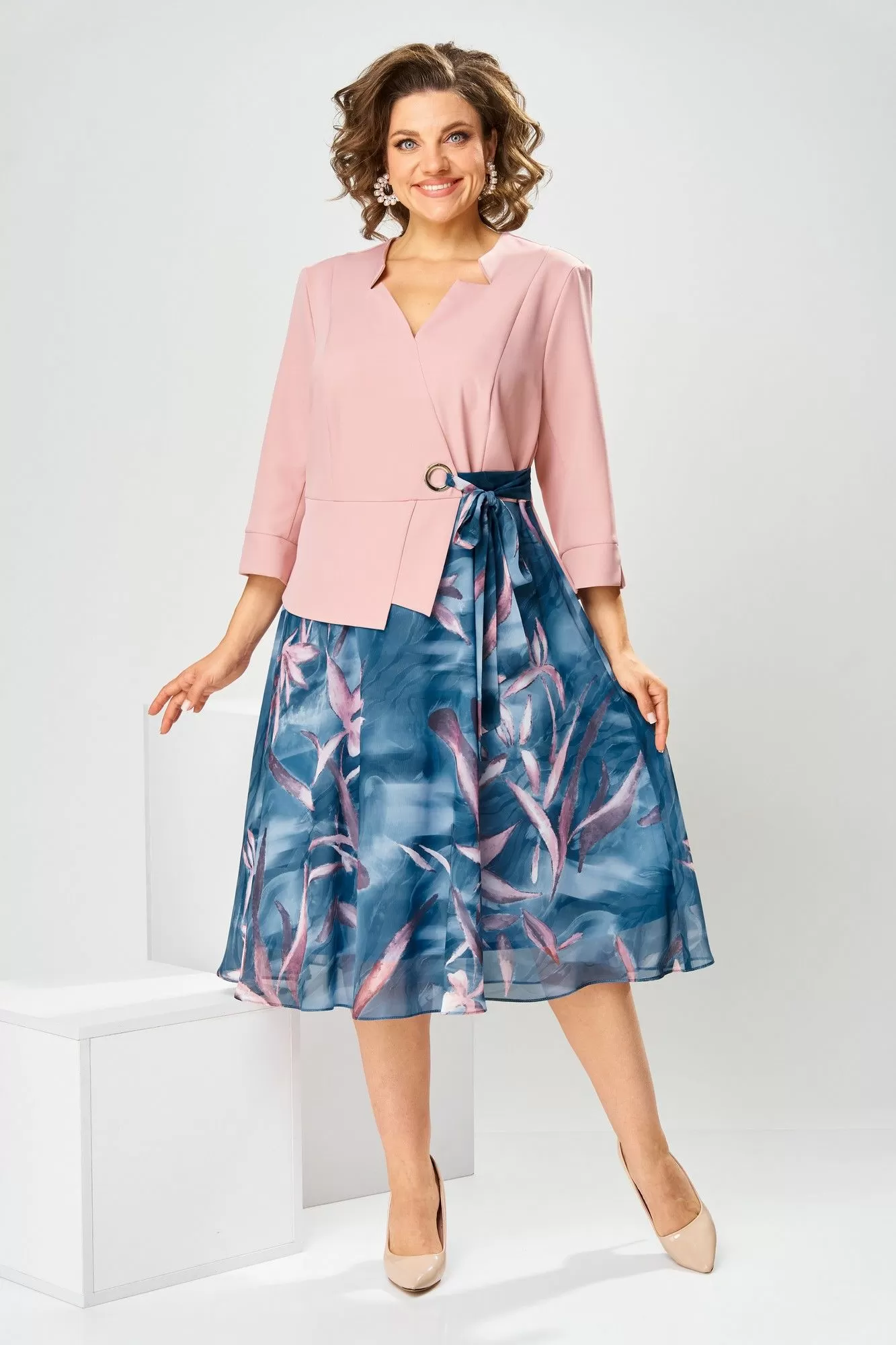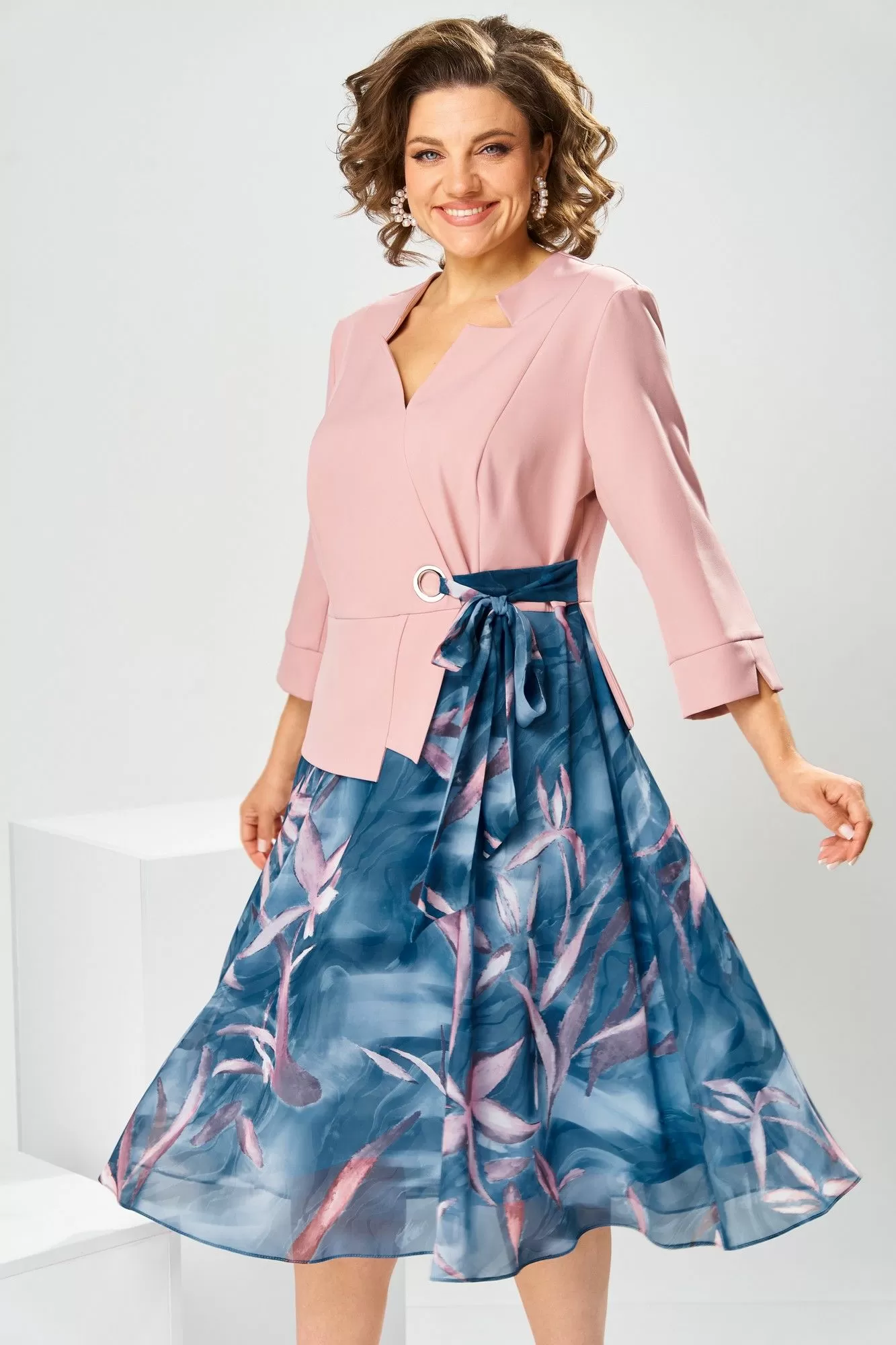 Платье женское относится к нарядной торжественной одежде, но может использовано и при повседневной носке. Платье женское, отрезное по линии талии, расширенное к низу, длиной за колено. Верхняя часть переда с отрезными рельефами, выходящими из плечевых швов, центральная часть с зафиксированным запахом. Верхняя часть спинки со средним швом и 2-мя рельефами, выходящими из плечевых швов. Горловина с V-образным вырезом, фигурная, обточная без воротника. Нижняя часть переда и нижняя часть спинки цельнокроеные, выполнены из отделочной ткани. Шов соединения верхней и нижней частей платья декорирован притачной фигурной отлетной баской. Платье с декоративным поясом из отделочной ткани, закреплённом на левом боковом шве и фиксирующимся в бант через металлическую пробивную блочку на центральной части переда. Рукав одно шовный втачной, длиной до локтя, с притачной фигурной манжетой. Платье с плечевыми накладками. Нижняя часть на подкладке. Длина платья 112 см, длина рукава 33 см.