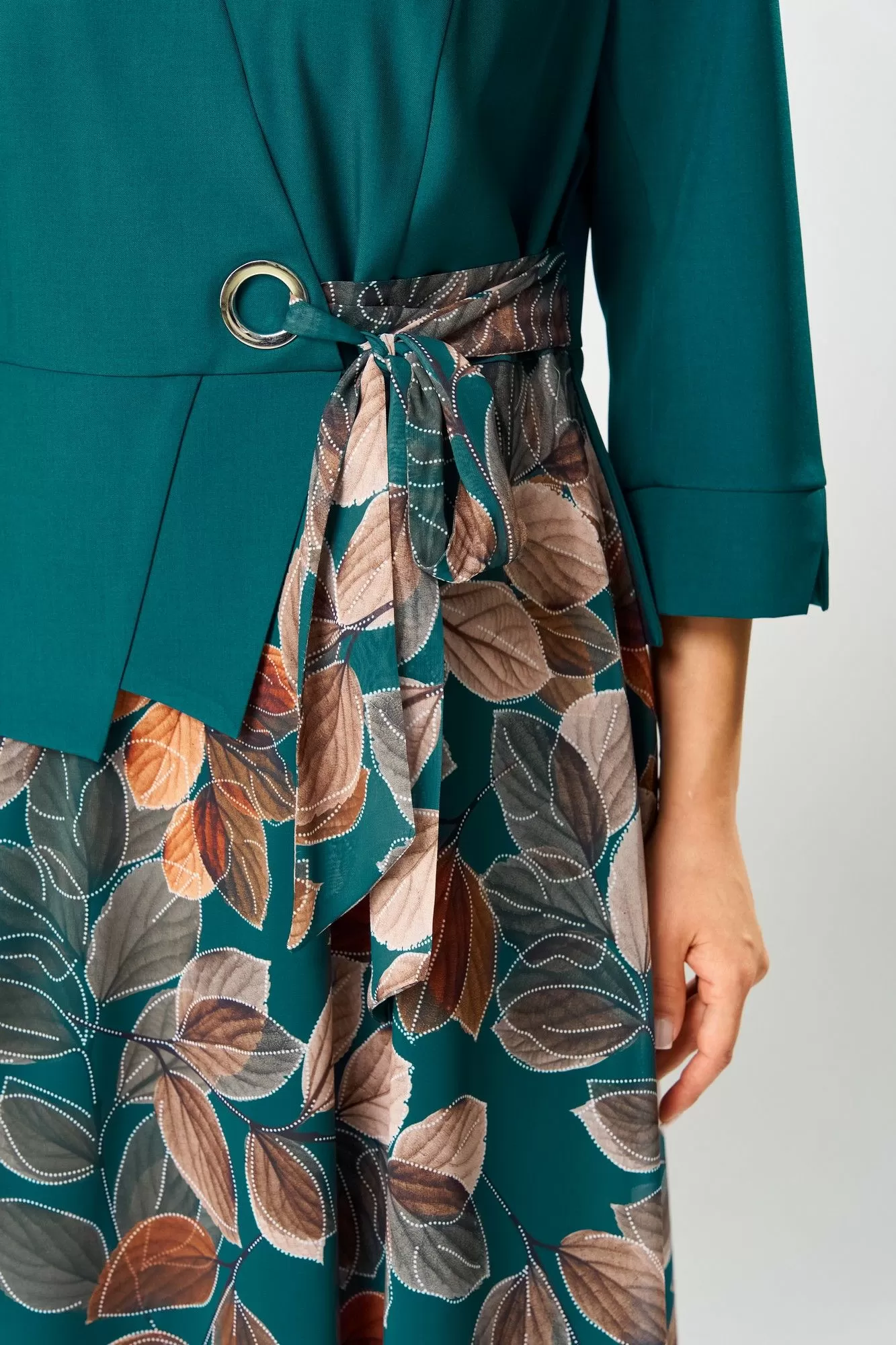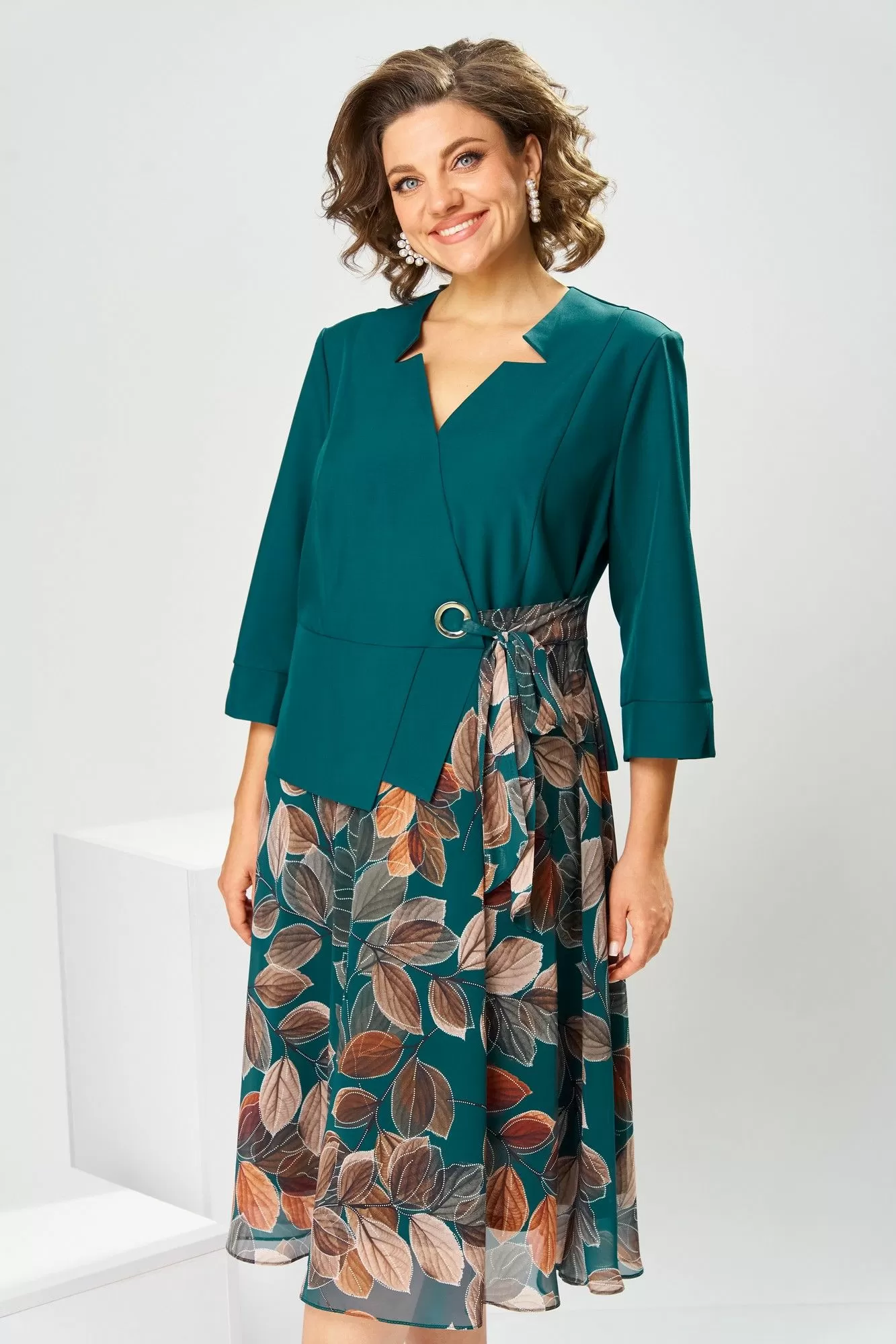 Платье женское относится к нарядной торжественной одежде, но может использовано и при повседневной носке. Платье женское, отрезное по линии талии, расширенное к низу, длиной за колено. Верхняя часть переда с отрезными рельефами, выходящими из плечевых швов, центральная часть с зафиксированным запахом. Верхняя часть спинки со средним швом и 2-мя рельефами, выходящими из плечевых швов. Горловина с V-образным вырезом, фигурная, обточная без воротника. Нижняя часть переда и нижняя часть спинки цельнокроеные, выполнены из отделочной ткани. Шов соединения верхней и нижней частей платья декорирован притачной фигурной отлетной баской. Платье с декоративным поясом из отделочной ткани, закреплённом на левом боковом шве и фиксирующимся в бант через металлическую пробивную блочку на центральной части переда. Рукав одно шовный втачной, длиной до локтя, с притачной фигурной манжетой. Платье с плечевыми накладками. Нижняя часть на подкладке. Длина платья 112 см, длина рукава 33 см.