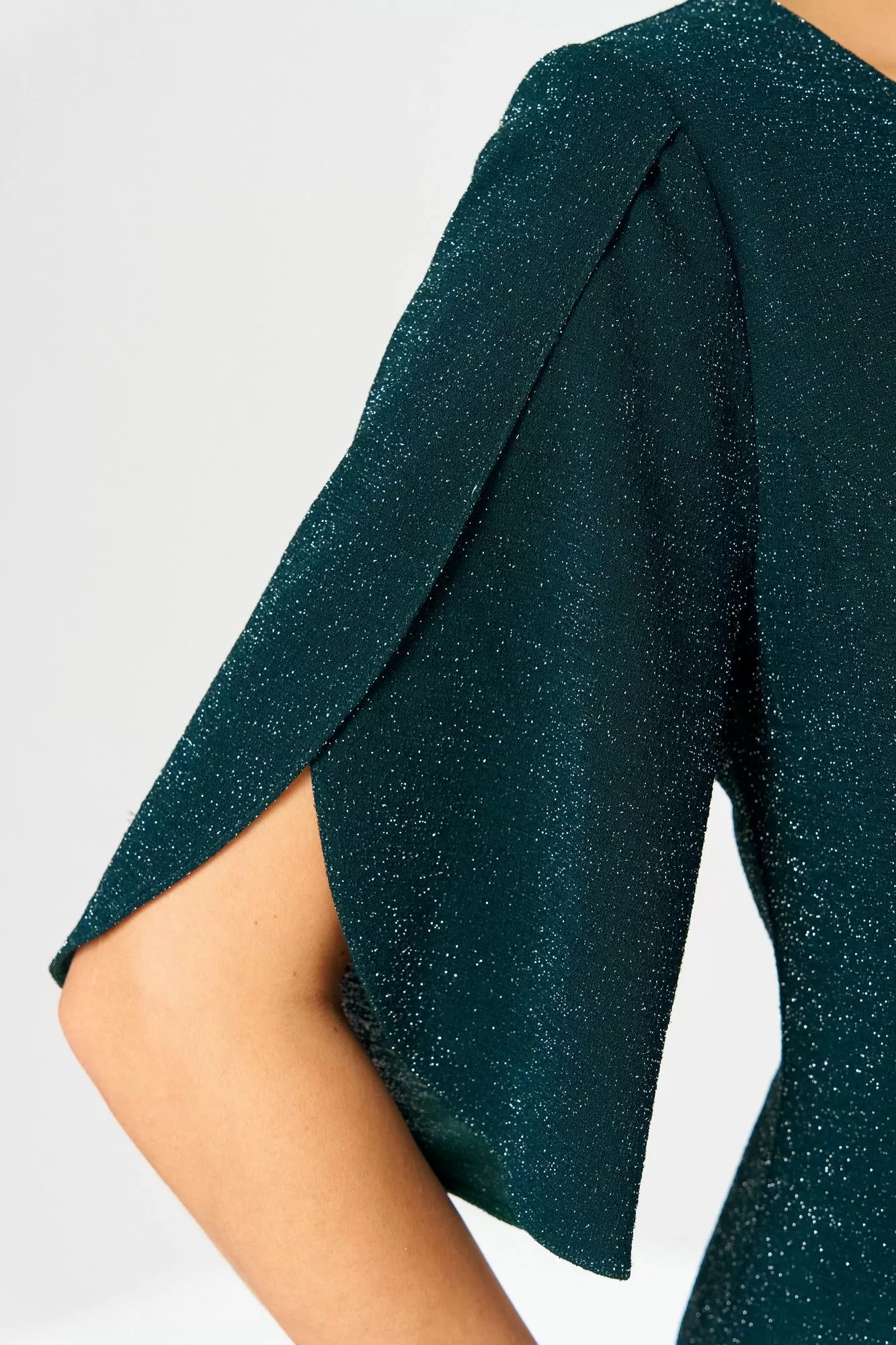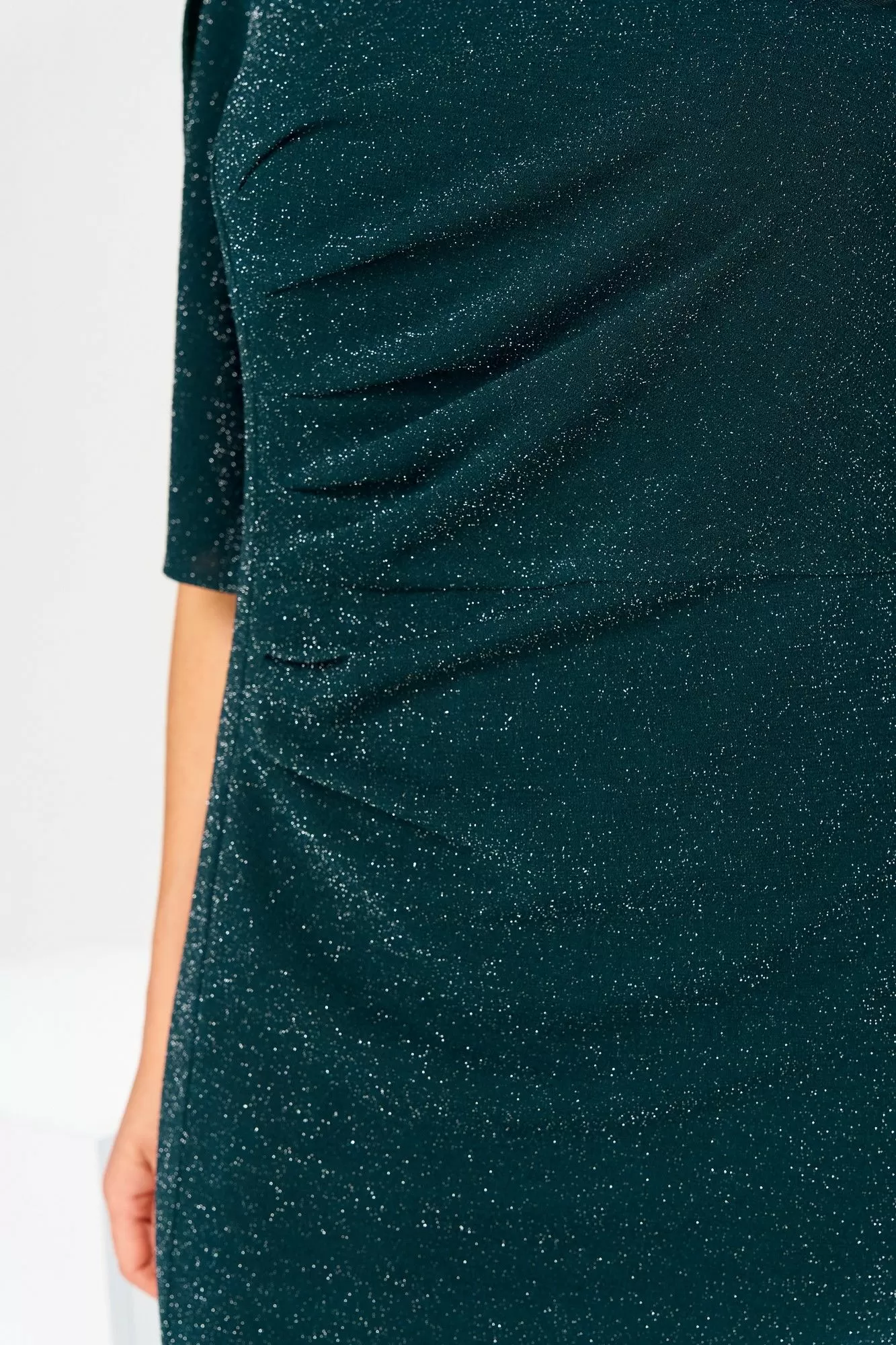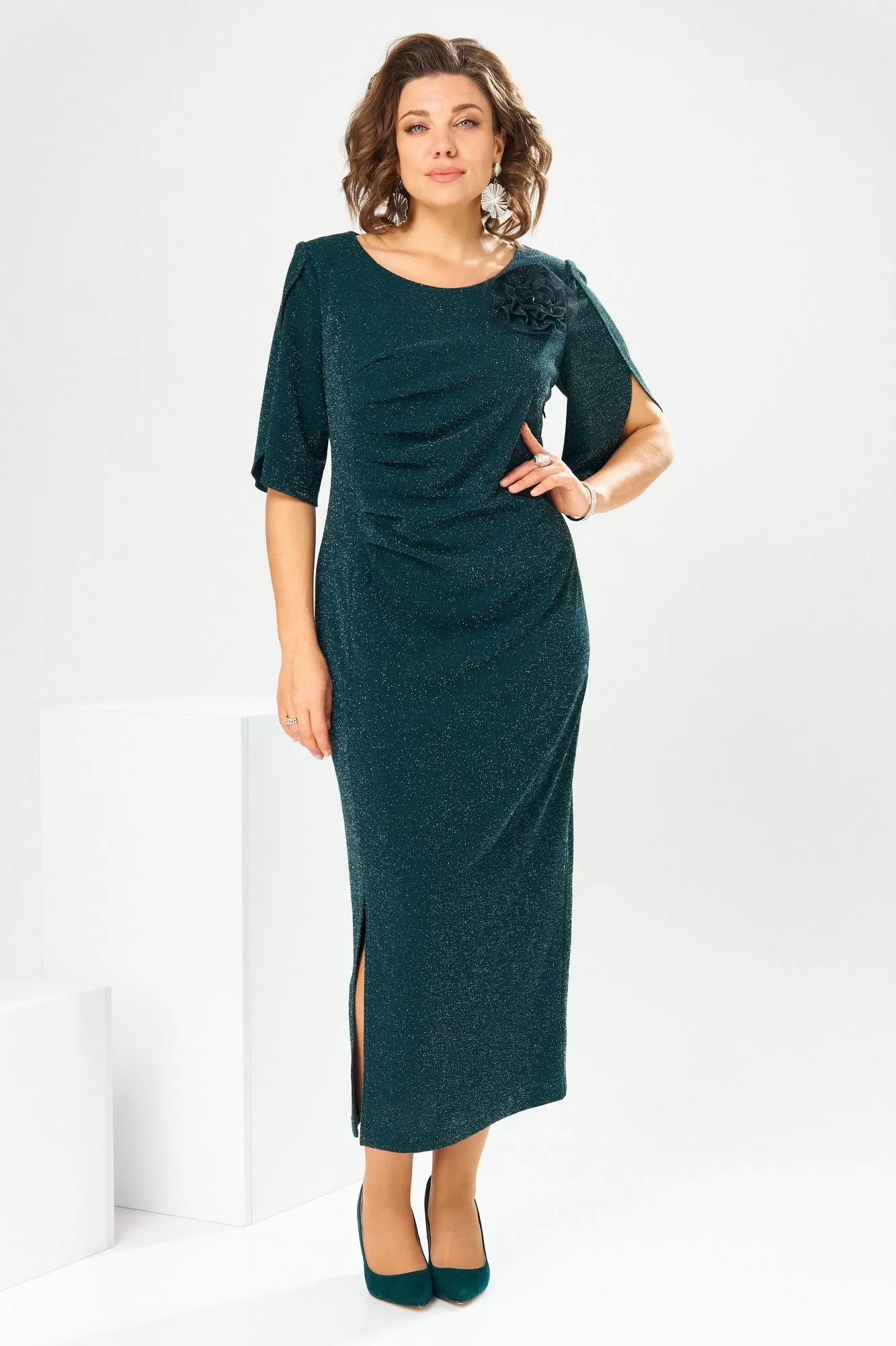 Платье женское, предназначено к нарядной торжественной одежде. Платье женское, полу прилегающего силуэта, длиной до нижней части икры. Перед с 1-ним отрезным бочком справа, шов соединения его с передом заканчивается разрезом, перед отрезной по линии талии, верхняя часть с 4-мя зафиксированными складками, нижняя часть с 2-мя такими же складками расположенными справа по шву притачивания бочка. Спинка с 2-мя таллиевыми вытачками. Горловина круглая обточная без воротника. Застёжка на потайную тесьму-молнию в левом боковом шве платья. Рукав втачной, длиной до локтя с запахом по окату с закруглёнными концами. Платье на подкладке. Платье с плечевыми накладками. К платью прилагается съёмное украшение. Длина платья 128 см. Длина рукава 34 см.