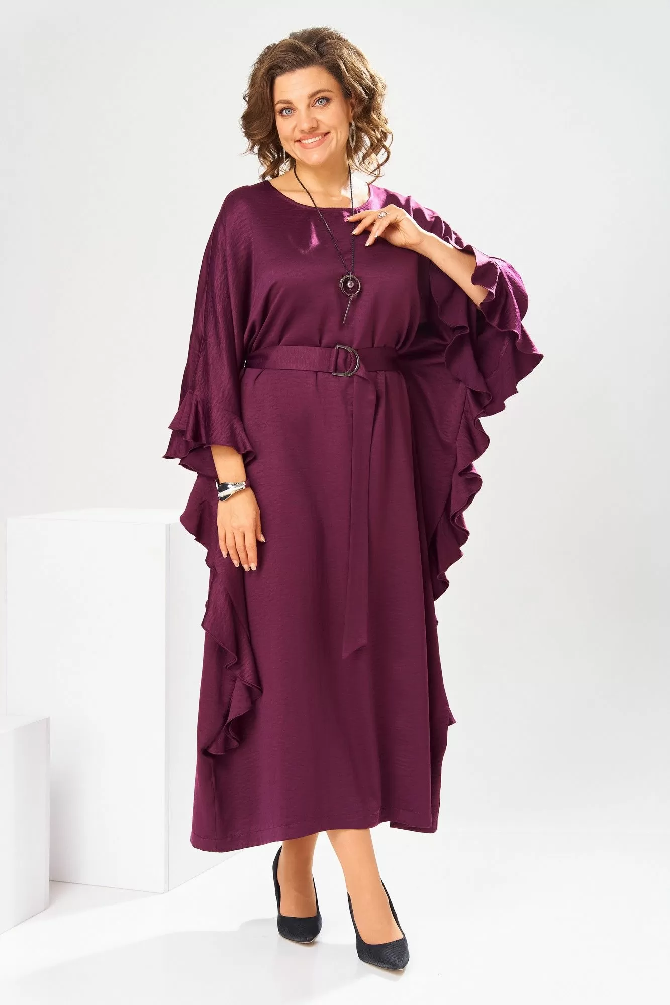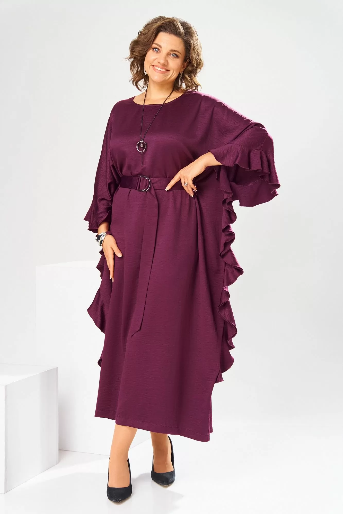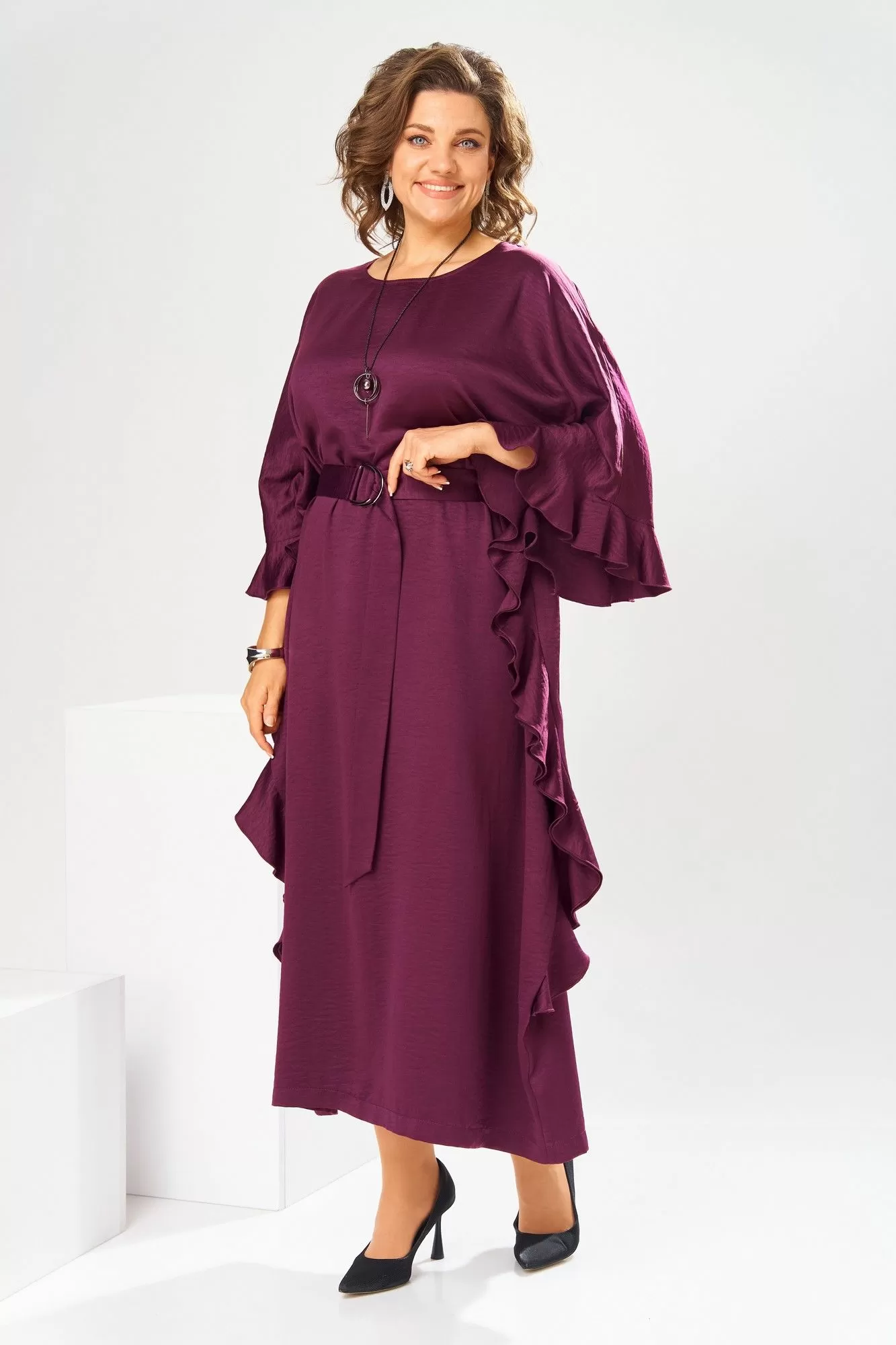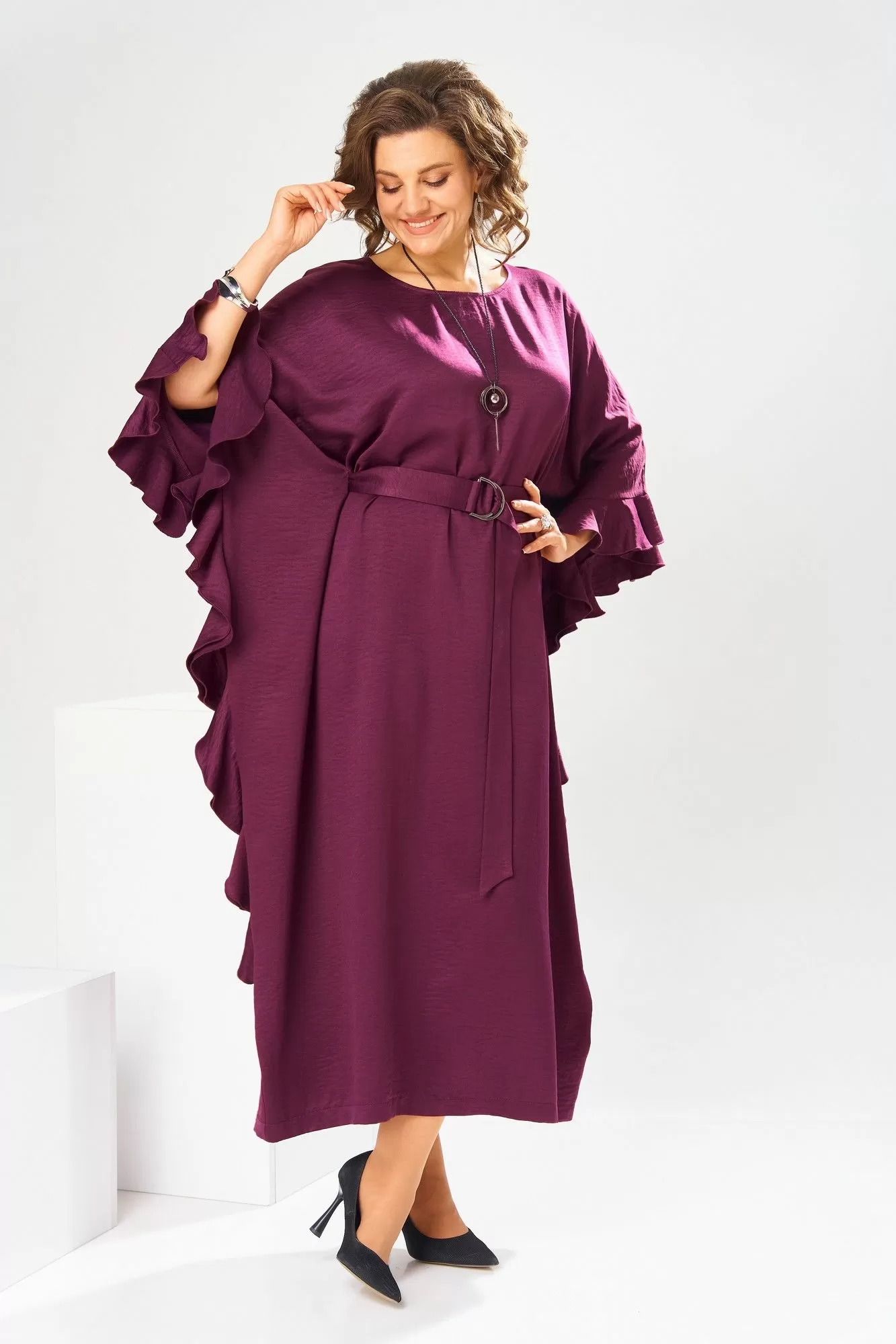 Платье женское, относится к нарядной торжественной одежде. Платье пончо свободного кроя, длинное. Перед цельнокроеный. Спинка со средним швом, вверху с разрезом, фиксирующимся по горловине на 1-ну навесную петлю и 1-ну пришивную пуговицу. Горловина круглая, обточная, без воротника, по переду горловины отделочная строчка 0,6 см. Рукав цельнокроеный удлинённый. Низ рукава и боковые швы декорированы приточной оборкой. По боковым швам зафиксирован уровень пройм и место расположения петель на уровне линии талии отделочными строчками. К платью прилагается съёмный пояс с пряжкой, фиксируемые на платье в петли на уровне линии талии. Платье без плечевых накладок. Длина спинки платья 132 см, ширина на уровне глубины проймы 66 см, ширина по линии талии 66 см, ширина плеча+длина рукава 56,5 см.