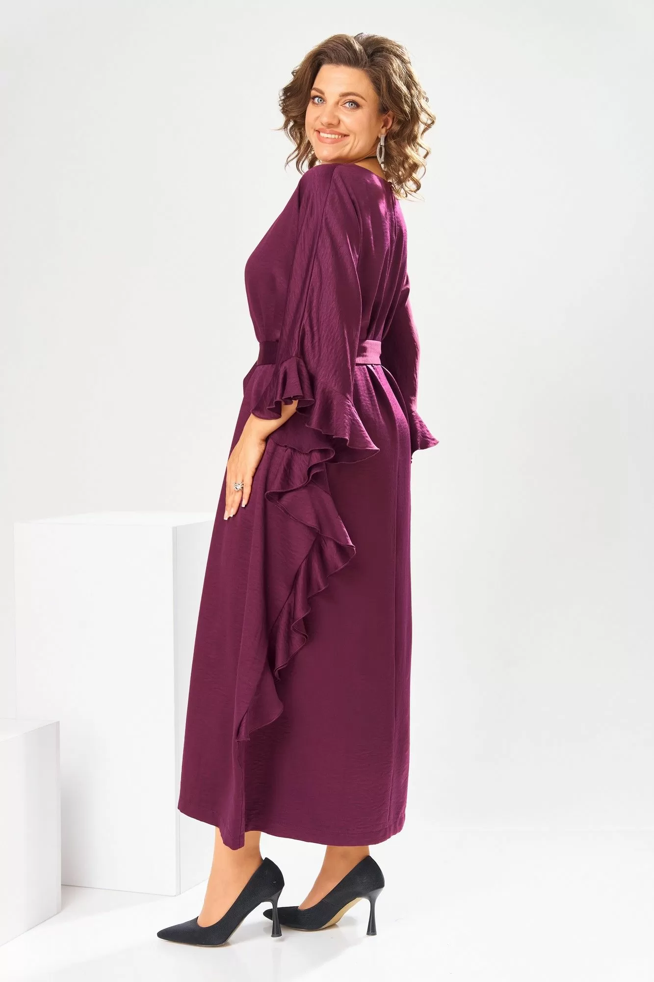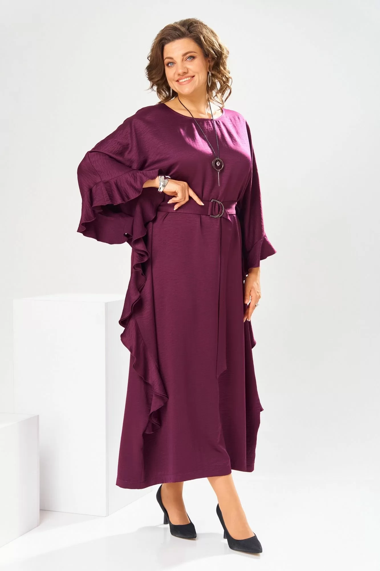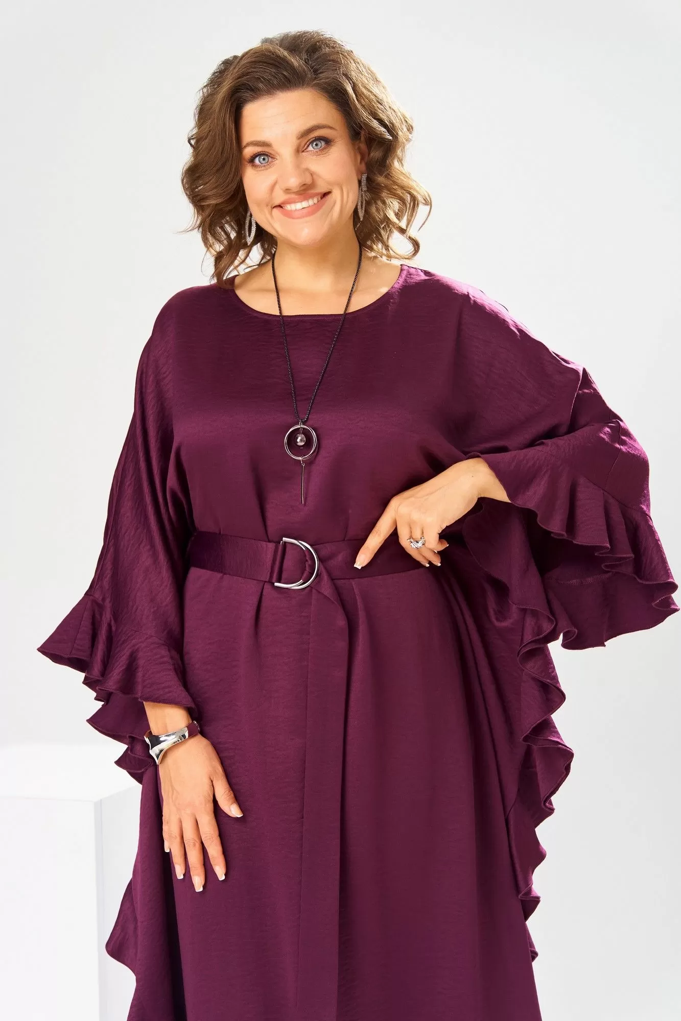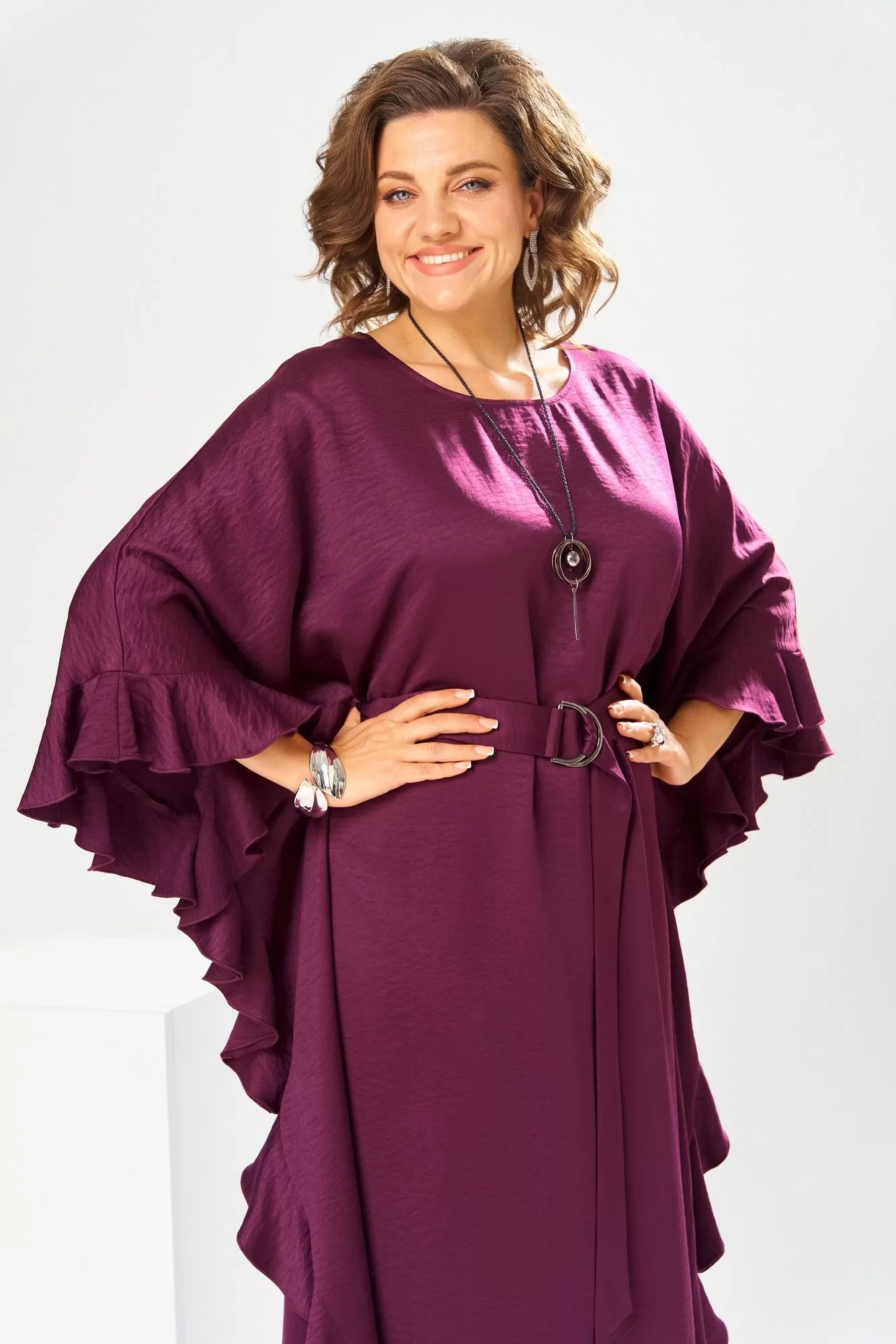 Платье женское, относится к нарядной торжественной одежде. Платье пончо свободного кроя, длинное. Перед цельнокроеный. Спинка со средним швом, вверху с разрезом, фиксирующимся по горловине на 1-ну навесную петлю и 1-ну пришивную пуговицу. Горловина круглая, обточная, без воротника, по переду горловины отделочная строчка 0,6 см. Рукав цельнокроеный удлинённый. Низ рукава и боковые швы декорированы приточной оборкой. По боковым швам зафиксирован уровень пройм и место расположения петель на уровне линии талии отделочными строчками. К платью прилагается съёмный пояс с пряжкой, фиксируемые на платье в петли на уровне линии талии. Платье без плечевых накладок. Длина спинки платья 132 см, ширина на уровне глубины проймы 66 см, ширина по линии талии 66 см, ширина плеча+длина рукава 56,5 см.