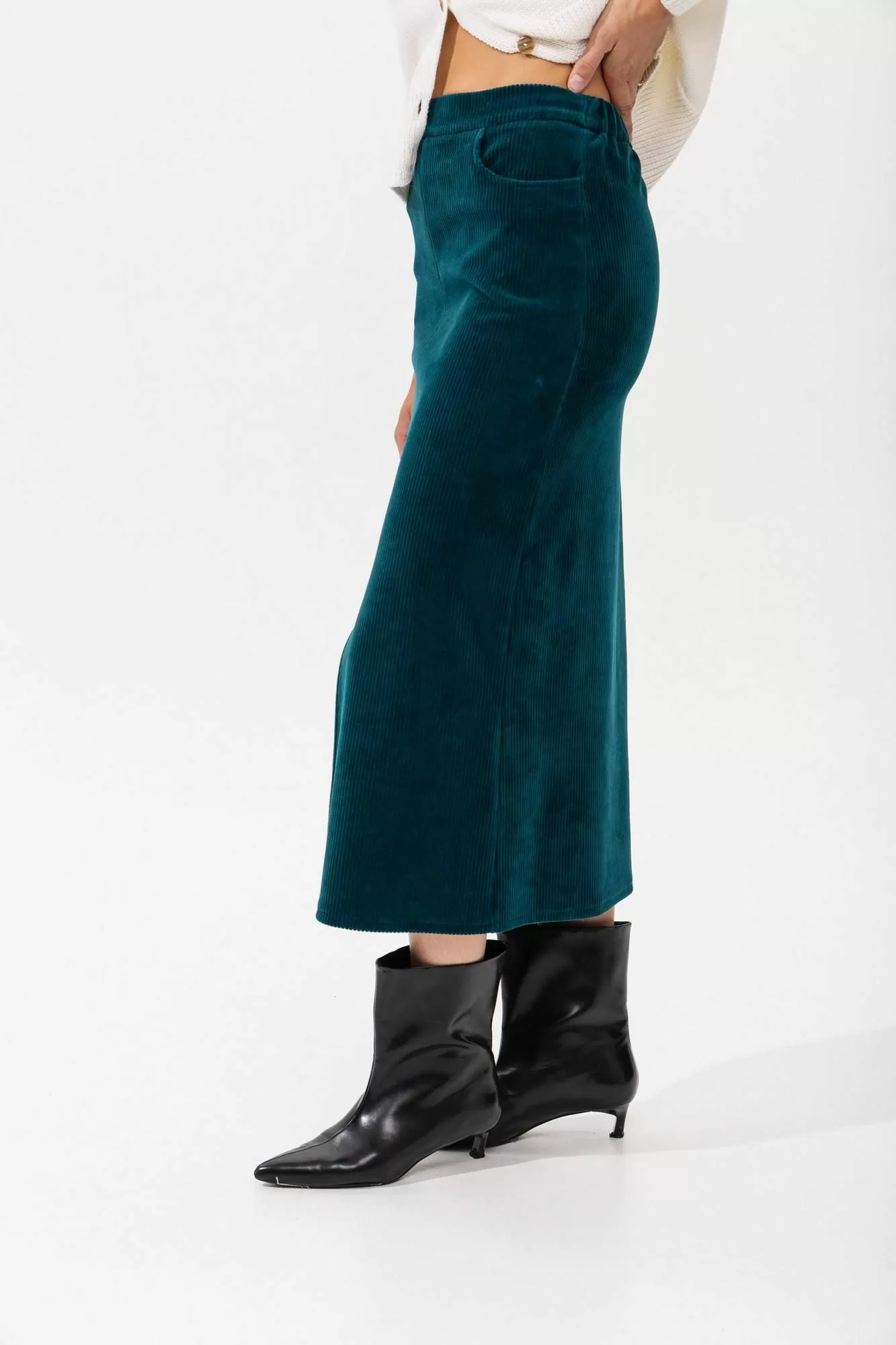 Фасон: Классическая юбка-карандаш с небольшим разрезом спереди, что придаёт ей современный и женственный вид.