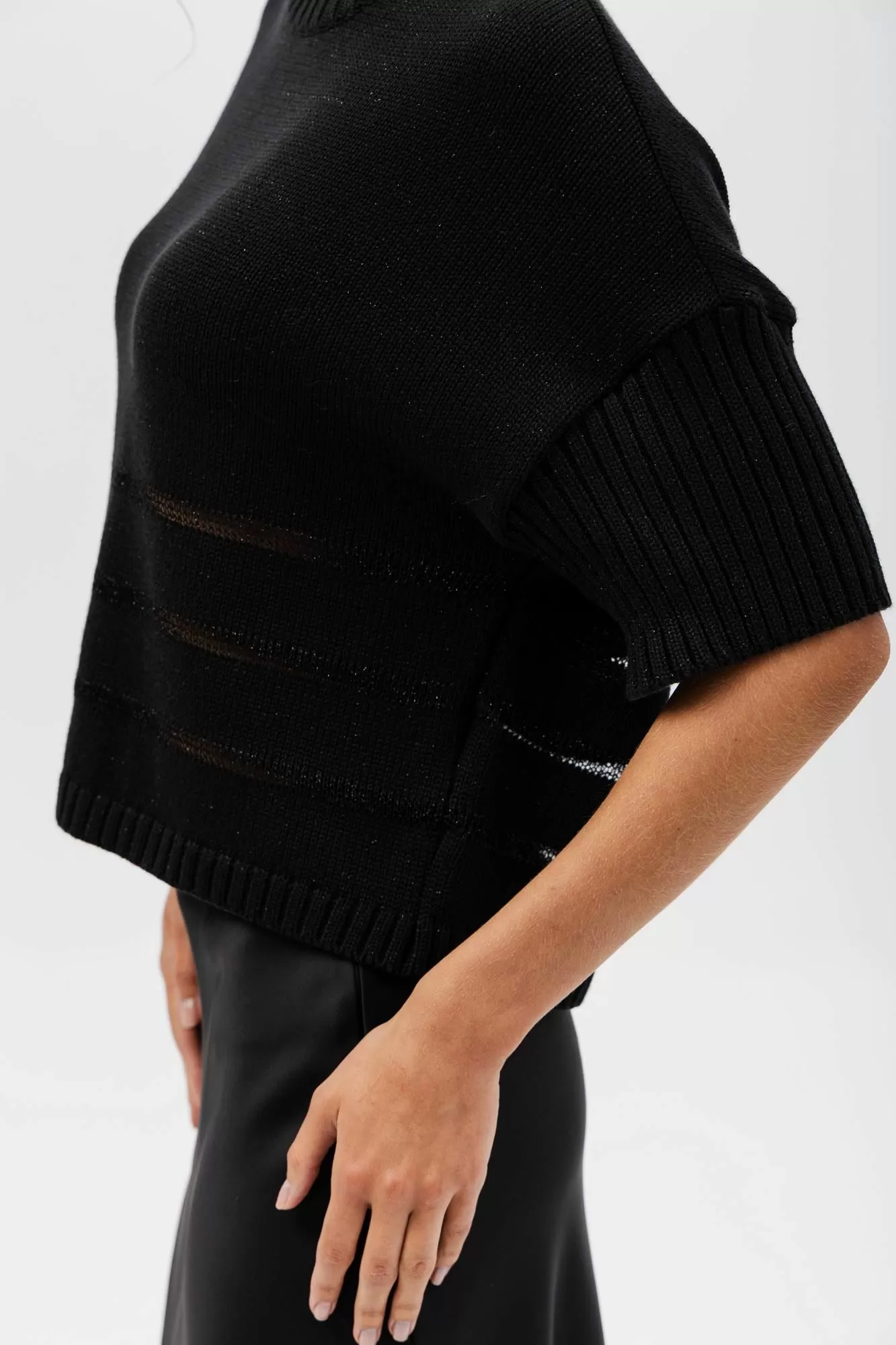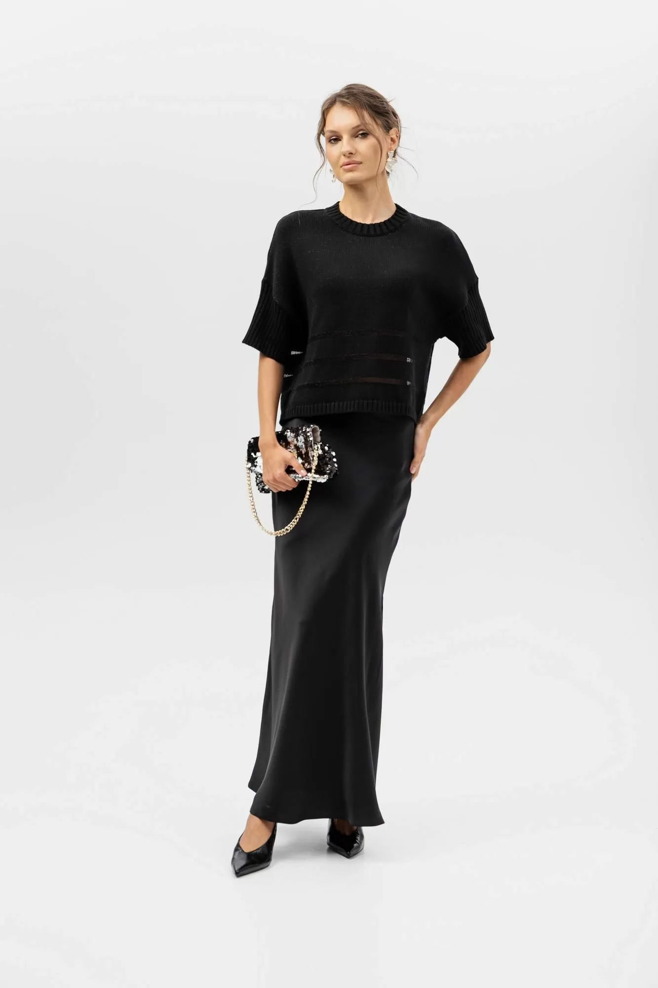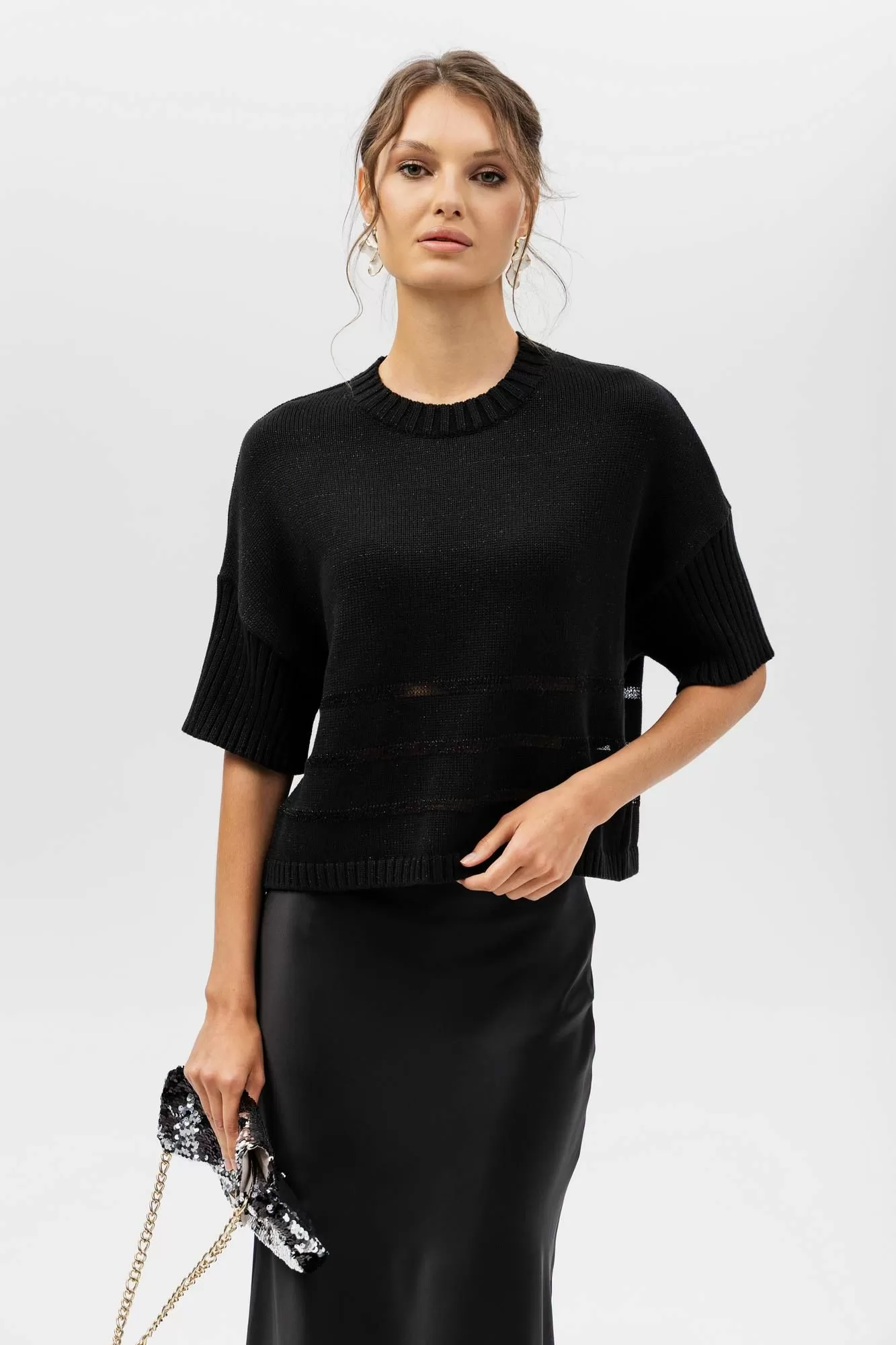 Дизайн: укороченный крой с короткими рукавами и оригинальными ажурными вставками на уровне талии, добавляющими изюминку и лёгкость образу;
