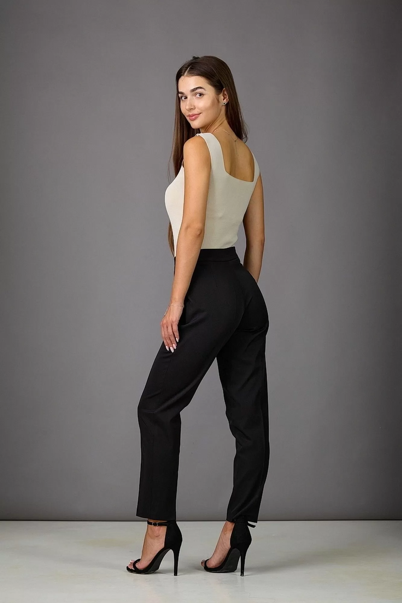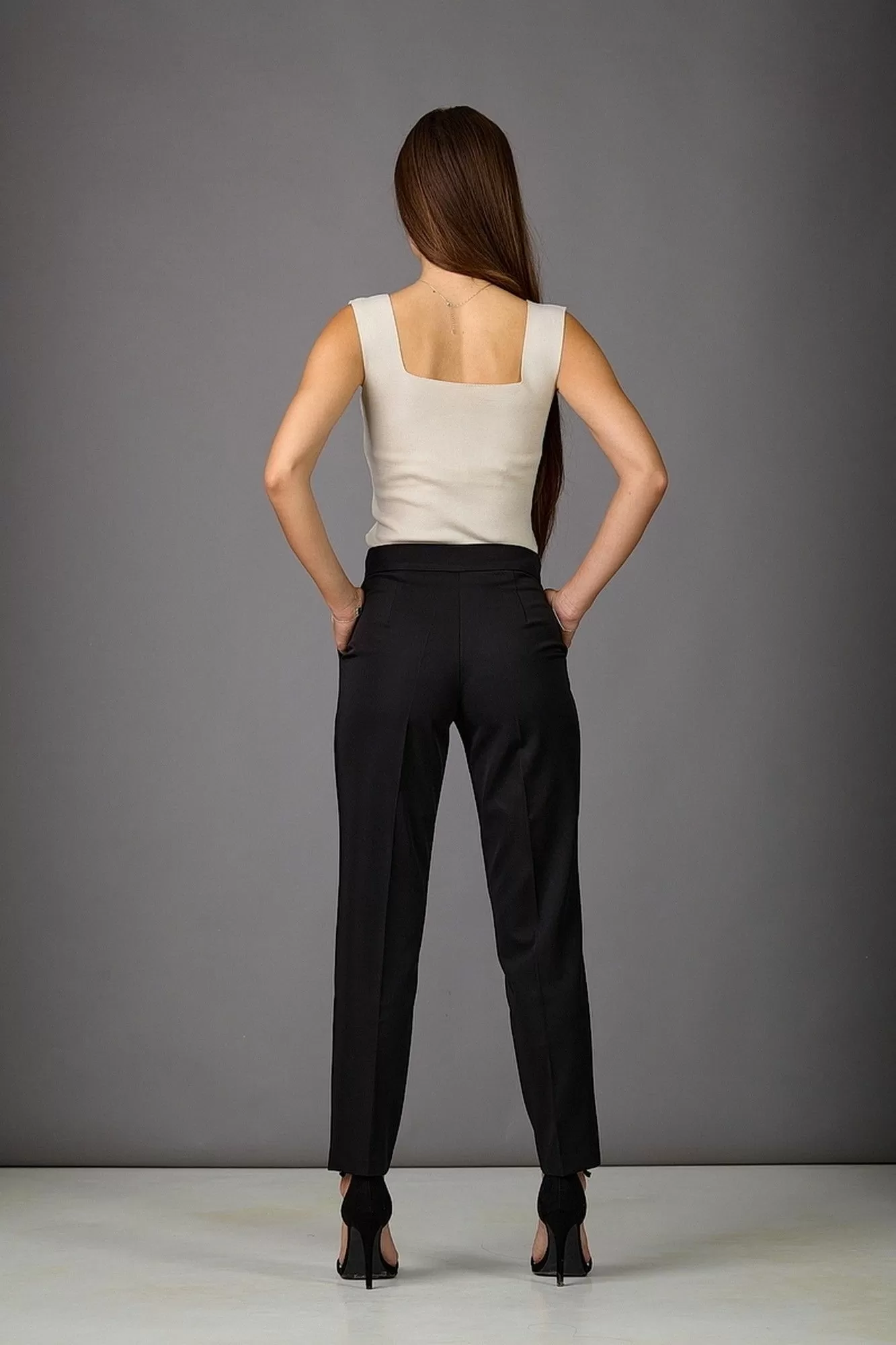 Брюки женские из костюмной ткани. Посадка- средняя. Слегка заужены к низу, с наклонными карманами и регулируемым резинкой поясом. Застегиааются на молнию по переду и одну пуговицу.