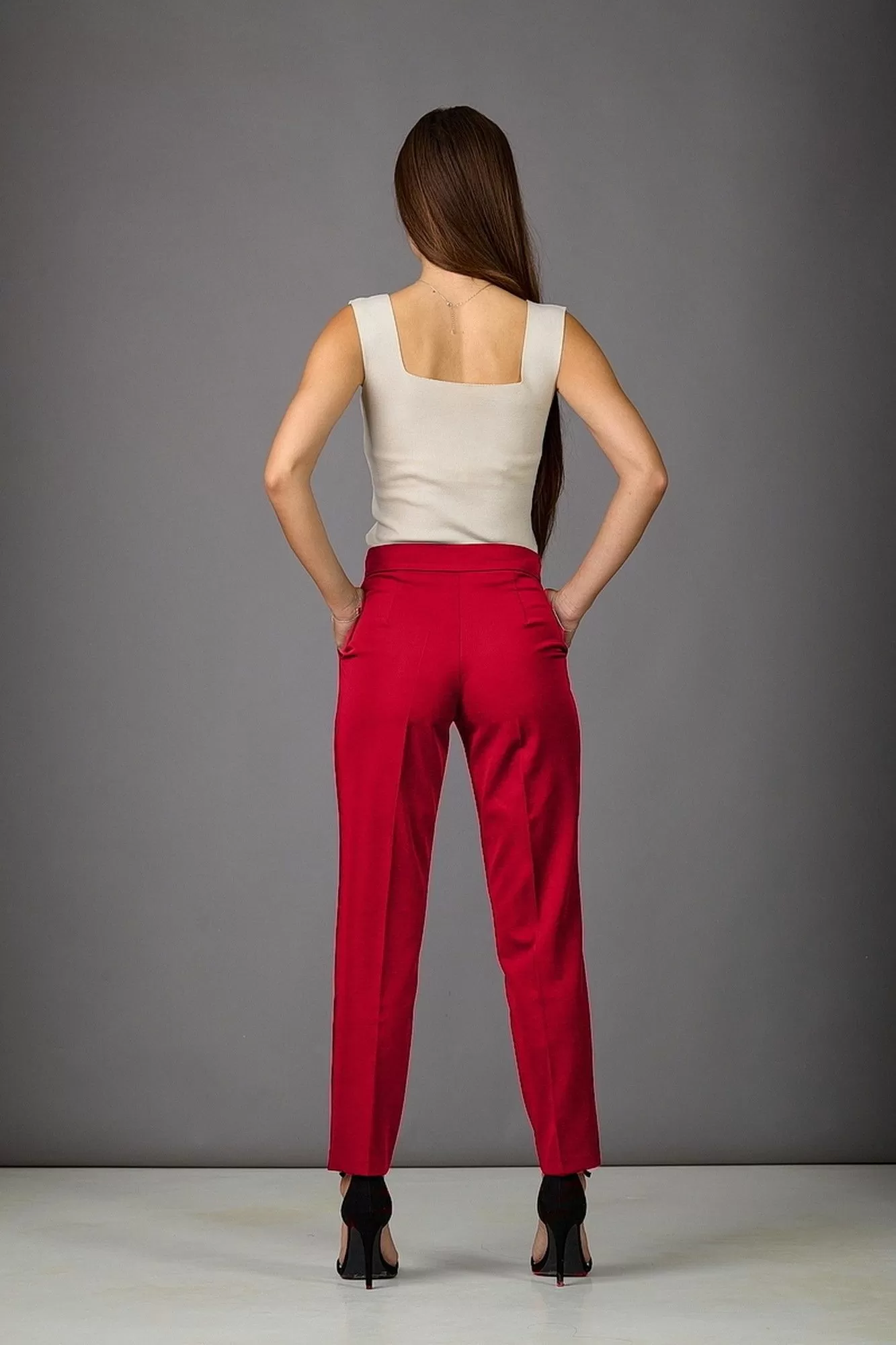 Брюки женские из костюмной ткани. Посадка- средняя. Слегка заужены к низу, с наклонными карманами и регулируемым резинкой поясом. Застегиааются на молнию по переду и одну пуговицу.