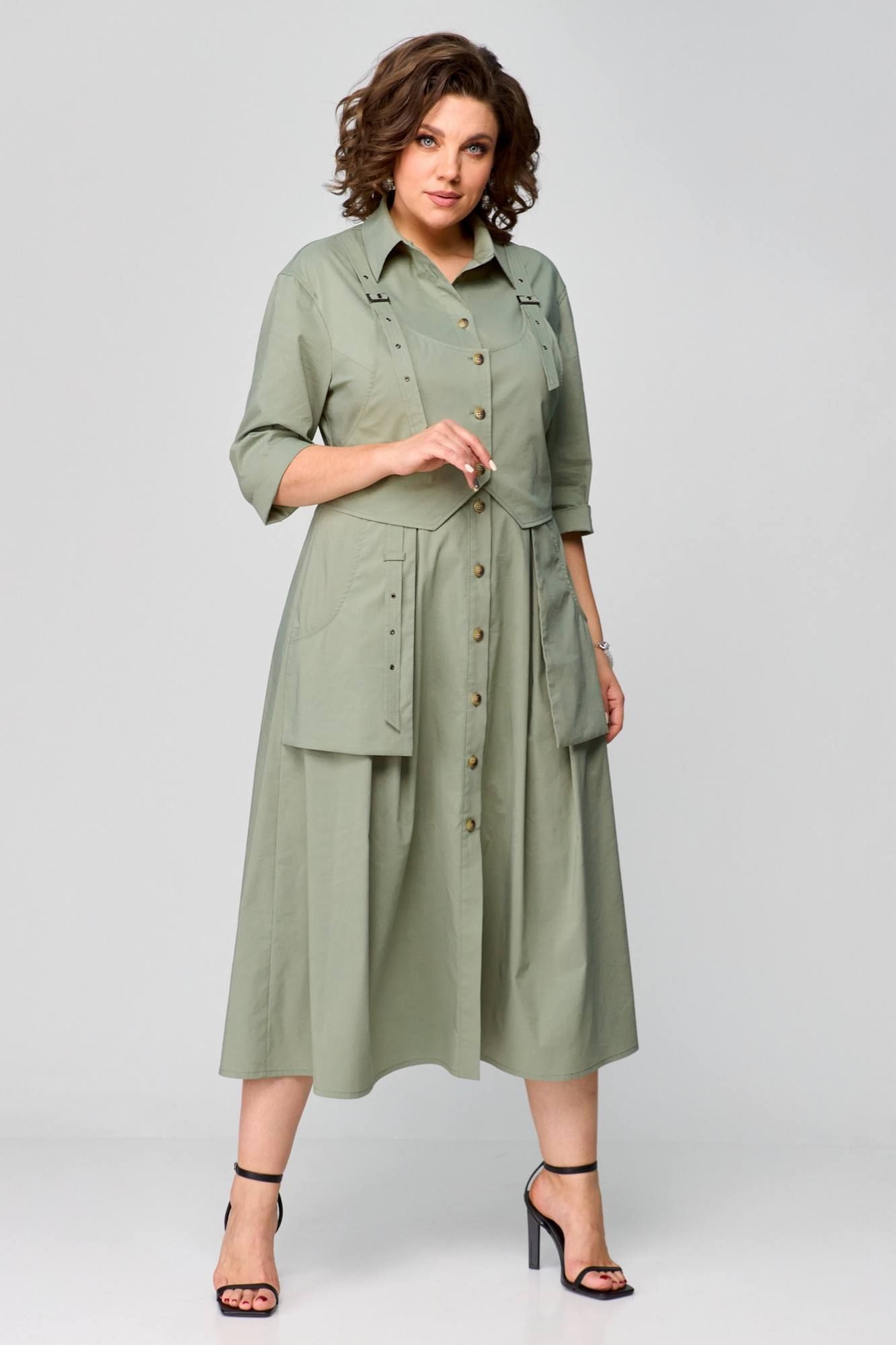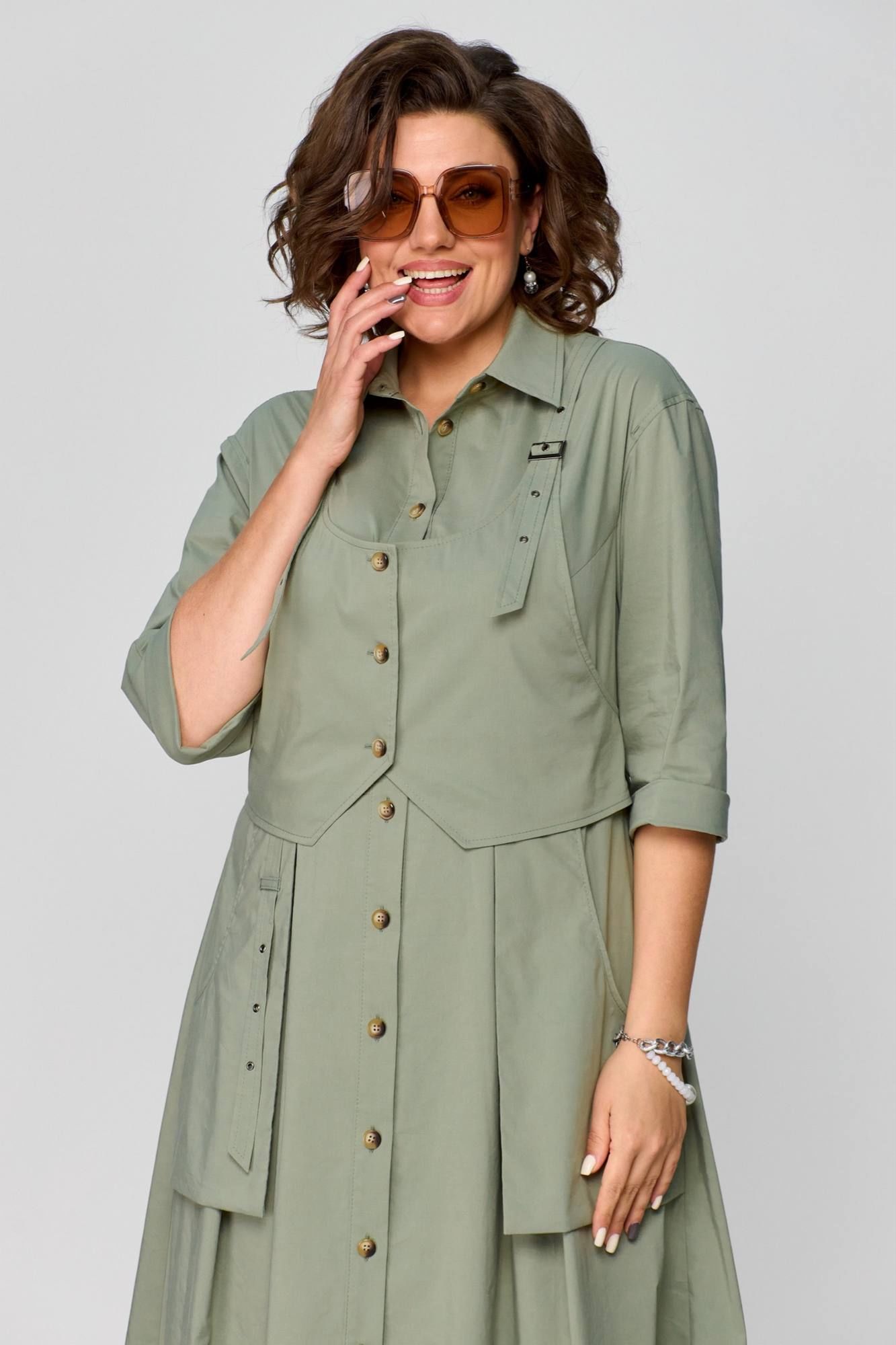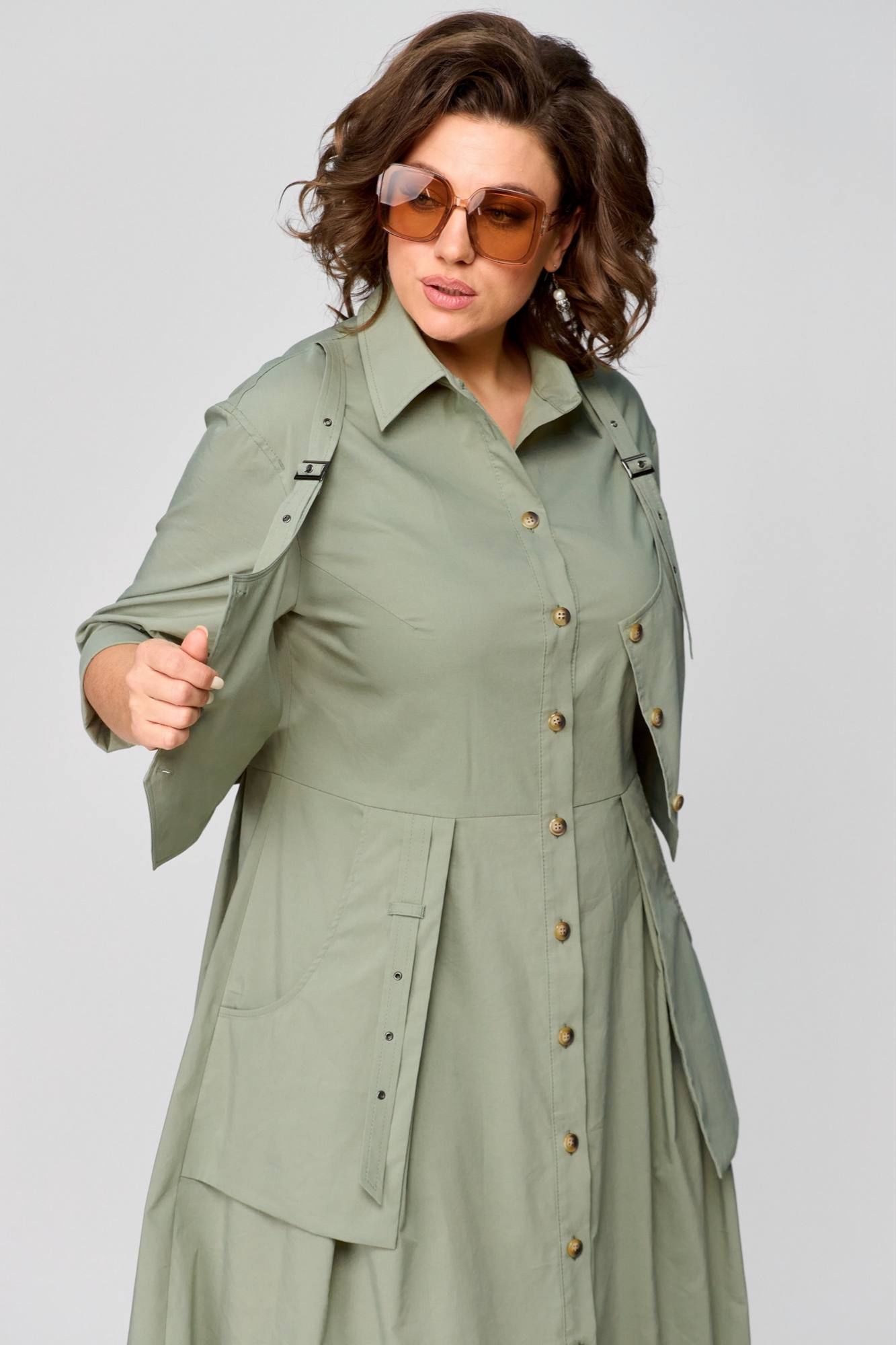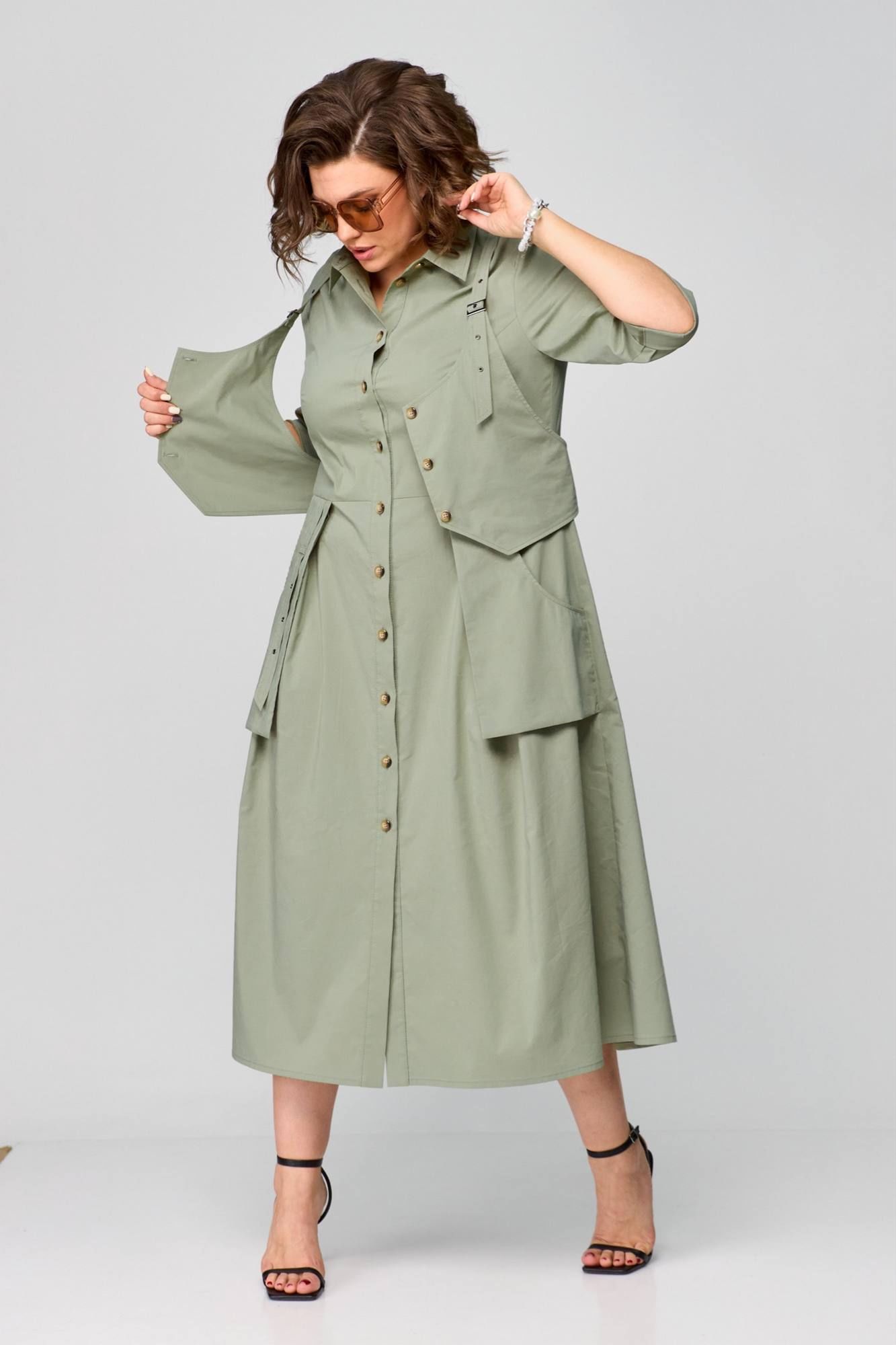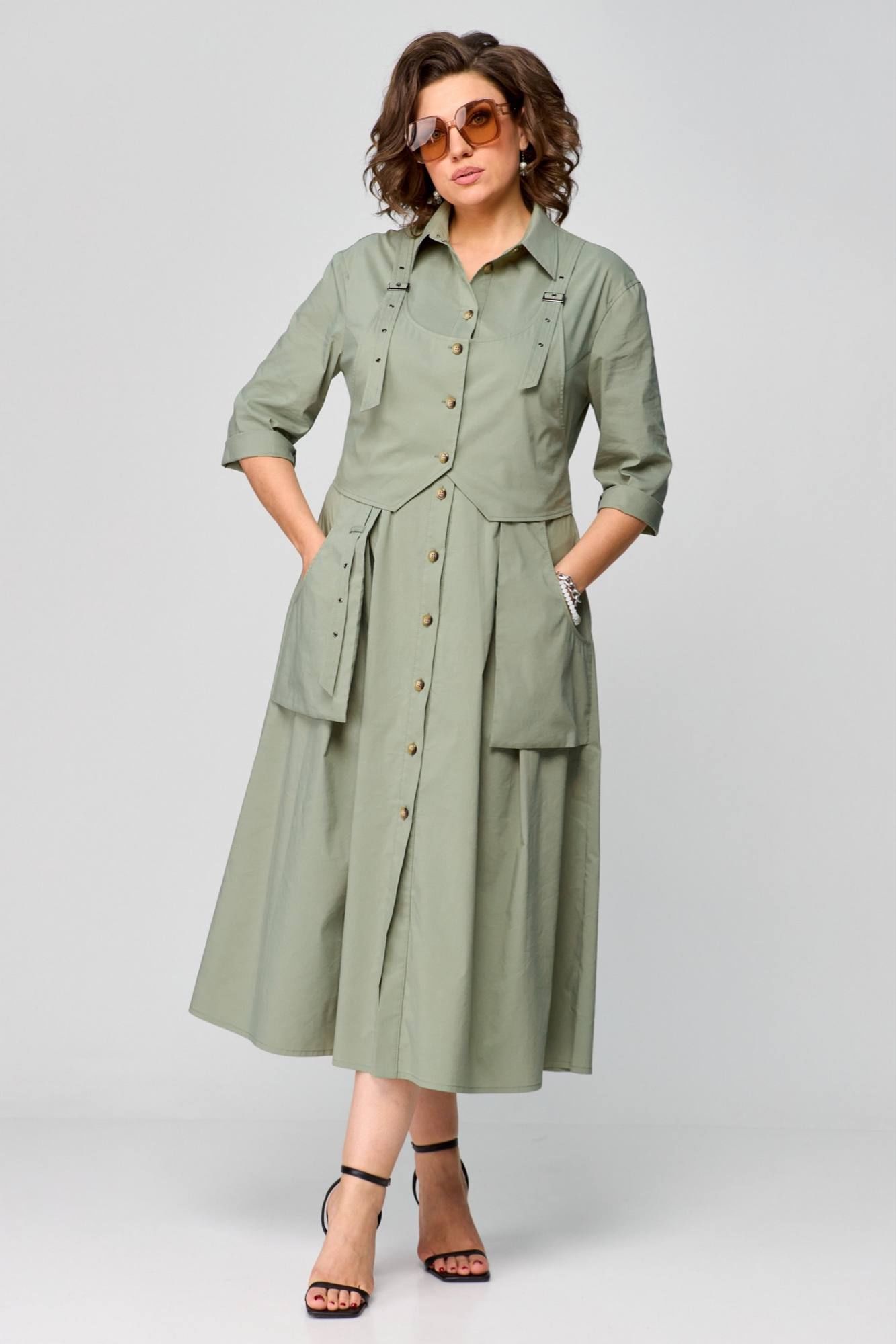 Платье в стиле Сафари, в натуральном цвете оливка, оригинальный фасон, выполнено из хлопка. Сочетает в себе оригинальность, практичность и простоту. Приталенный силуэт с центральнобортовой застежкой на планку. Воротник рубашечный, отложной. Рукав втачной одношовный, 3/4 с отворотом. Спинка с кокеткой. Отлетные рабочие карманы. Нижняя часть платья с глубокими складками в области талии. Платье дополняется деталью в виде жилета( он съемный ). Длина платья 125 см.