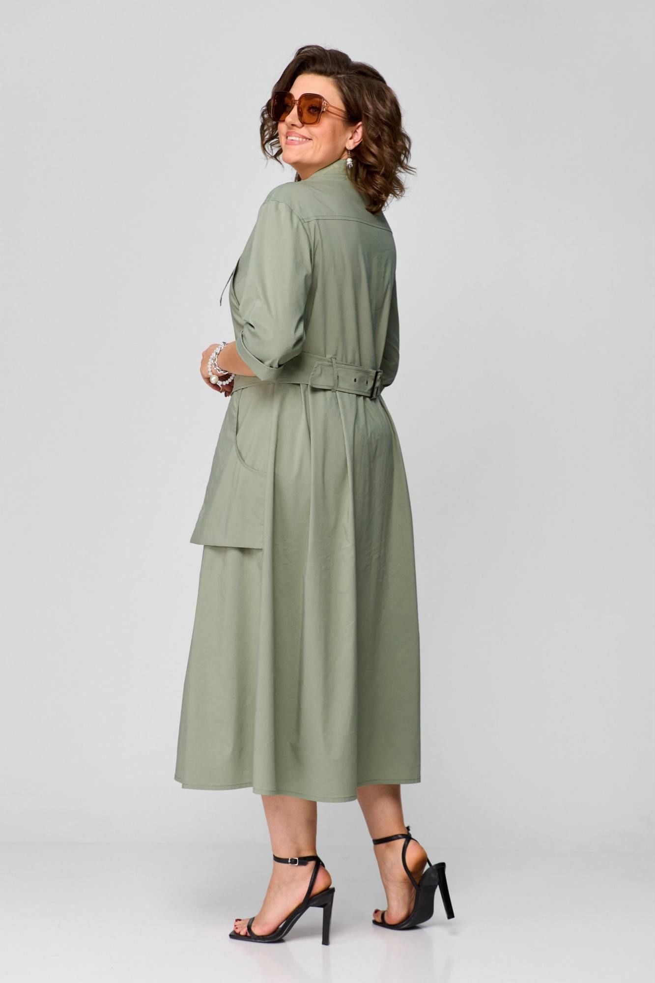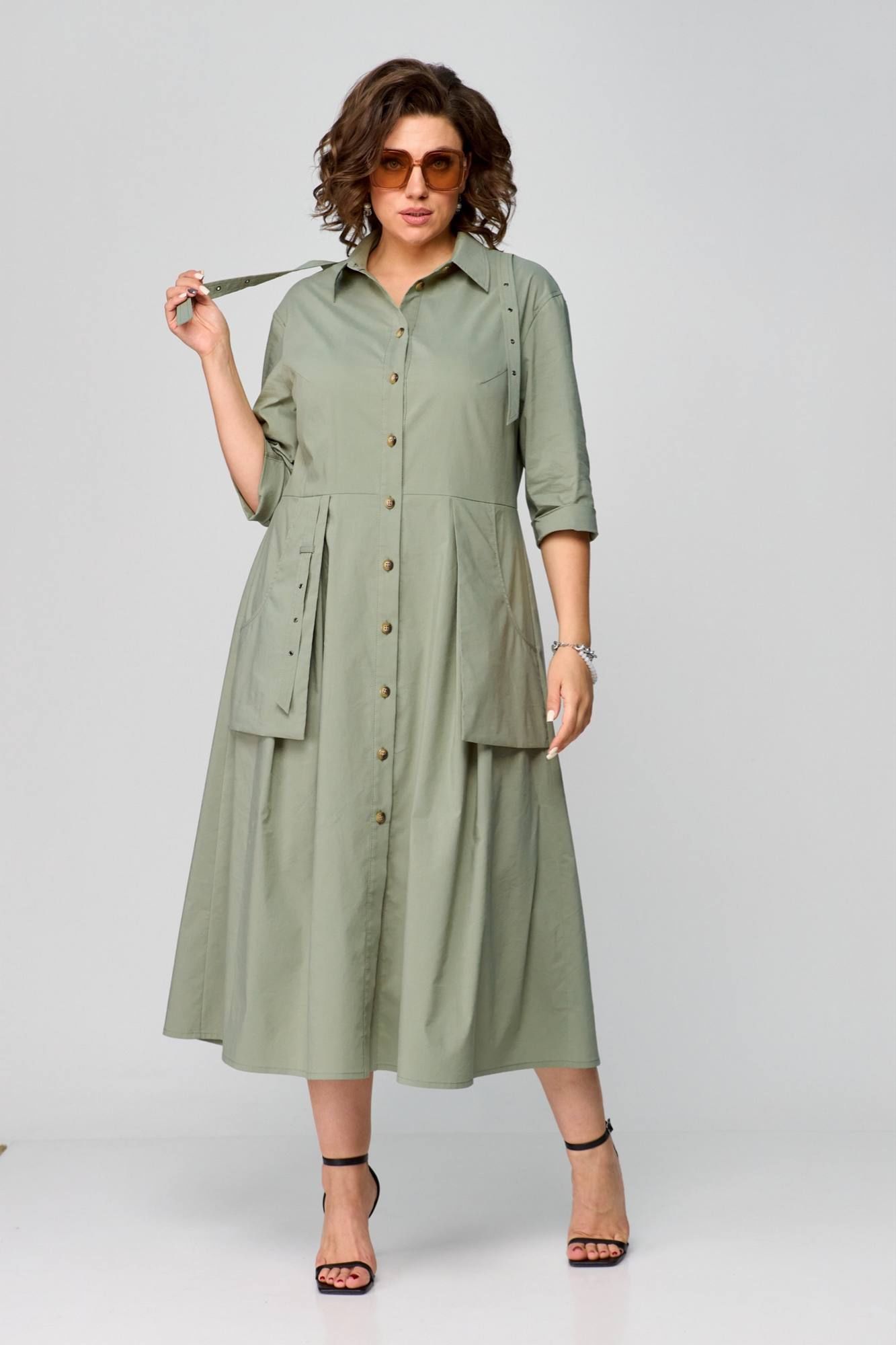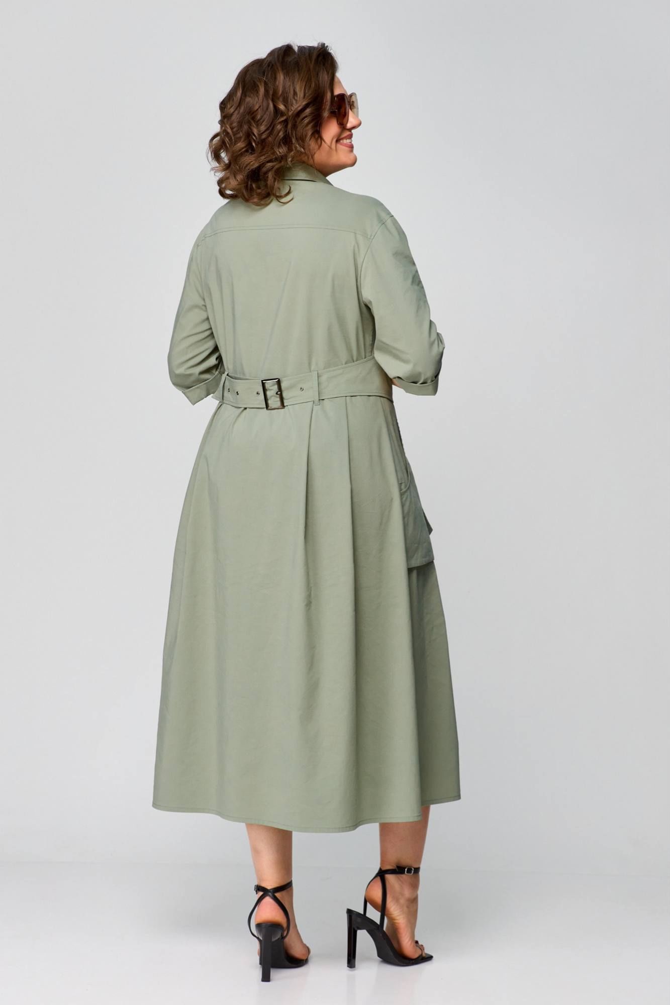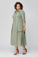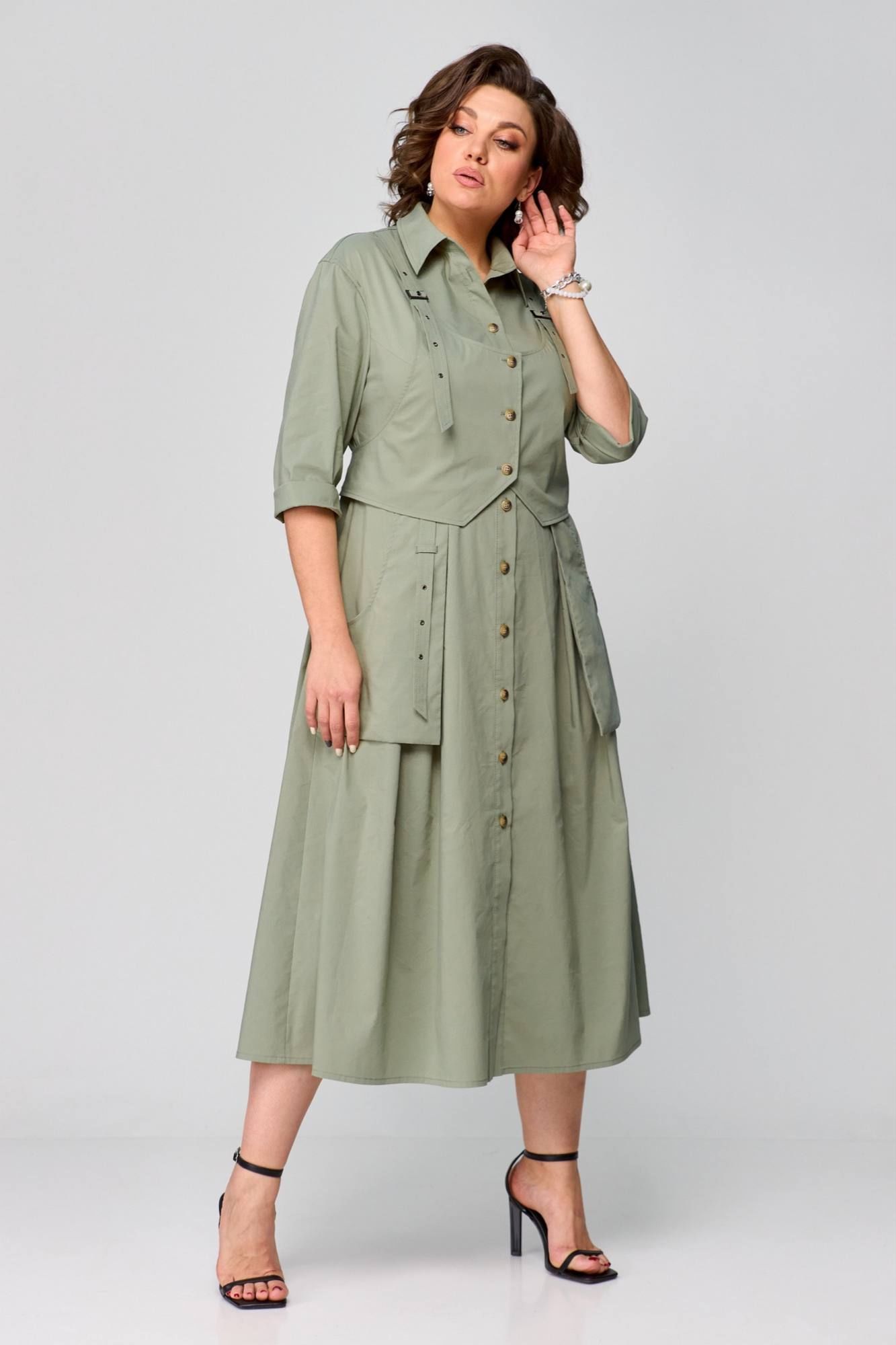 Платье в стиле Сафари, в натуральном цвете оливка, оригинальный фасон, выполнено из хлопка. Сочетает в себе оригинальность, практичность и простоту. Приталенный силуэт с центральнобортовой застежкой на планку. Воротник рубашечный, отложной. Рукав втачной одношовный, 3/4 с отворотом. Спинка с кокеткой. Отлетные рабочие карманы. Нижняя часть платья с глубокими складками в области талии. Платье дополняется деталью в виде жилета( он съемный ). Длина платья 125 см.