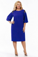 Нарядное платье полуприлегающего силуэта из матовой шелковистой ткани. Рукав втачной со вставкой из сетки и отделочной тесьмы со стразами. В верхней части заложены три складки, придающие объём. По спинке- отлетная шлица. Вырез горловины овальный. Застёжка на потайную молнию по спинке. Длина платья от верхней точки плеча по спинке -105 см, длина рукава -43 см