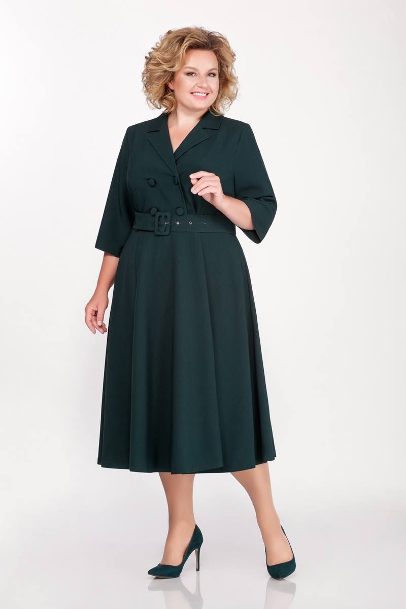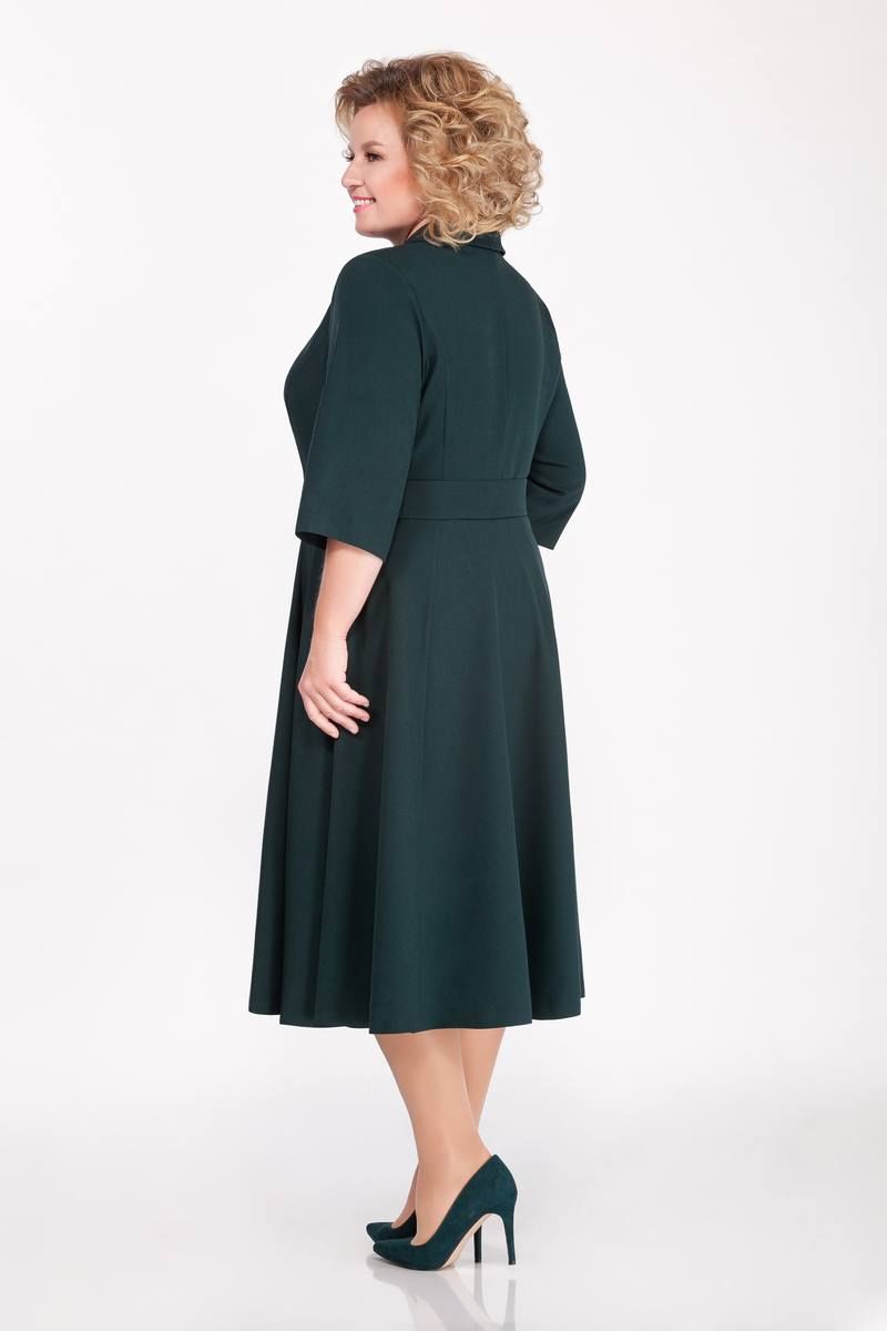 Элегантное женское платье полуприлегающего силуэта, отрезное по линии талии с расклешённой юбкой, драпирующейся красивыми мягкими складками, что скрывает бёдра и формирует стройный силуэт. Лиф двубортный, застёгивающийся на обтянутые тканью пуговицы. По переду и спинке рельефные швы, обеспечивающие красивое облегание по фигуре. Талия подчёркнута поясом с обтянутой тканью пряжкой и металлическими блочками. В боковых швах- карманы. Длина по спинке до талии - 41 см, длина юбки 73(+/- 2) см, длина рукава- 40 см.