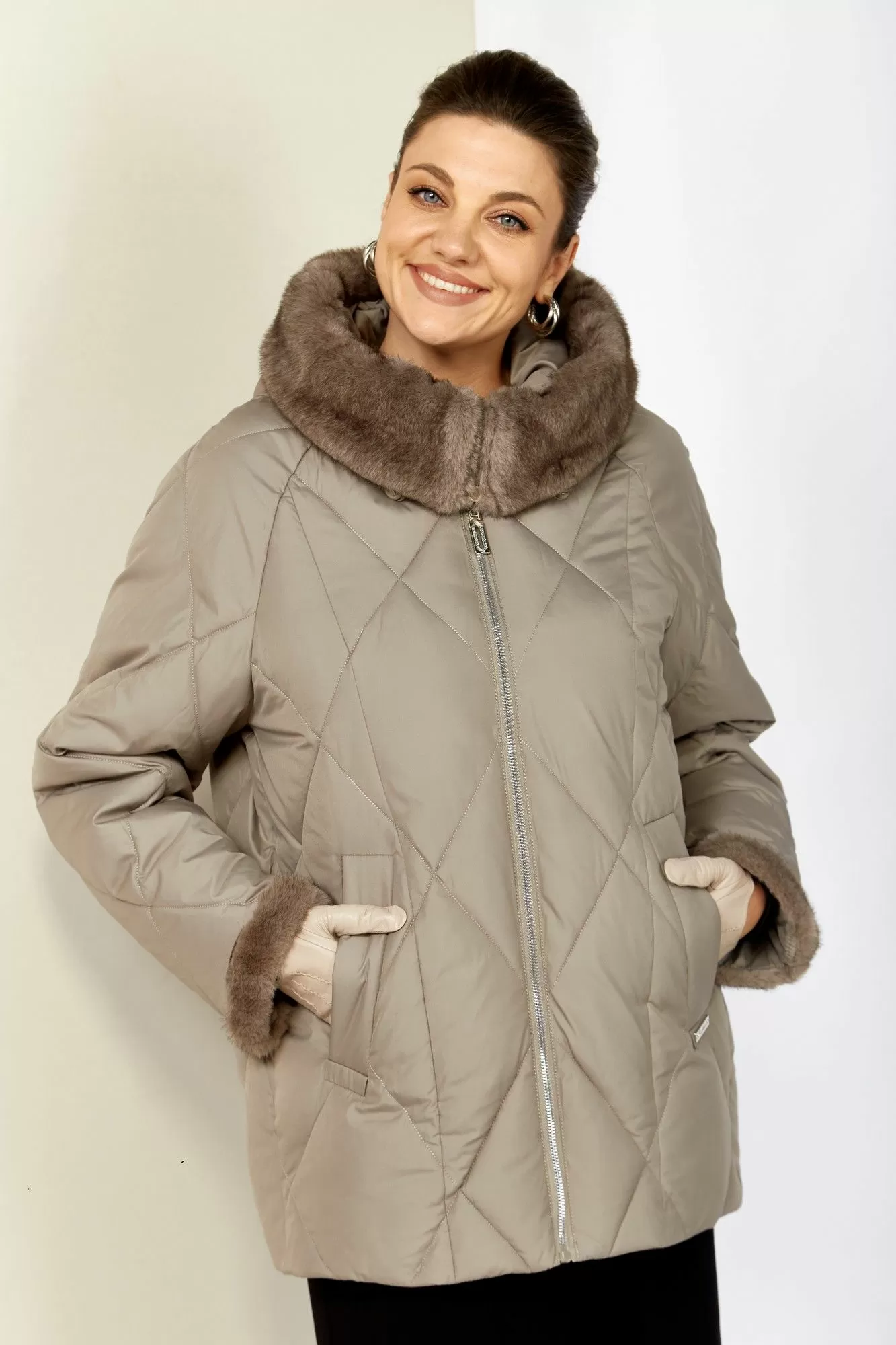 Уютная, элегантная зимняя куртка станет любимой вещью Вашего гардероба! Куртка выполнена из мягкой, матовой курточной ткани с водоотталкивающим эффектом. На качественной сатиновой подкладке из поливискозы. В качестве утеплителя используется «Холлофайбер» (специально разработан для зимних курток) производство Бельгия с плотностью 200 г/кв.м.. Утеплитель по своим характеристикам легкий и прекрасно держит тепло. По переду прорезные карманы с декоративным элементом на магнитах. Рукав реглан. Застежка центральная на тесьму-молнию. Капюшон и отвороты рукавов выполнены из меха, максимально по внешнему виду приближенного к натуральному «Норка», что придает изделию элегантность.