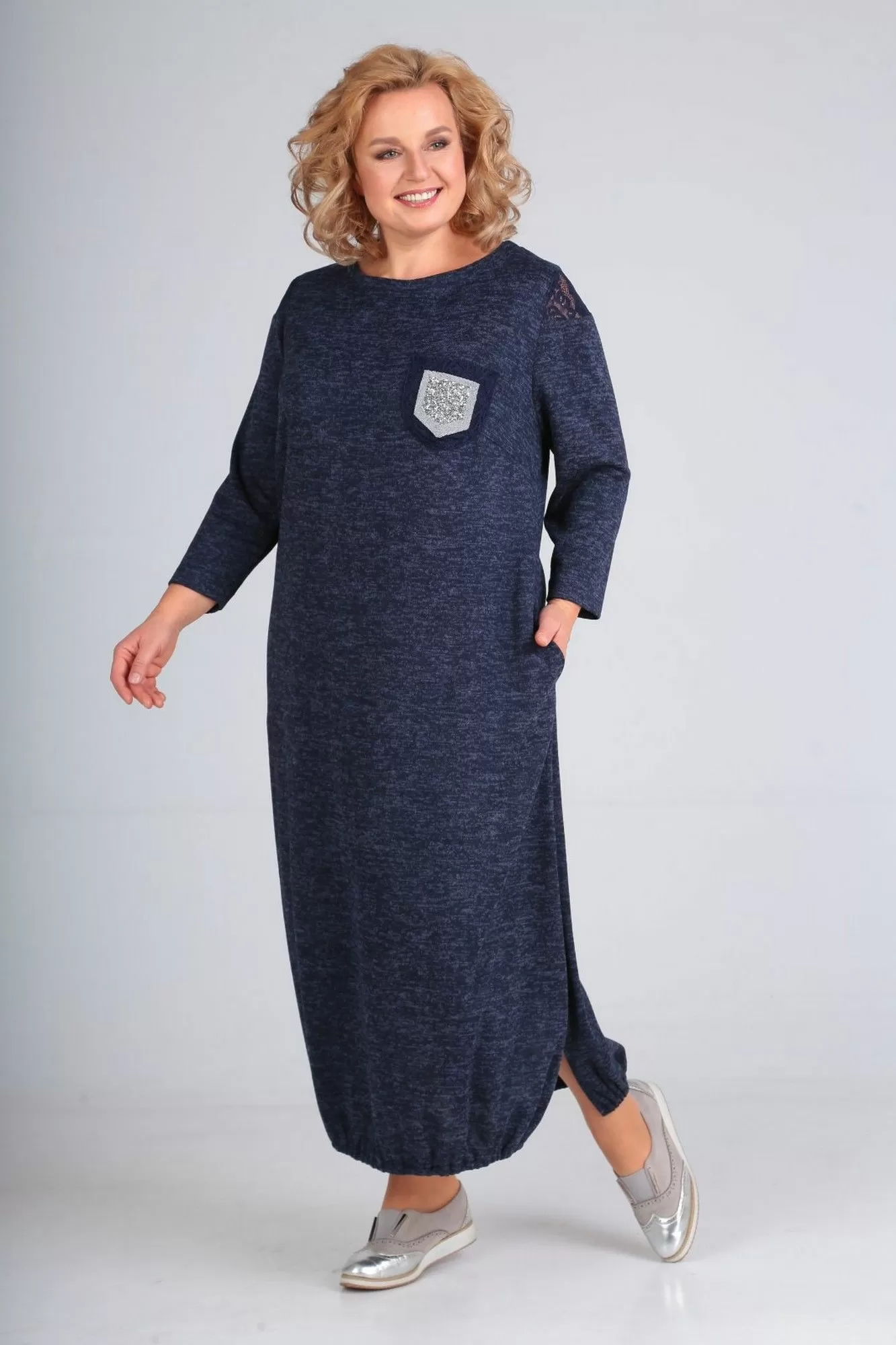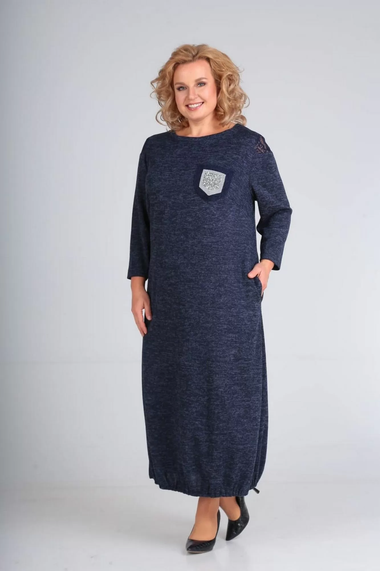 Силуэт полуприлегающий, расширенный книзу. Рукав втачной, одношовный. Вверху рукав с отрезным окатом из кружева. Длина рукава 50 см. Горловина платья закруглённой формы, оформлена отрезной бейкой. Перед с нагрудными вытачками и накладным карманом из кружева. Карман декорирован настрочной аппликацией со стразами. Спинка со средним швом. В боковых швах платья на уровне линии бёдер выполнены потайные карманы. Внизу боковых швов выполнены разрезы высотой 16 см. Низ платья присобран на резинку. Длина платья 126 см.