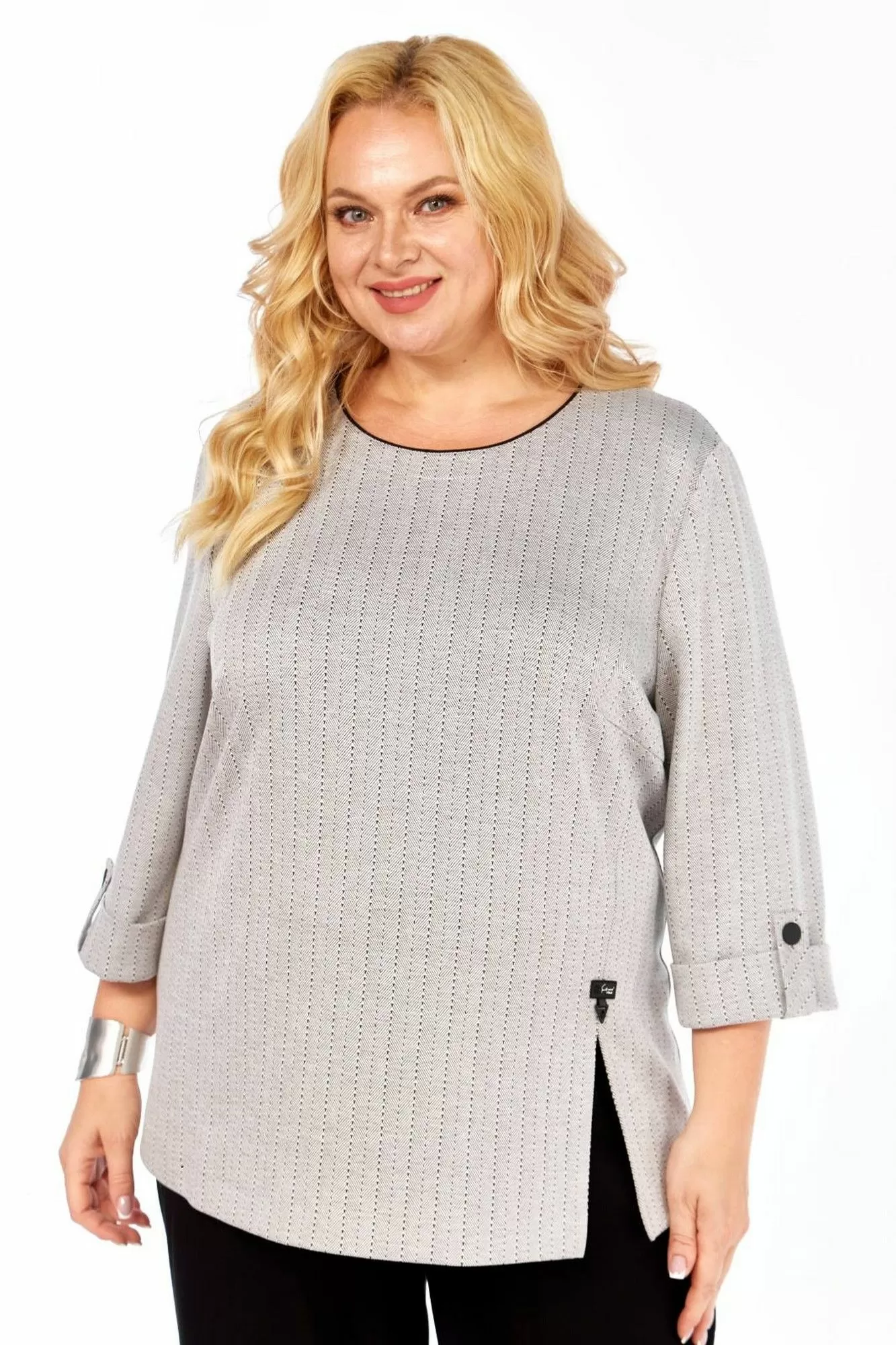 Силуэт полуприлегающий. Рукава втачные, одношовные. Длина рукава 45 см, внизу с отворотами, закреплённые патой с застёжкой на пуговицу. Горловина закруглённая, на обтачке с контрастным кантиком, которая закреплена отделочной строчкой. Перед с нагрудными вытачками. С левой стороны, от вытачки вниз выполнен рельеф с разрезом внизу. Разрез декорирован пришивным элементом. Длина джемпера 70 см. Джемпер выполнен из трикотажного полотна.