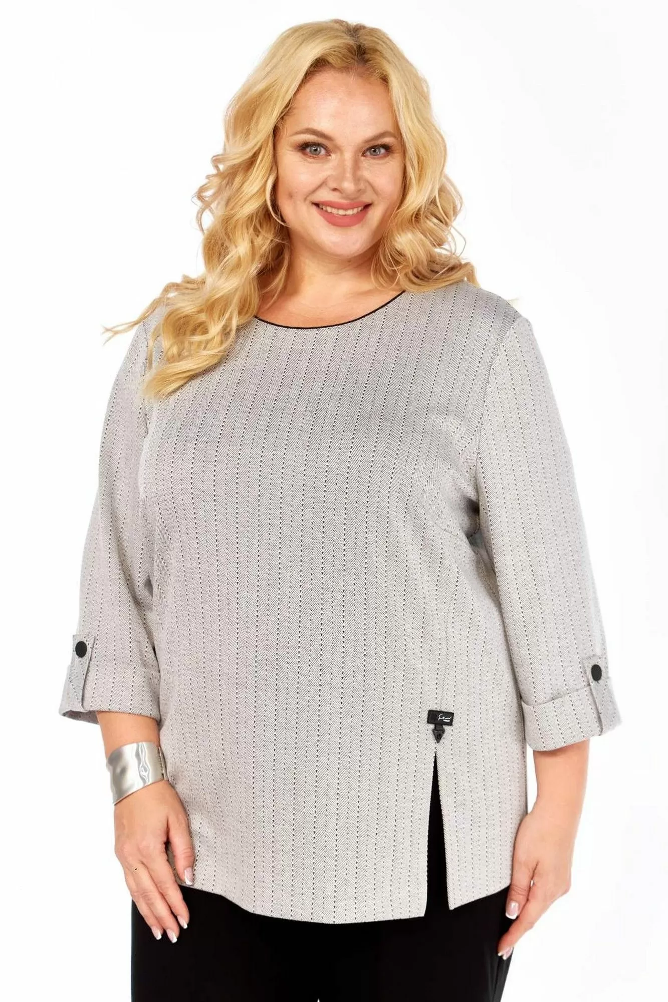 Силуэт полуприлегающий. Рукава втачные, одношовные. Длина рукава 45 см, внизу с отворотами, закреплённые патой с застёжкой на пуговицу. Горловина закруглённая, на обтачке с контрастным кантиком, которая закреплена отделочной строчкой. Перед с нагрудными вытачками. С левой стороны, от вытачки вниз выполнен рельеф с разрезом внизу. Разрез декорирован пришивным элементом. Длина джемпера 70 см. Джемпер выполнен из трикотажного полотна.