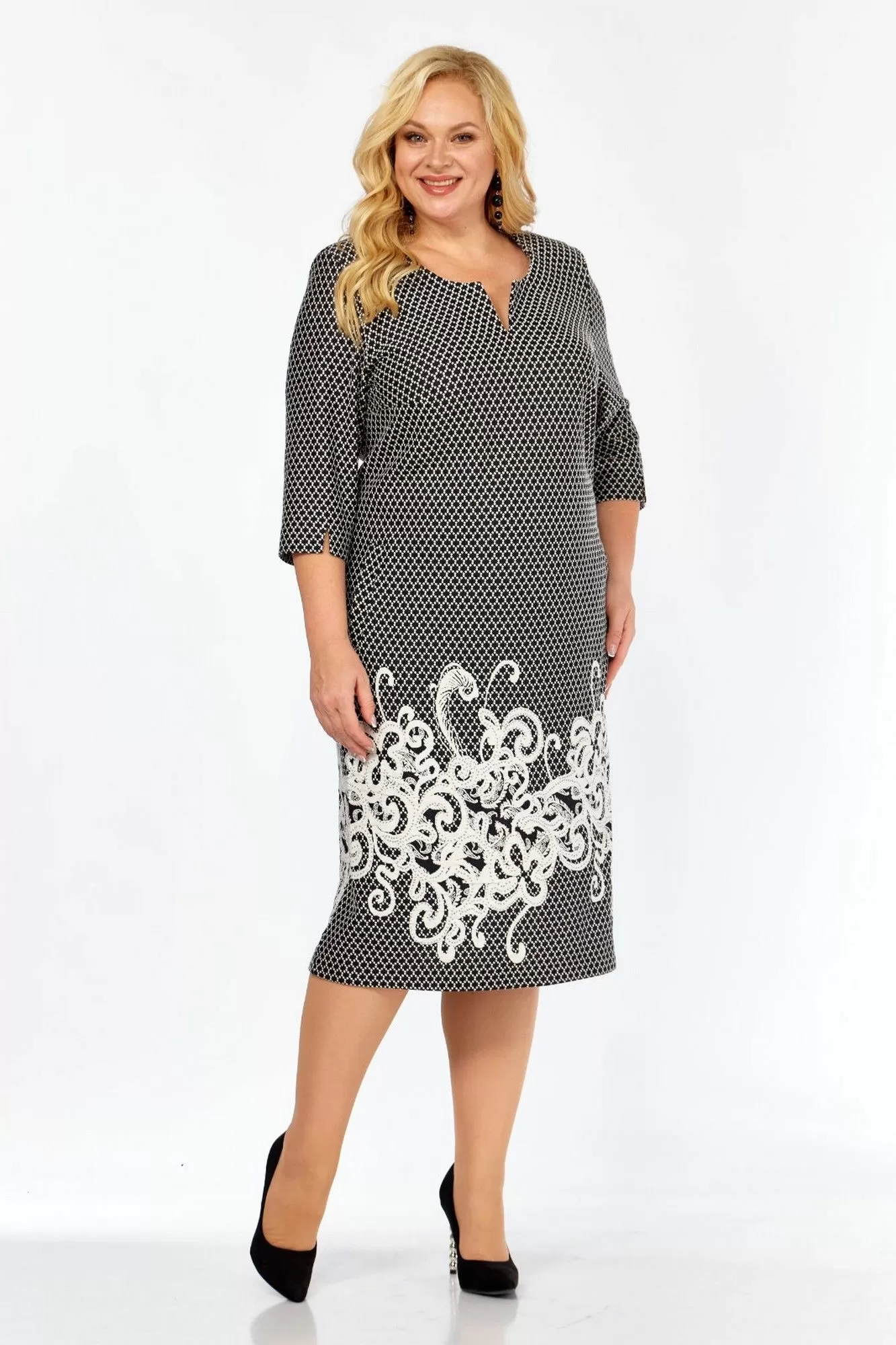 Силуэт прилегающий. Рукава втачные, одношовные, внизу с разрезом. Длина рукава 44 см. Горловина закруглённая, на обтачке. Перед с нагрудными вытачками. Спереди на уровне бёдер выполнены прорезные карманы с листочкой. Спинка со средним швом, внизу с разрезом. Длина платья по спинке 112 см. Платье выполнено из трикотажного полотна.