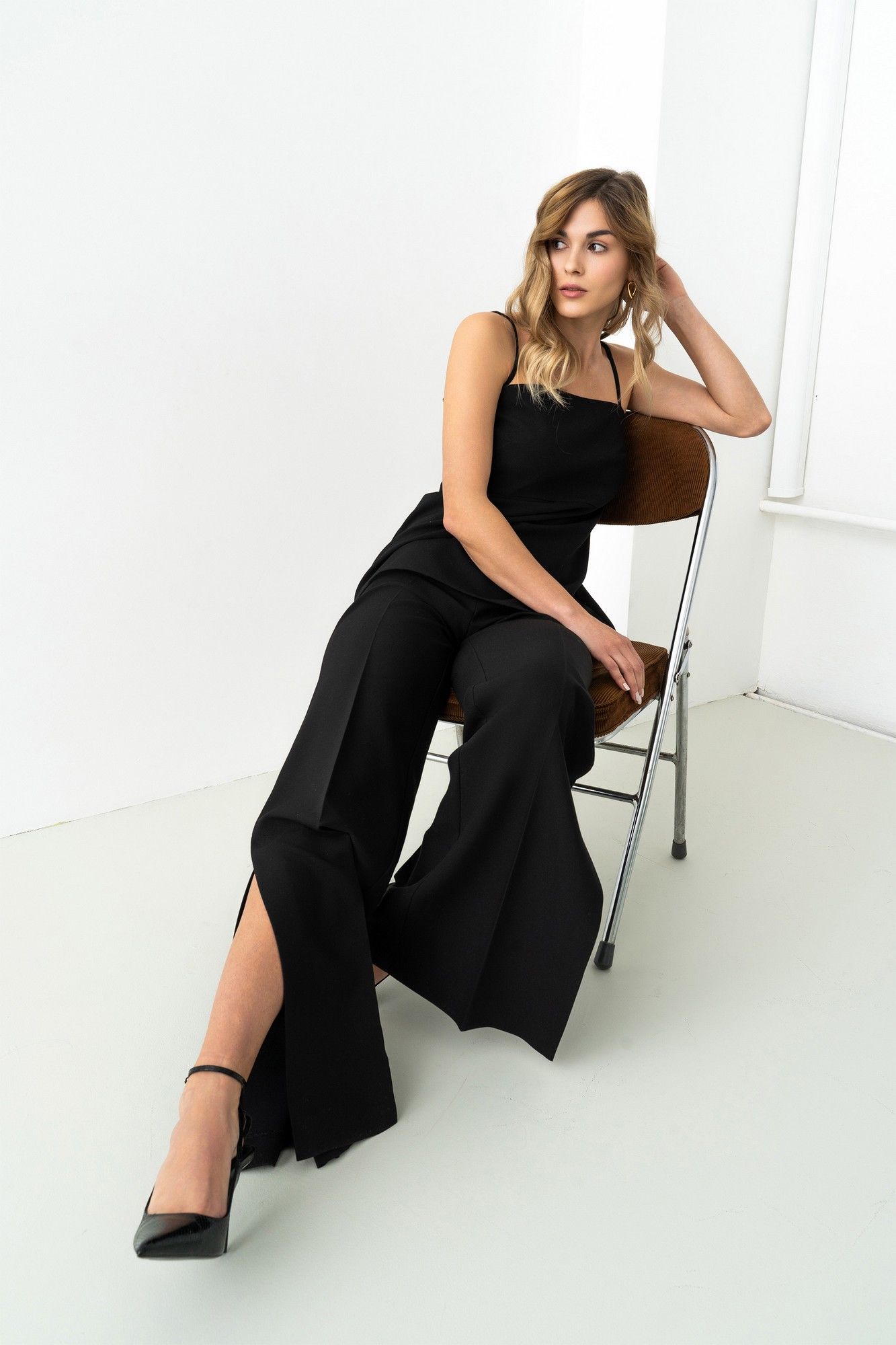 Стильный брючный комплект, состоящий из топа и брюк. Топ на хлопковой подкладке, отрезной выше линии талии, верхняя часть прилегающего силуэта с нагрудной вытачкой, нижняя расширена к низу. В среднем шве спинки потайная молния. Модель с регулируемыми, тонкими бретелями. Брюки актуального, слегка расклешенного силуэта к низу, с заутюженными стрелками. Пояс брюк стабильный, по поясу нашиты шлевки. Застежка-гульфик с молнией и пуговицей на поясе. На задней части брюк настрочные клапаны с металлическими поговицами. По боковым швам высокие шлицы. Комплект хорошо смотрится с лонгсливами, блузками и рубашками. Длина брюк по боковому шву с поясом 109 см. Ширина брюк по низу +-32 см. Высота шлицы 35 см.