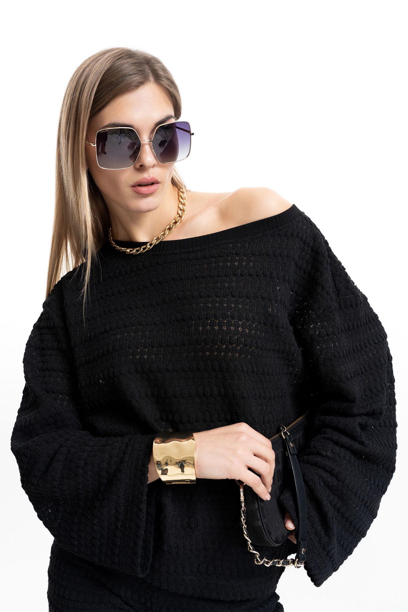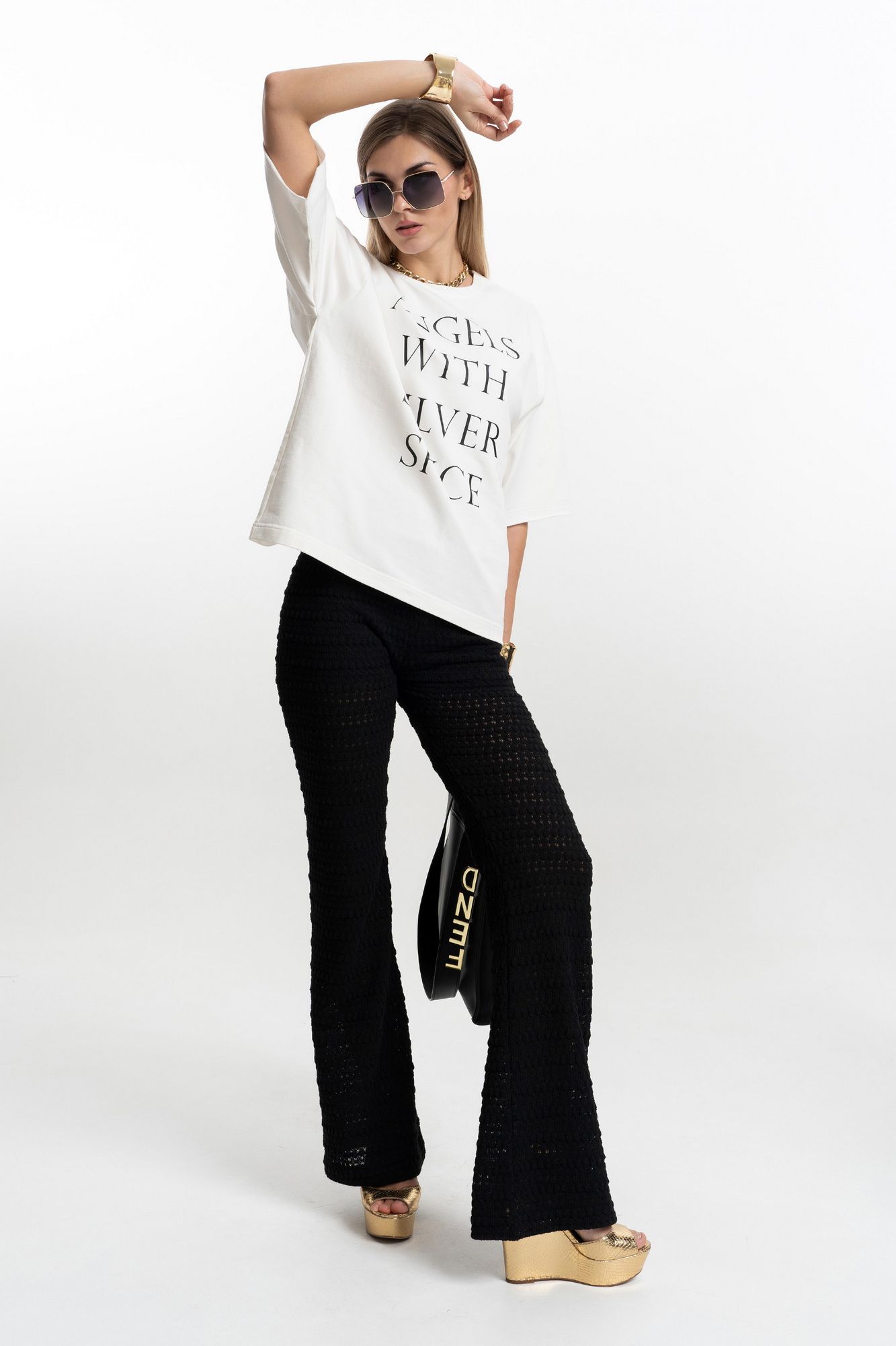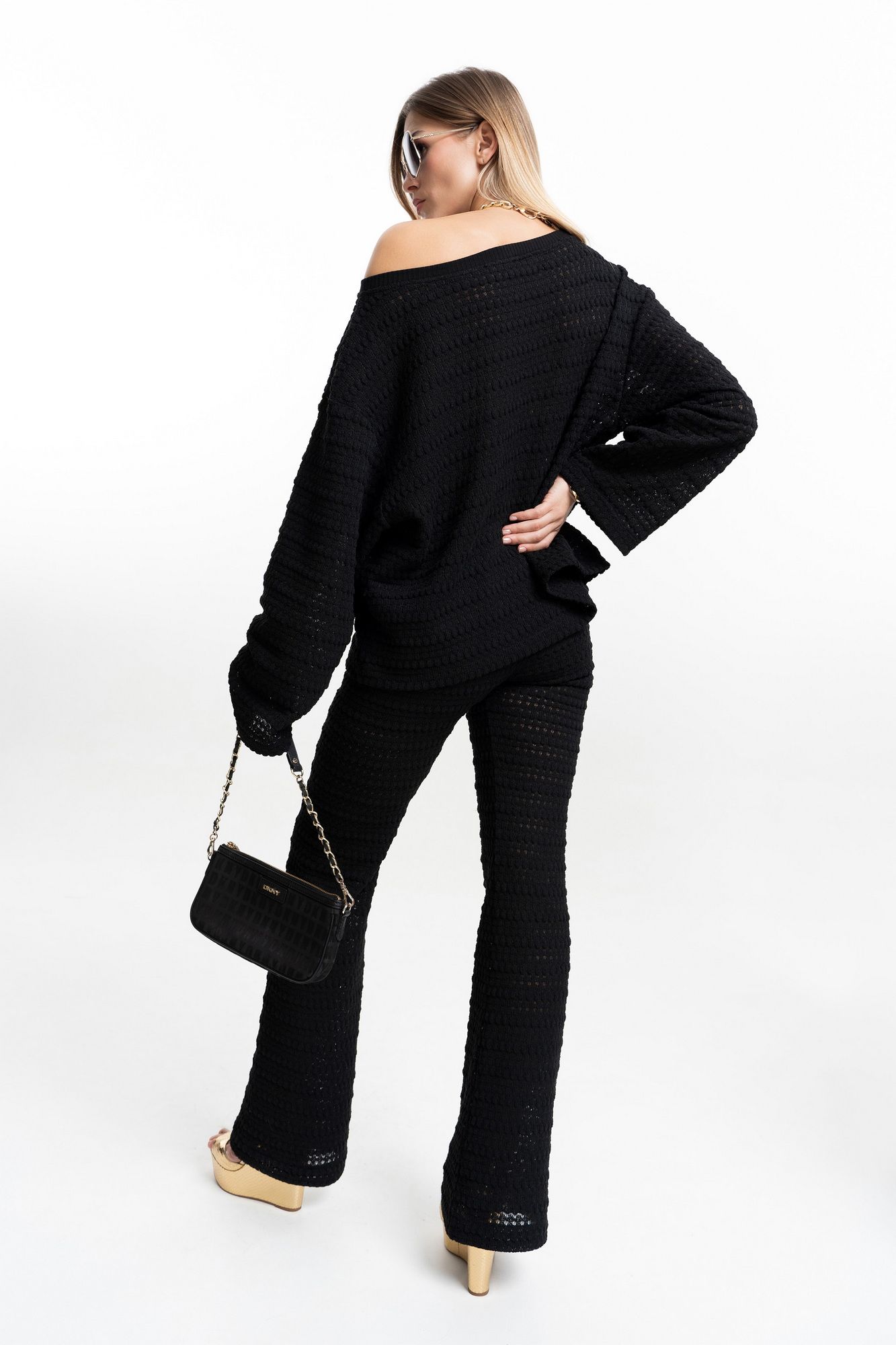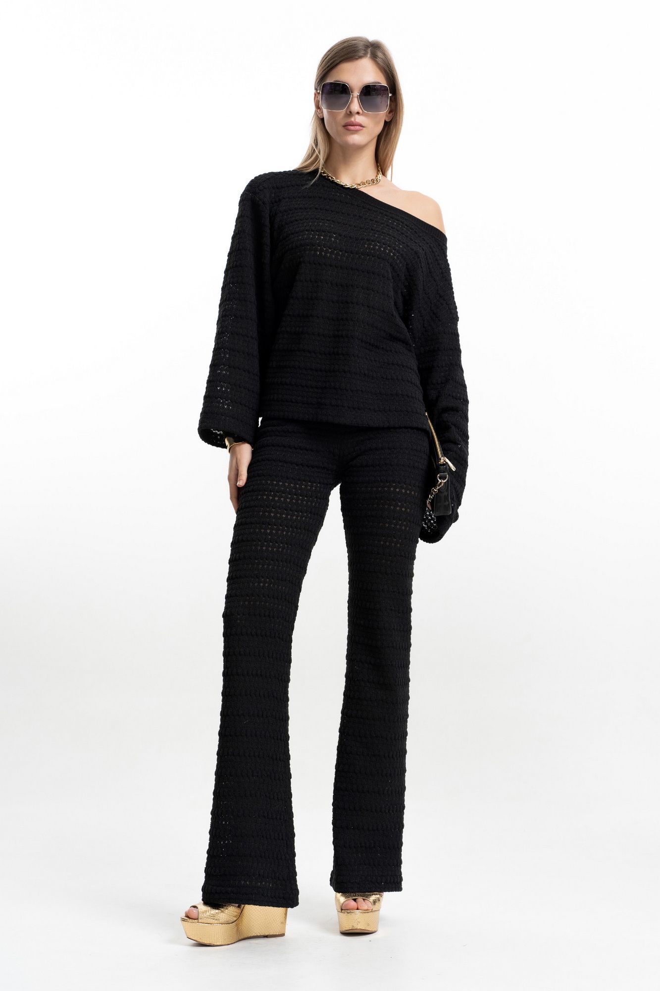 Комплект из фактурного, "вязаного" трикотажа. Джемпер оверсайз с длинным рукавом на спущенной пройме. Горловина округлой формы, обработана бейкой. Брюки облегающего силуэта, слегка расклешенные к низу от линии колена. Изделие с поясом на резинке. Полупрозрачная "вязаная" текстура трикотажа делает образ стильным и романтичным. Комплект идеально подходит как для вечерних, так и для повседневных стильных образов. Длина брюк по внутреннему шву 86 см. ( по боковому шву с поясом 115 см. ) Длина джемпера по центру спинки +-55см. Длина рукава от горловины 66см. ( длина рукава от проймы 52 см.) Ширина горловины 30 см.. Ширина по низу в полуобхвате +-66см. ( 46р ) Ширина рукава в полуобхвате +-20 см. ( 46р. )