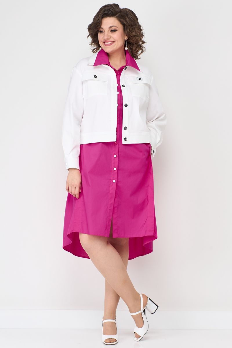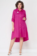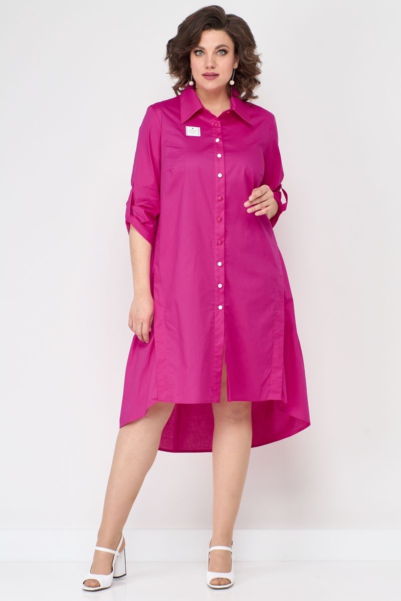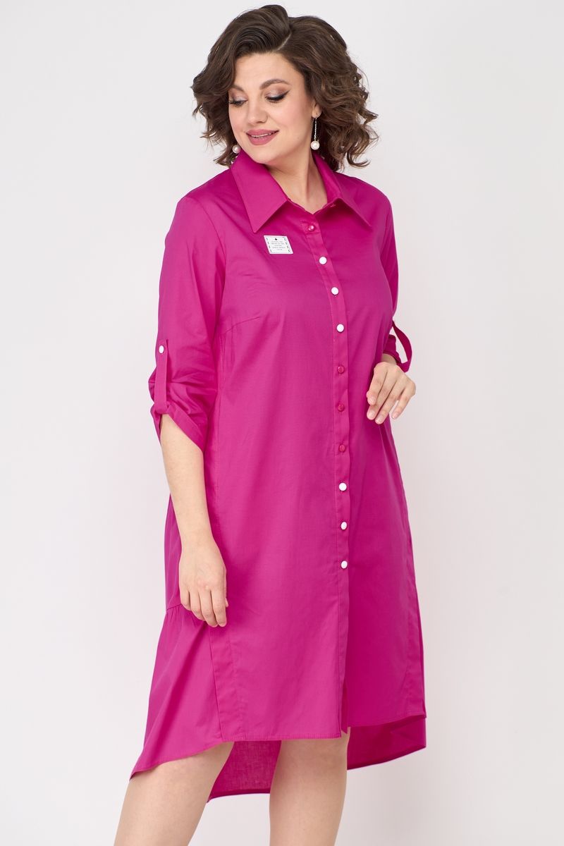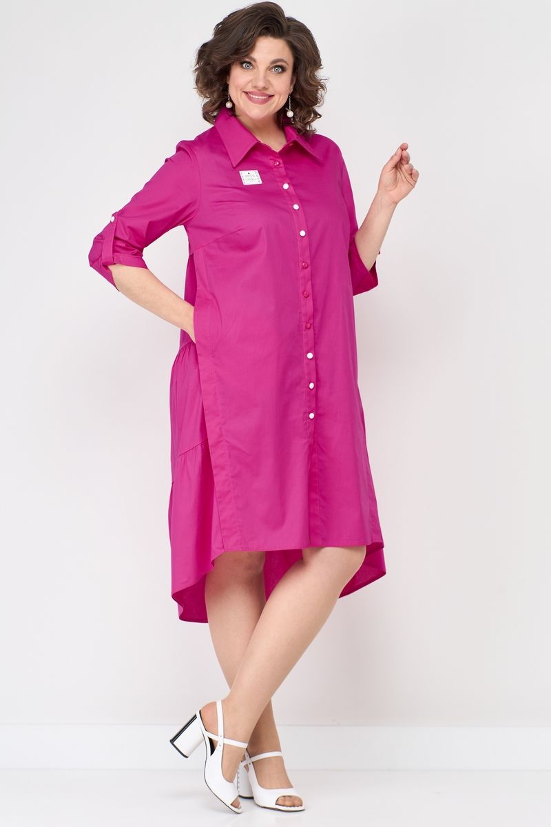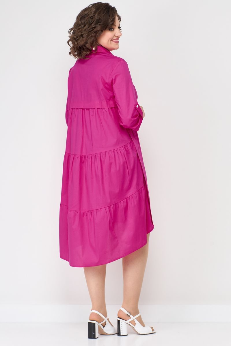 Платье женское, выполненное из хлопковой ткани. Полочка с нагрудной косой вытачкой. Воротник рубашечного типа. Рукав втачной, длина регулируется патой. Застежка-планка на пуговицах. Платье без подкладки. Спинка отрезная по линии талии и декорирована складкой. Юбка состоит из воланов со средней сборкой. В боковых швах имеются карманы. Украшением платья служат пришивные эмблемы и разного цвета пуговицы