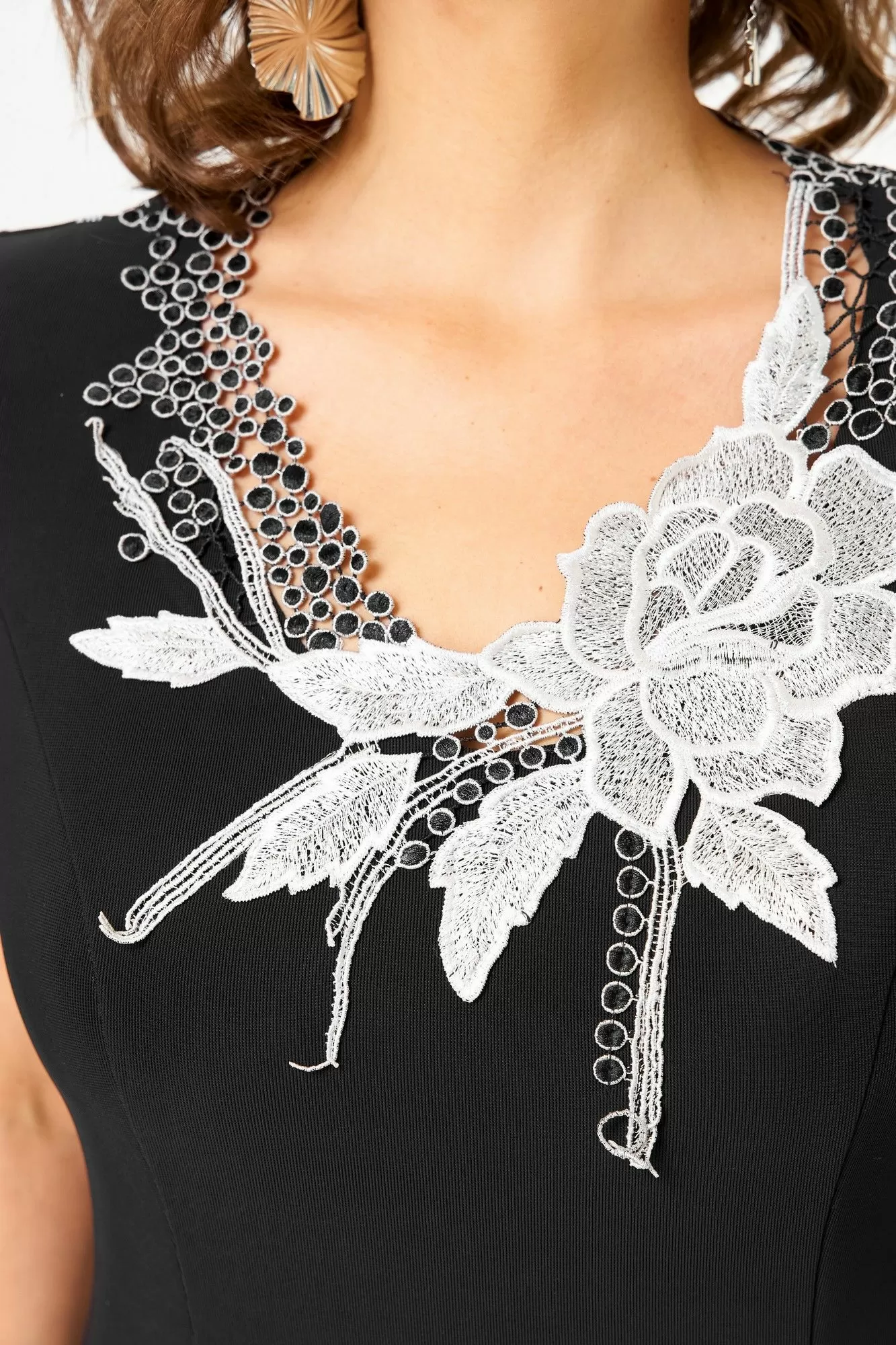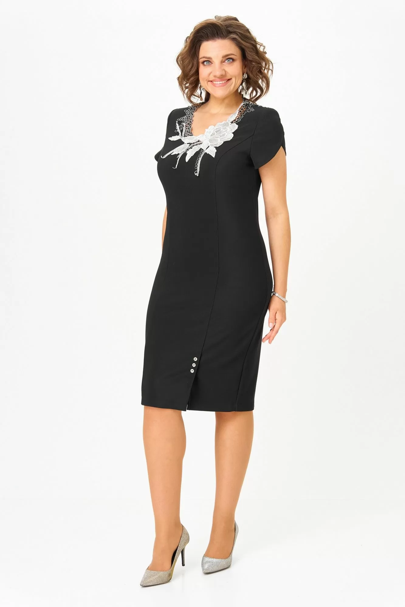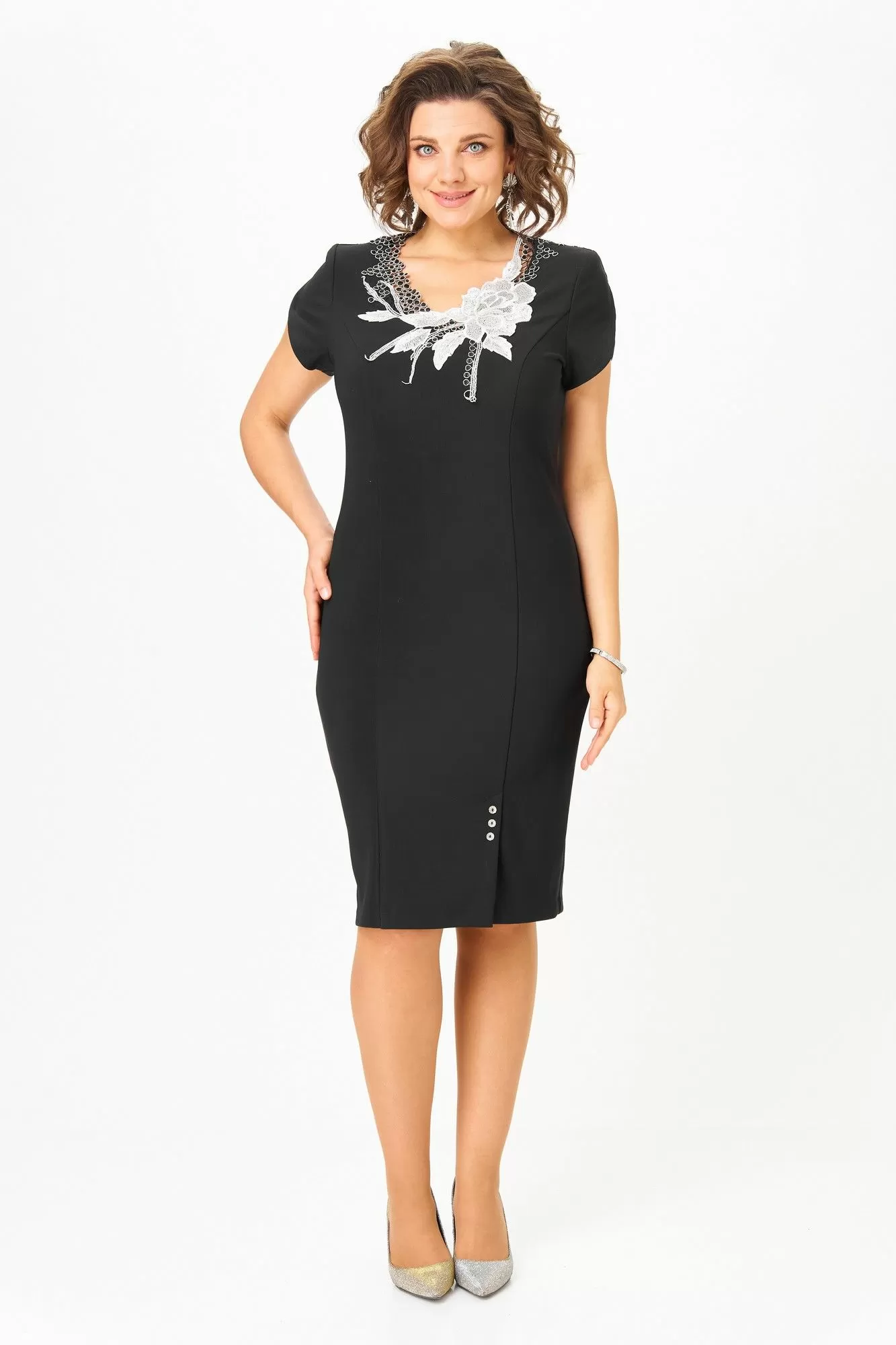 Платье облегающего силуэта. Украшением изделия служит вставка-аппликация, вышитая на сетке. Аппликация расположена спереди и по спинке платья. По передней части рельефы, внизу полочки слева вырез. Рукава короткие фигурные.