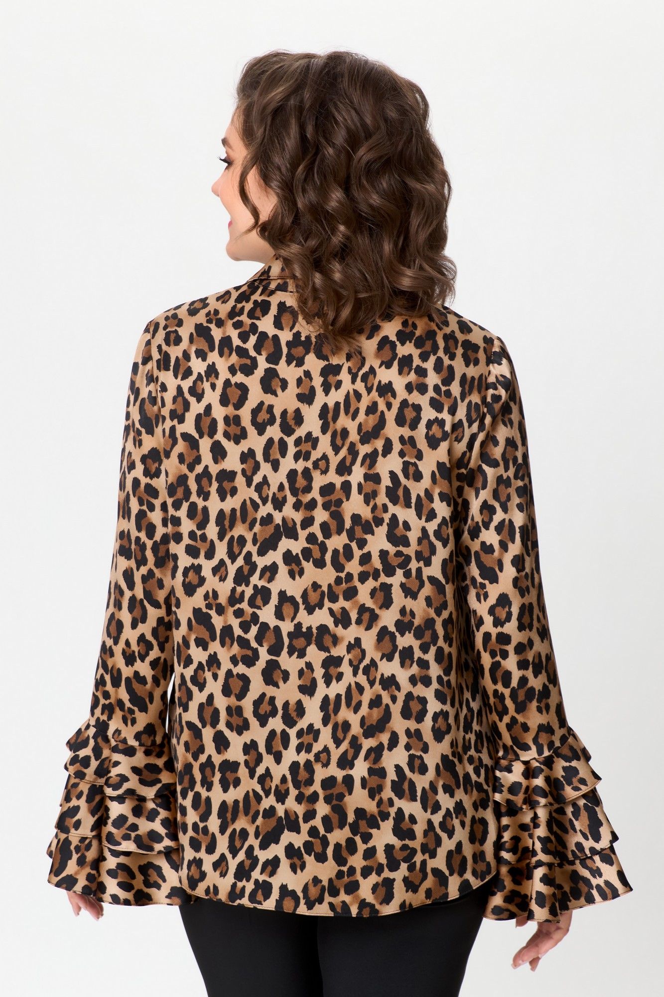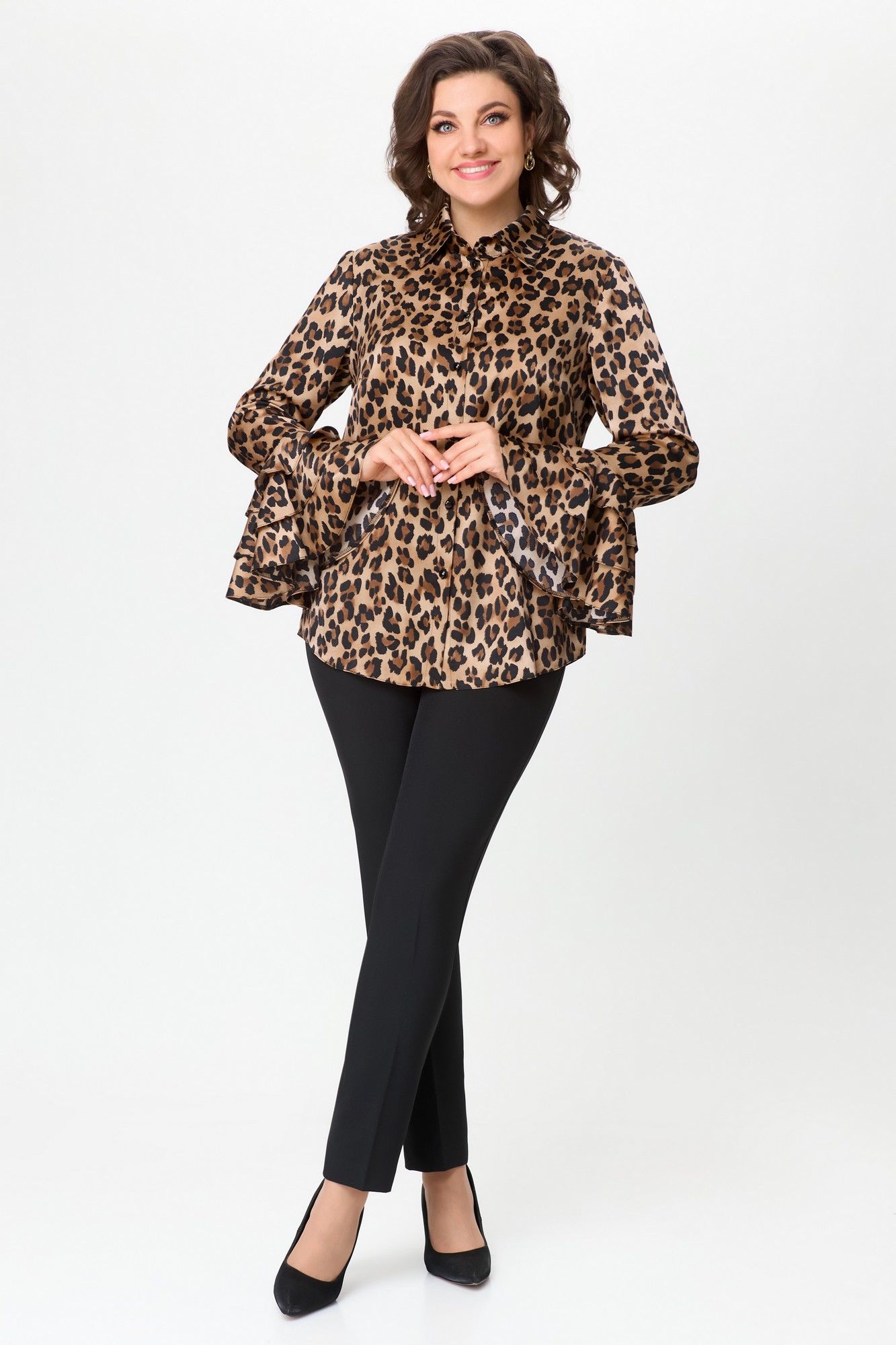 Блузка полуприлегающего силуэта, с втачным рукавом. Застежка центральная на петли и пуговицы. Горловина с воротником рубашечного типа с отрезной стойкой. По линии груди вытачки. Рукав длинный с тремя притачными воланами разной длины. Фурнитура может меняться в зависимости от наличия. Длина по спинке: 66см Длина рукава: 62см