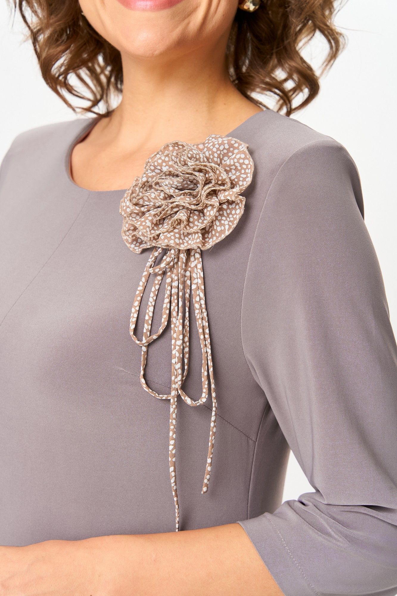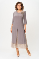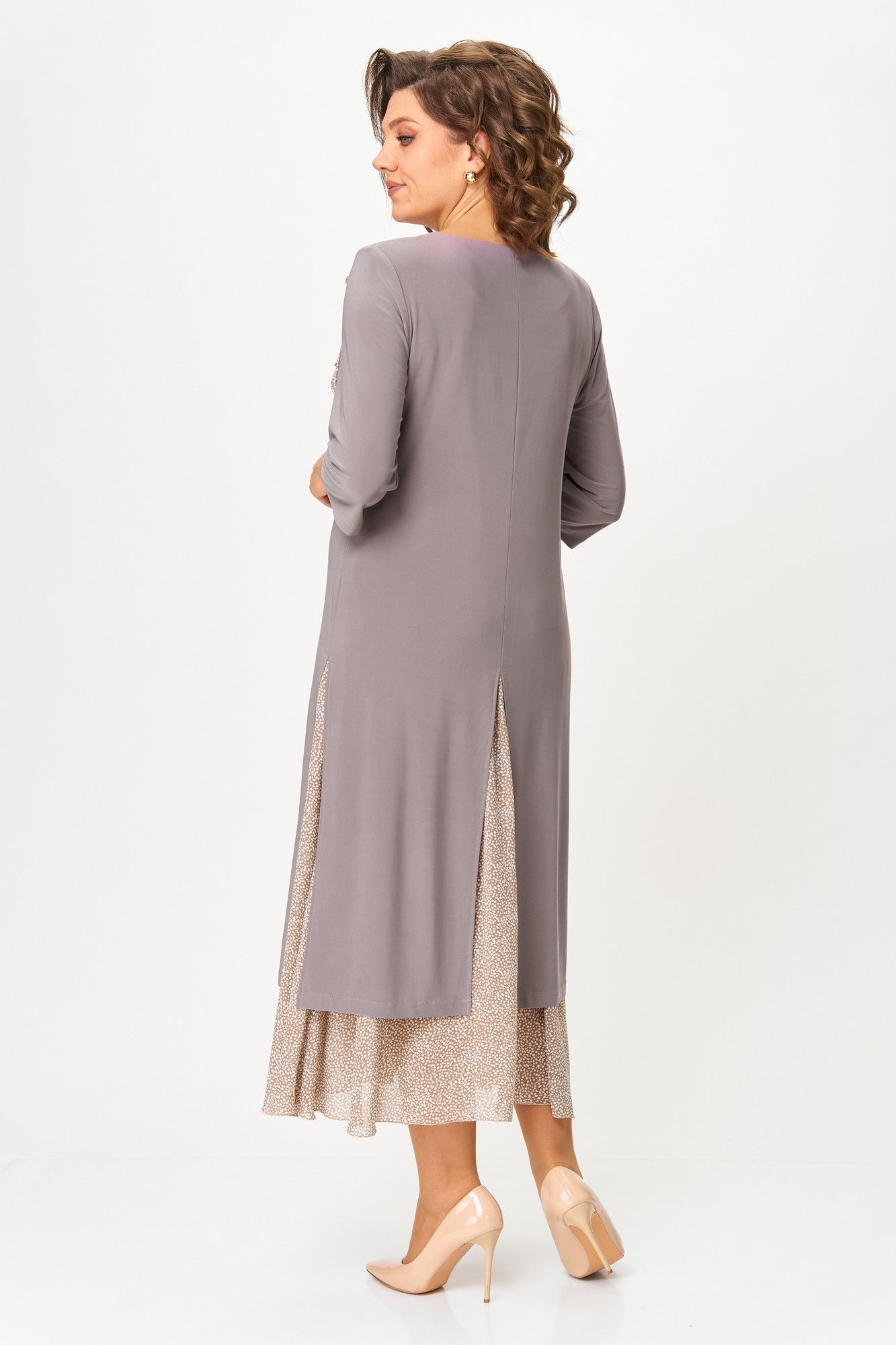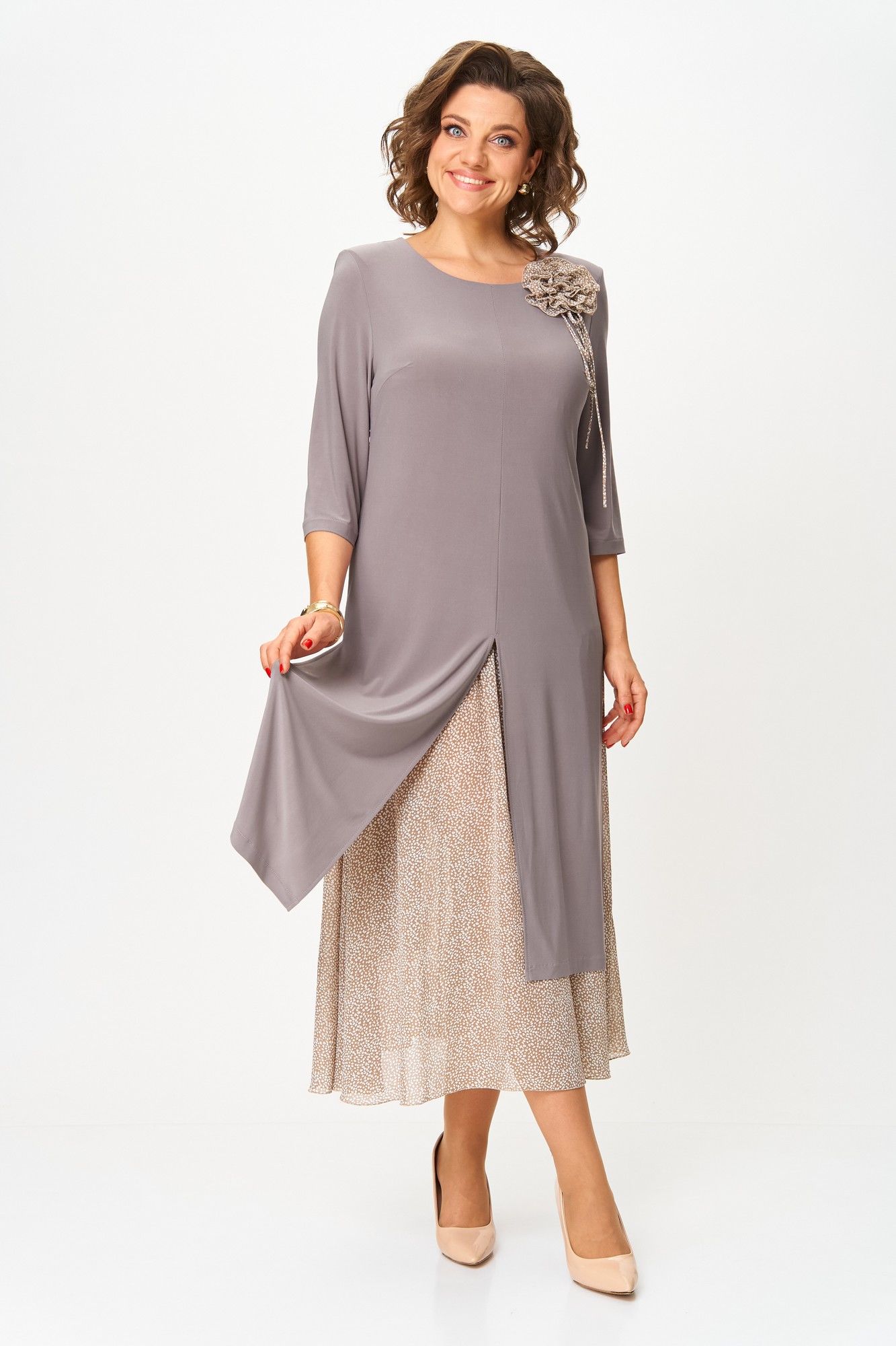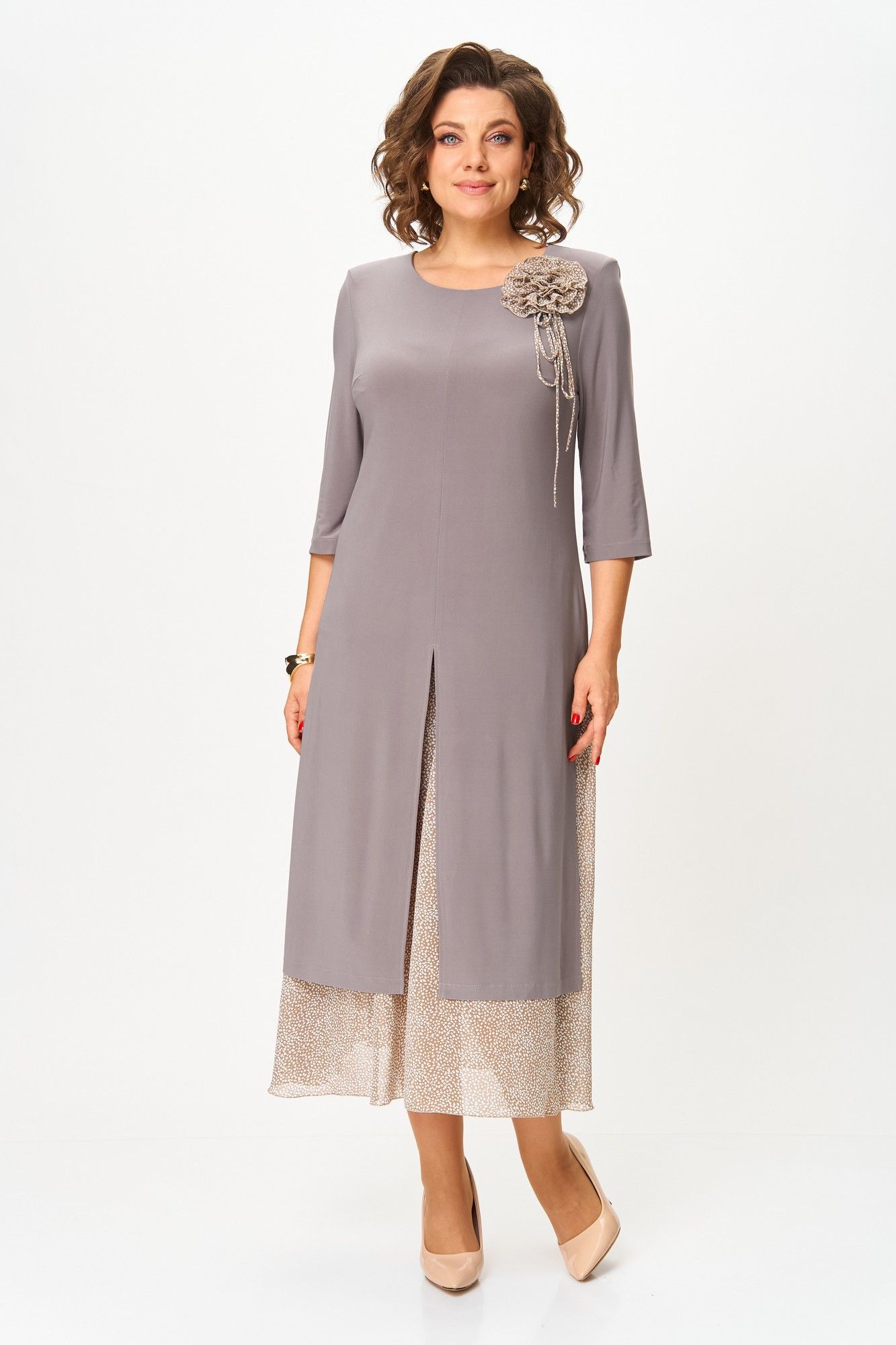 Платье женское полуприлегающего силуэта расширенное к низу, выполнено в комплектации из двух предметов. Верхнее платье –из мягкого эластичного материала, с высокими разрезами по переду, спинке и бокам, с втачным рукавом ¾. По линии груди вытачки. По левой части переда съемный цветок. Нижнее платье силуэт полуприлегающий, по низу присборенный. Верхнее платье отлично будет смотреться и отдельно в сочетании с брюками. Длина верхнего платья по спинке: 111 см Длина нижнего платья по спинке: 118 см Длина рукава: 45 см
