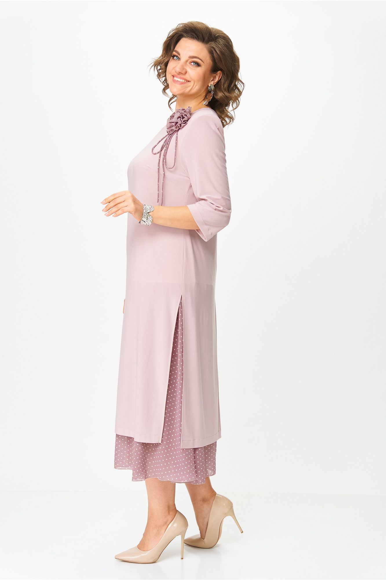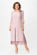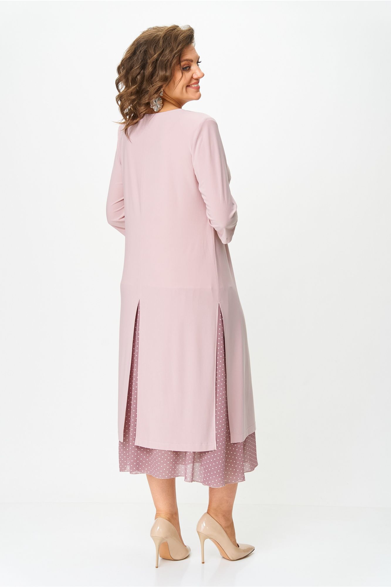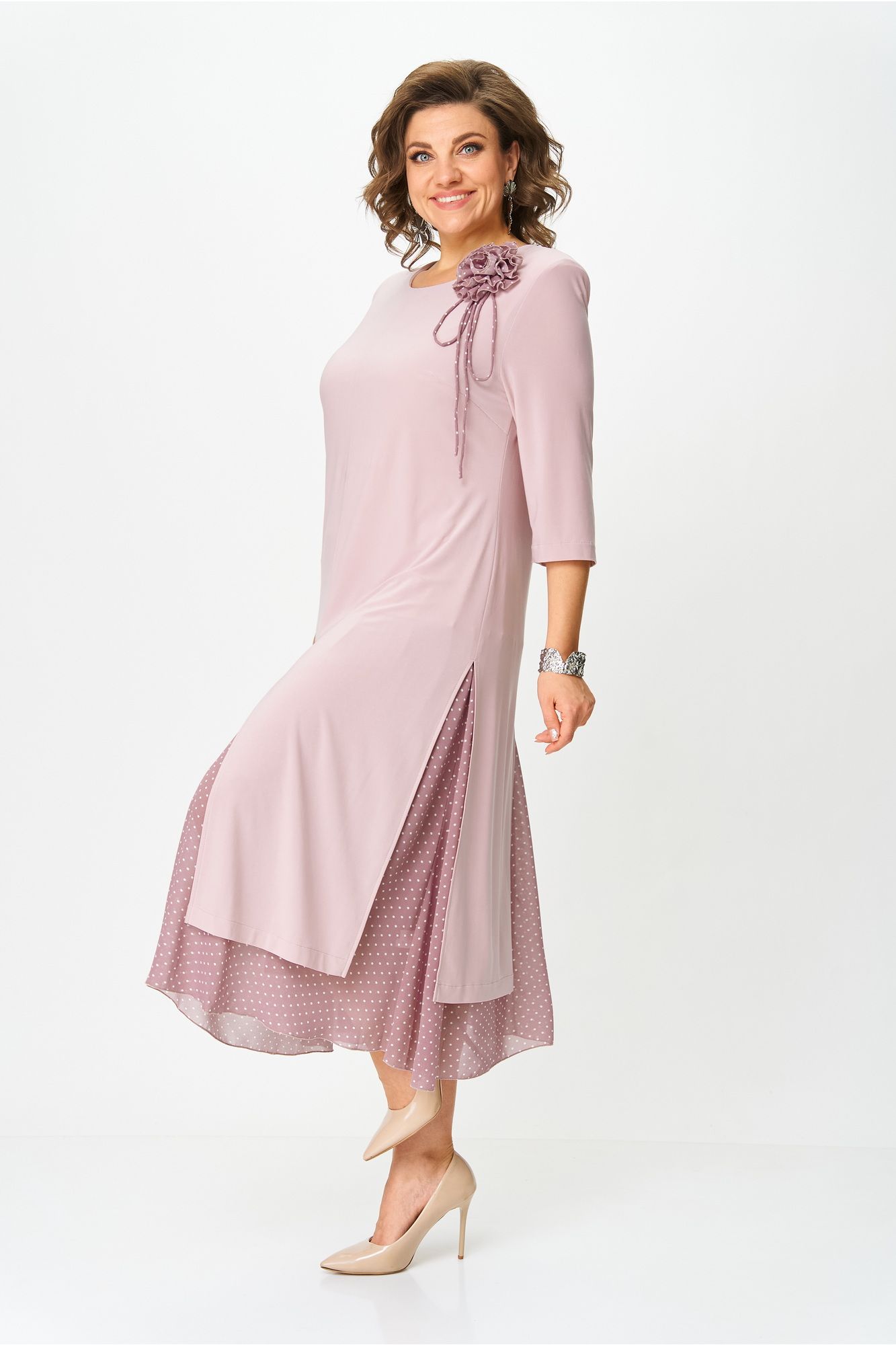 Платье женское полуприлегающего силуэта расширенное к низу, выполнено в комплектации из двух предметов. Верхнее платье – из мягкого эластичного материала, с высокими разрезами по переду, спинке и бокам, с втачным рукавом ¾. По линии груди вытачки. По левой части переда съемный цветок. Нижнее платье силуэт полуприлегающий, по низу присборенный волан из шифона с модным леопардовым принтом. Верхнее платье отлично будет смотреться и отдельно в сочетании с брюками. Длина верхнего платья по спинке: 111 см Длина нижнего платья по спинке: 118 см Длина рукава: 45 см