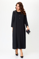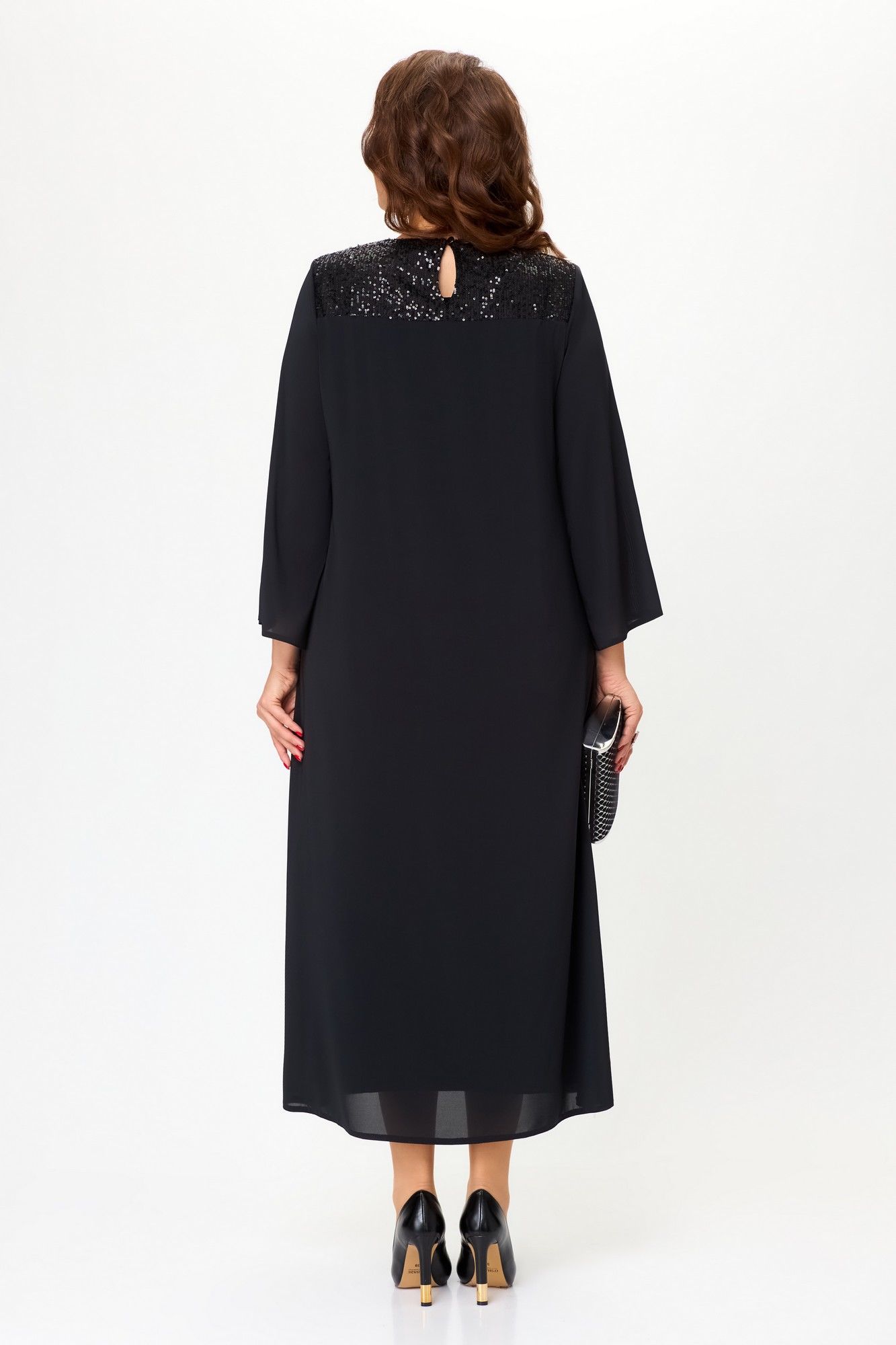 Платье женское выполнено в комплектации из двух предметов. Верхнее платье из шифона свободного кроя, с втачным рукавом. По переду фигурная кокетка. По спинке кокетка и застежка на воздушную петлю и пуговицу. Рукав длиной 7/8, слегка расширенный к низу. Кокетки выполнены из отделочной ткани с пайетками. Нижнее платье из мягкого эластичного трикотажа, прилегающего силуэта, без рукавов. По линии груди вытачки. Спинка со средним швом. Горловина, проймы и низ изделия обработаны на плоскошовной машине. Длина верхнего платья по спинке: 130 см Длина рукава: 53 см Длина нижнего платья от плеча: 120 см