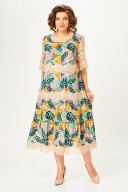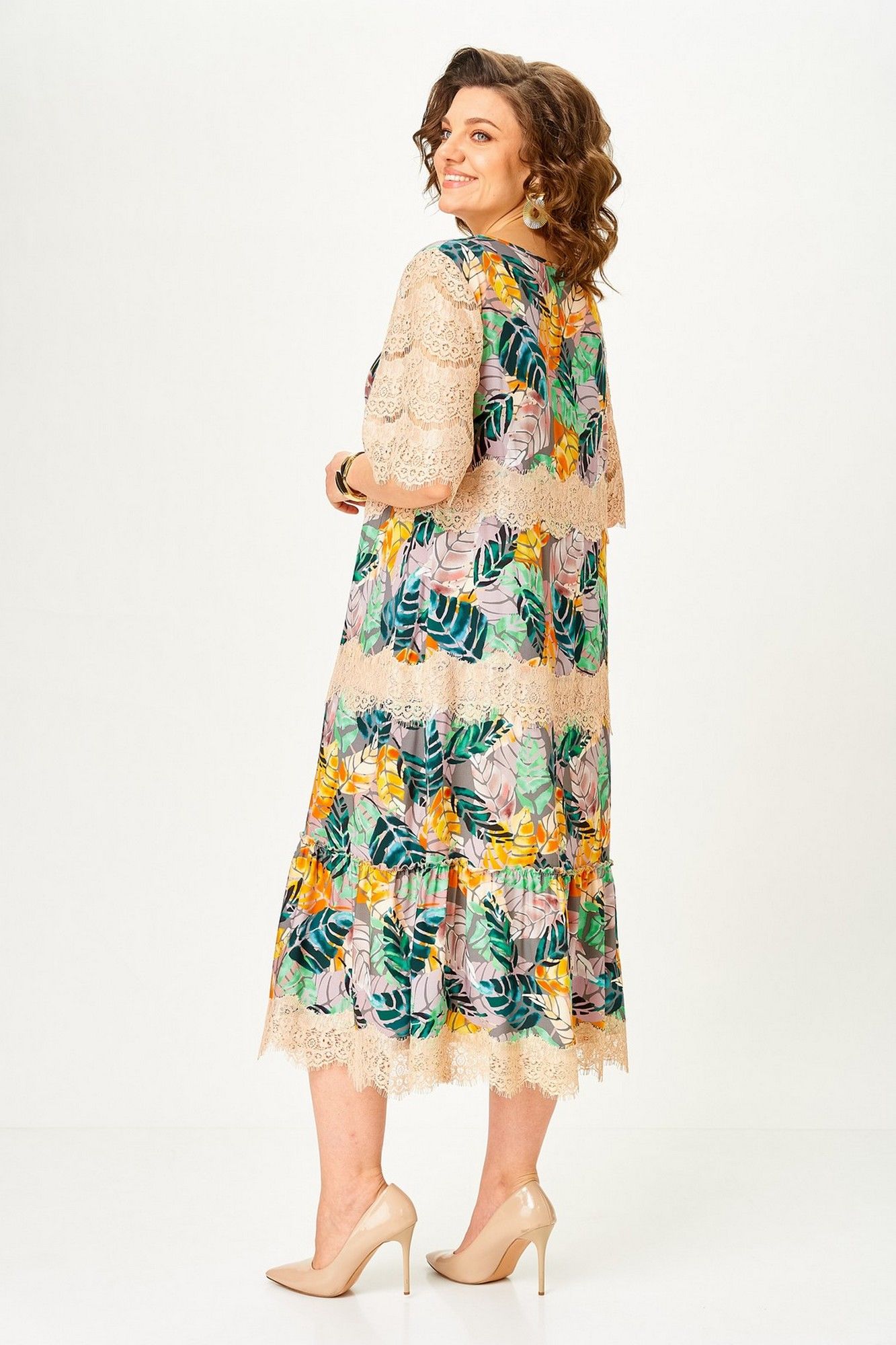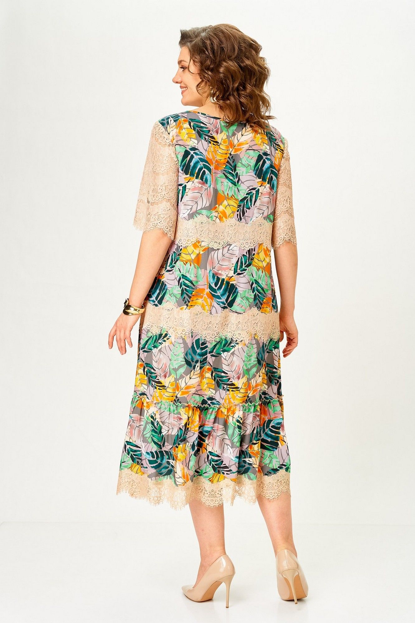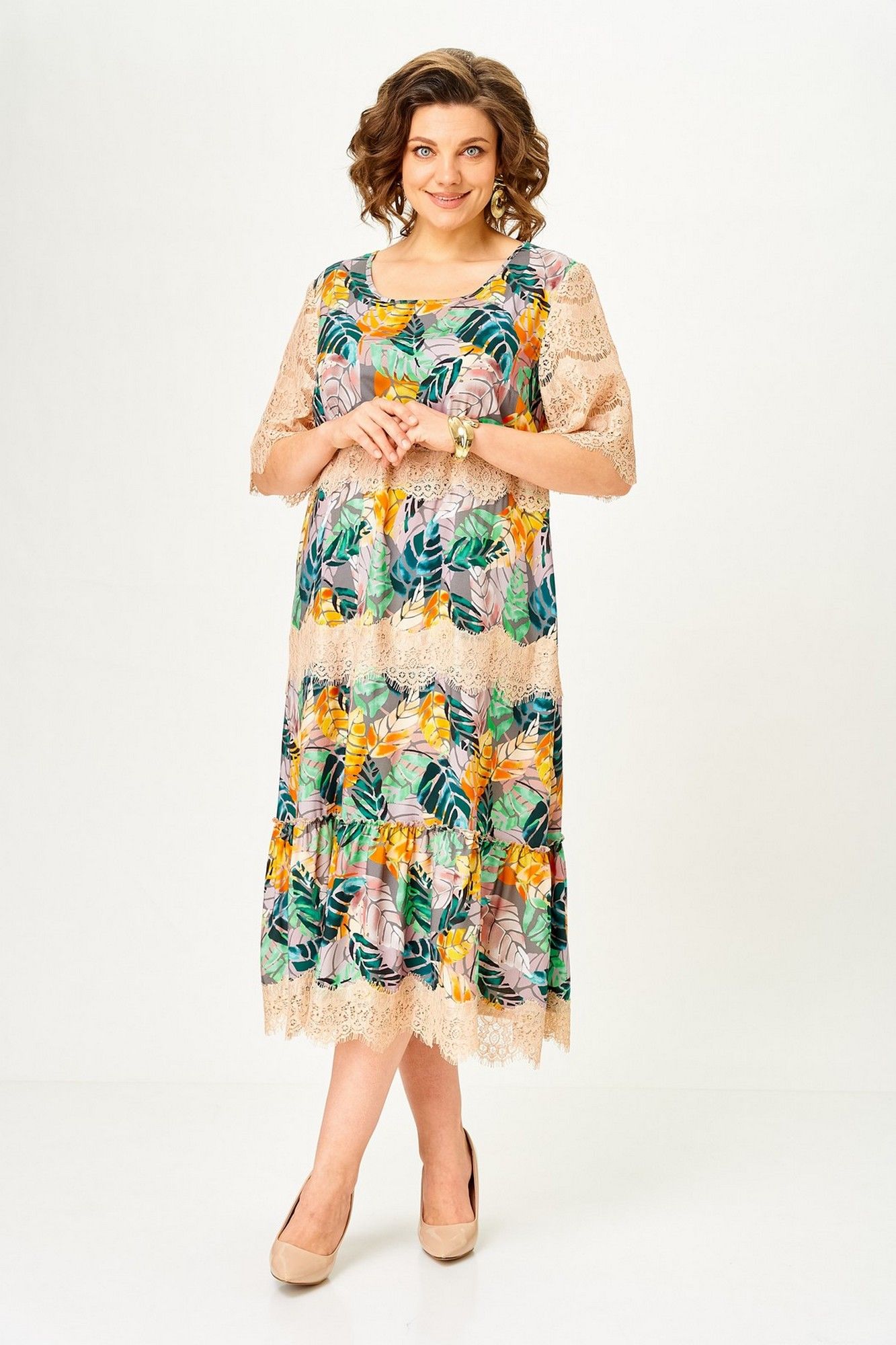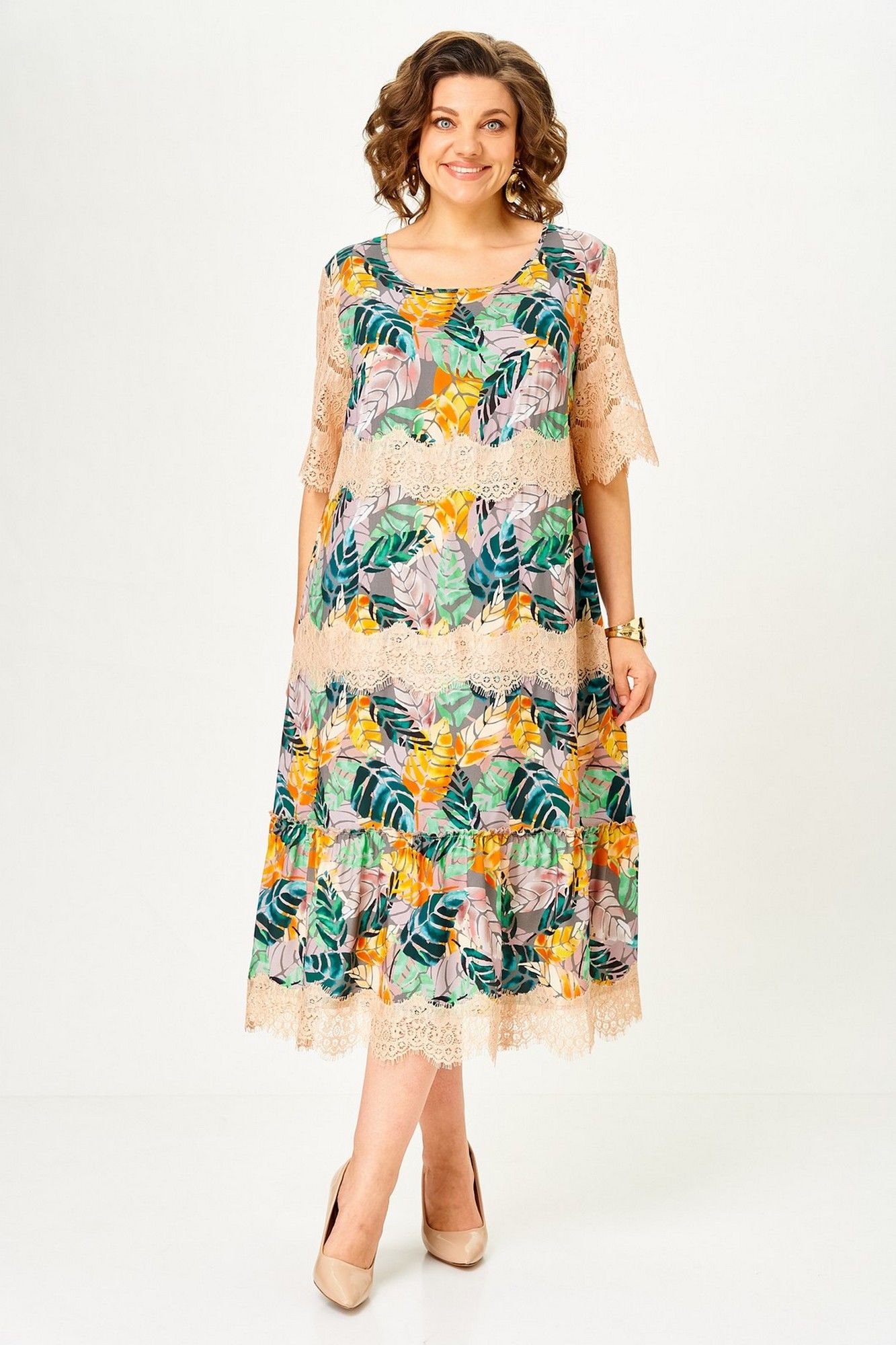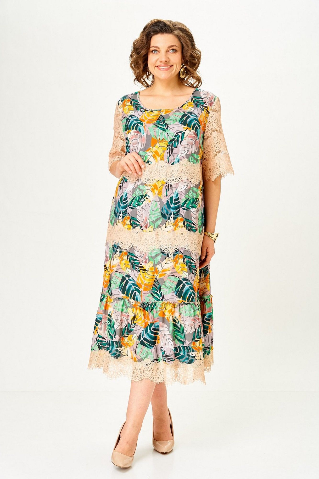 Платье женское А – силуэта с втачным рукавом. По линии груди переда вытачки. По низу платья широкая отделочная деталь со сборкой. Рукава платья выполнены из кружева. Низ платья и каждый ярус декорированы кружевом. Широкий размерный ряд. Длина платья по спинке: 117 см Длина рукава: 30 см