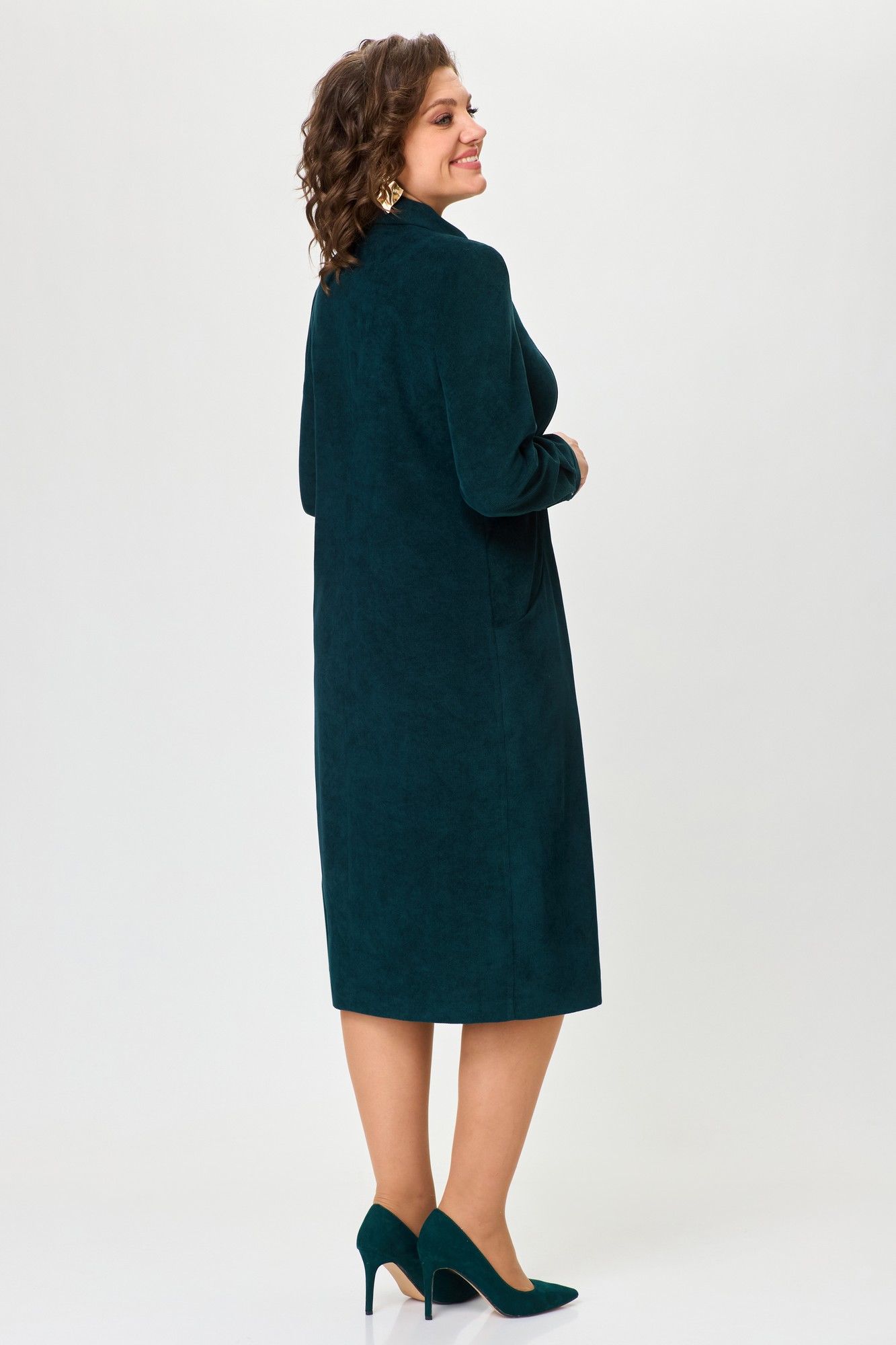Платье женское полуприлегающего силуэта с втачным рукавом. Застежка на пуговицы на притачных планках. По горловине отложной воротник на отрезной стойке. По переду рельефы от проймы с боковыми карманами. Средняя часть переда со сборкой по линии талии. По спинке средний шов. Рукав длинный, по низу притачная манжета с застежкой на пуговицу. Вельветовое платье имеет широкий размерный ряд, что позволит Вам подобрать нужный размер. Длина платья по спинке: 102 см Длина рукава от горловины: 60 см
