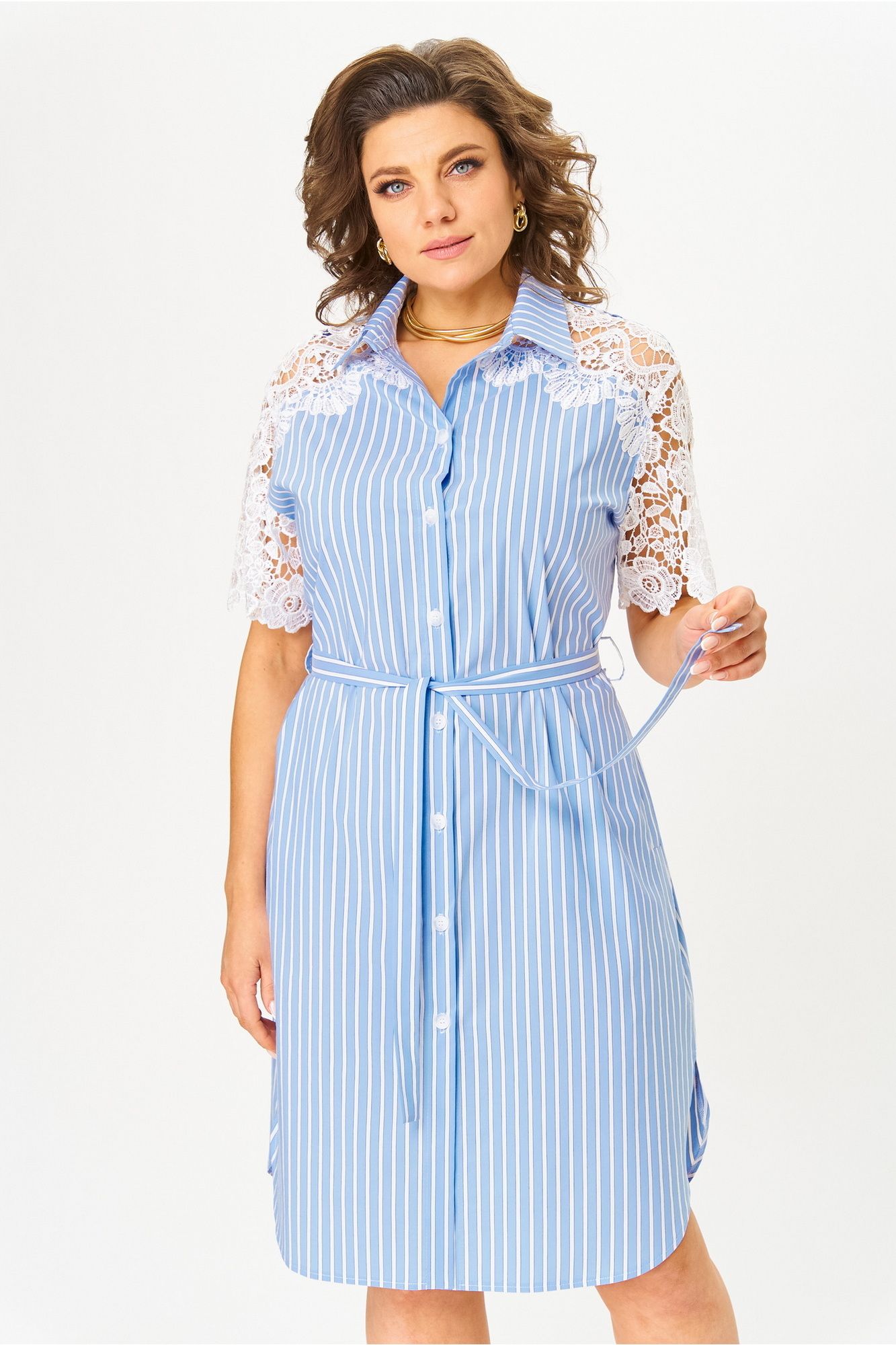 Платье-рубашка прямого кроя, с втачным рукавом. Воротник классический на стойке, застежка спереди на пуговицы. Боковые карманы и пояс по талии добавляют удобства и подчеркивают талию. Короткие рукава и кокетки из кружева делают платье оригинальным и женственным. Кокетка по спинке из основной ткани. Низ платья фигурный. Длина спинки: 102 см Длина рукава: 23 см