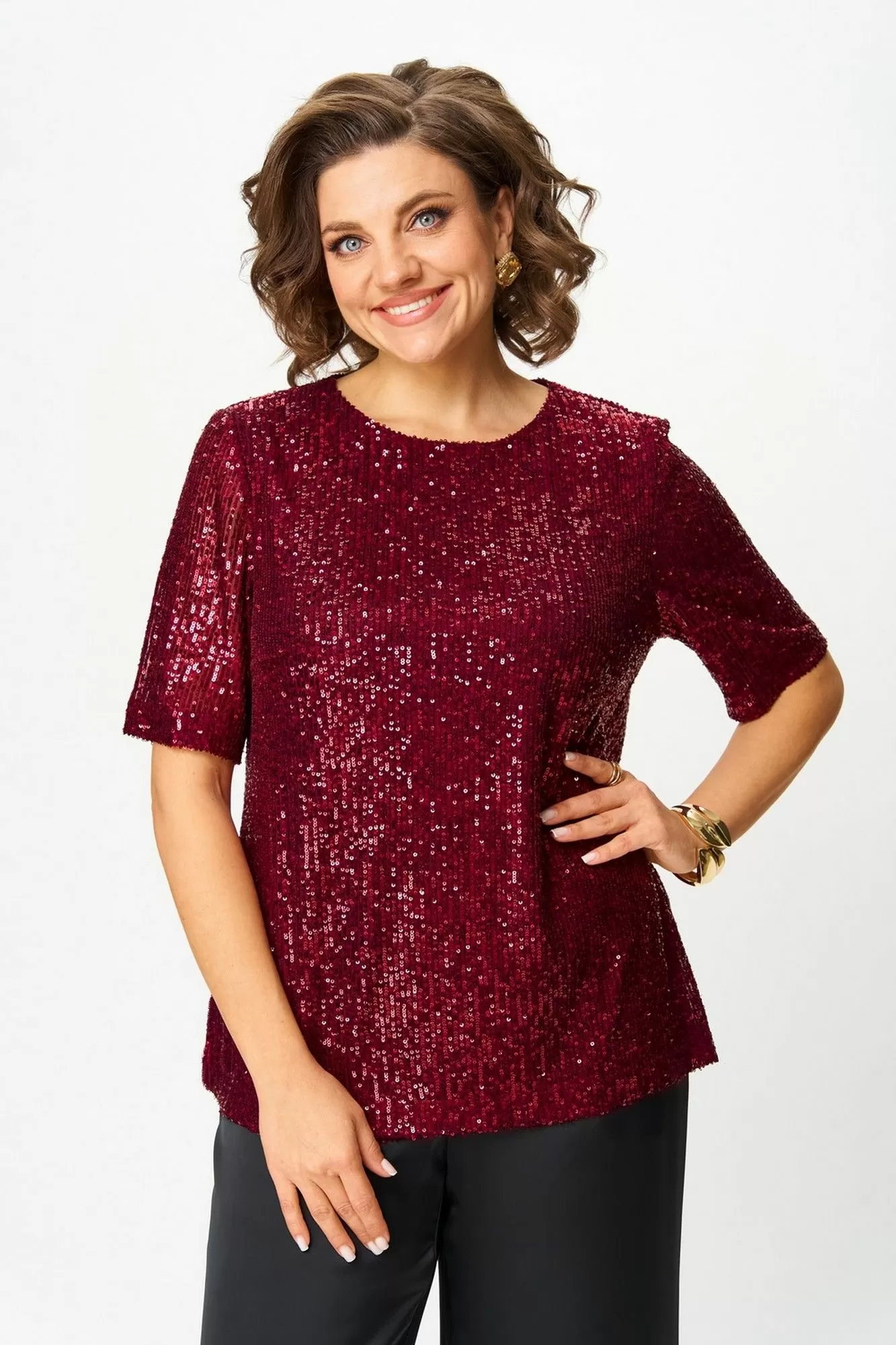 Блузка женская прямого силуэта из ткани пайетка с втачным рукавом. Горловина округлой формы обработана обтачкой. По линии груди вытачки. Рукав длиной до уровня локтя. В боковых шах обработаны разрезы. Перед и спинка блузки на трикотажной подкладке.