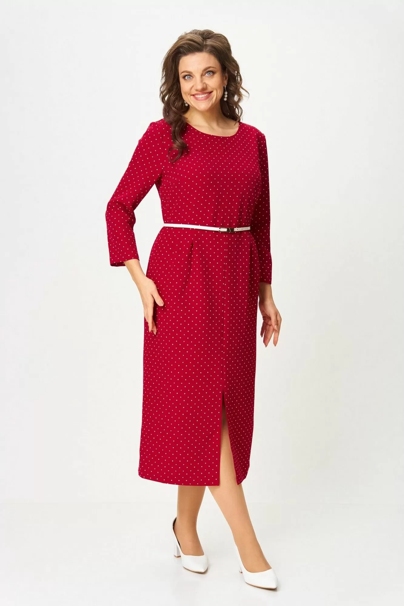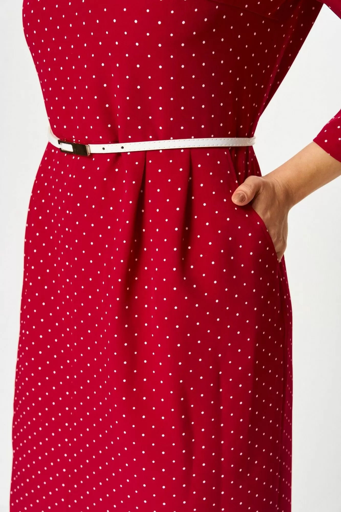 Платье женское полуприлегающего силуэта с втачным рукавом. Перед платья с горизонтальным швом по талии. Верхняя часть с вытачками по линии груди, нижняя часть со складками в области талии и карманами что обеспечивает прекрасную посадку и подчеркивает фигуру. Разрез по переду платья добавляет нотку игривости и удобства. В комплекте съемный ремень.