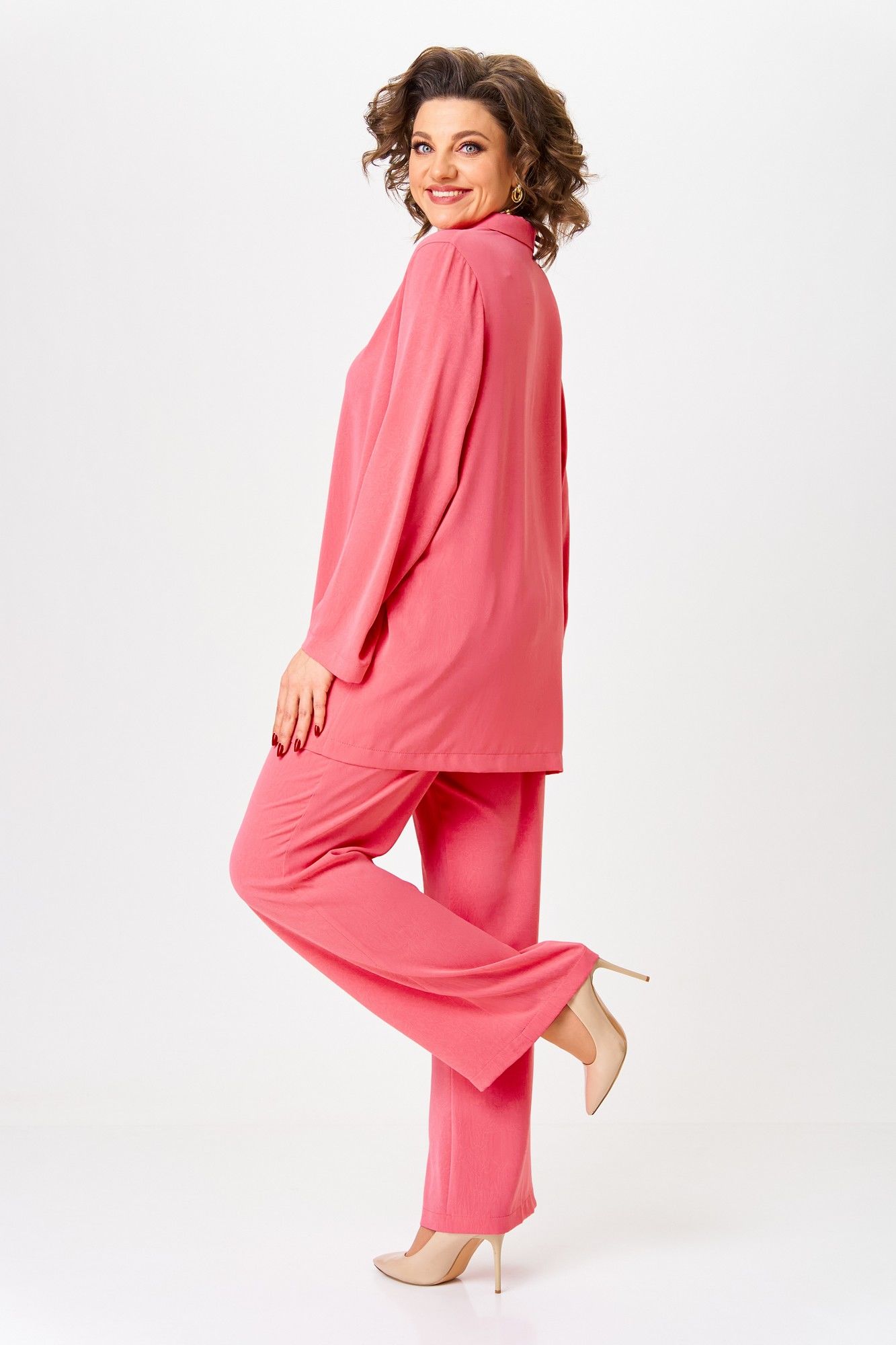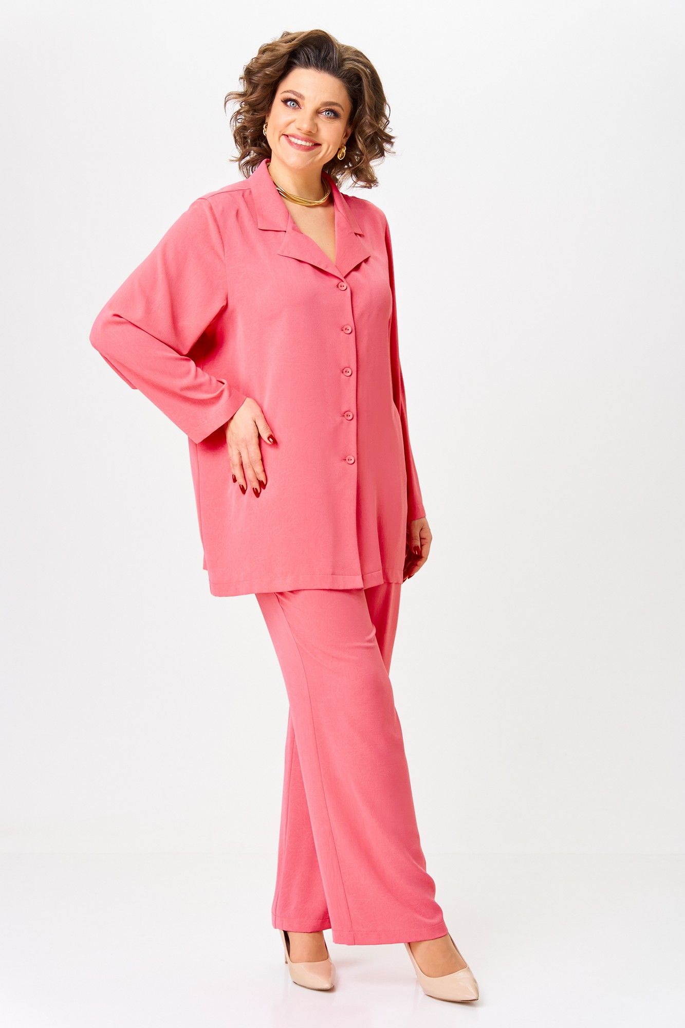 Костюм женский двухпредметный состоящий из рубашки и брюк. Рубашка прямого свободного кроя с втачным рукавом. Вырез горловины v-образный с отложным воротником и лацканами. Рукав длинный. Брюки свободного прямого кроя на притачном поясе с эластичной тесьмой. По переду карманы с отрезным бочком. Фурнитура может меняться от наличия. Топ в комплект не входит. Длина рубашки по спинке: 78 см Длина рукава: 61 см Длина брюк: 107 см