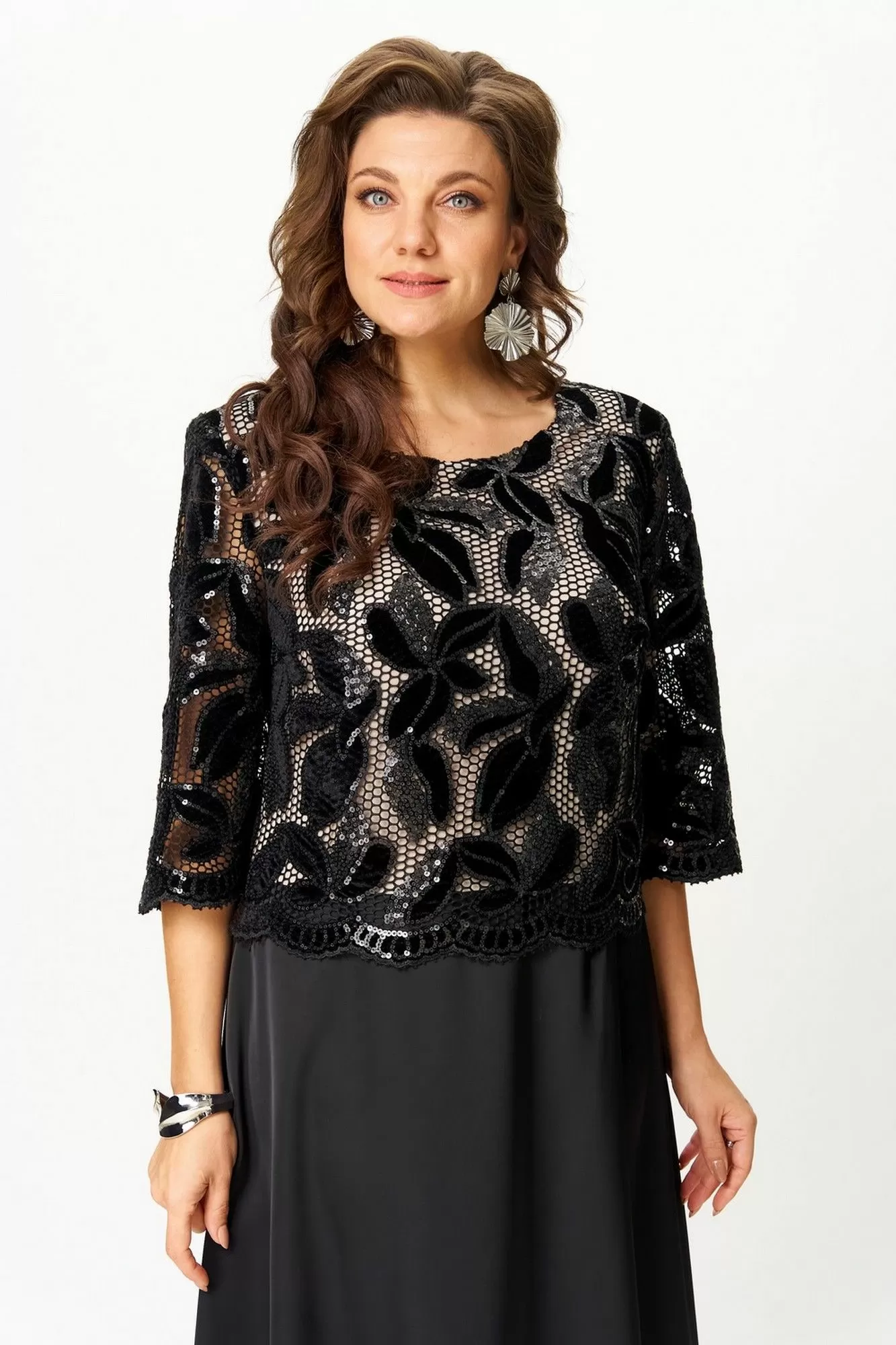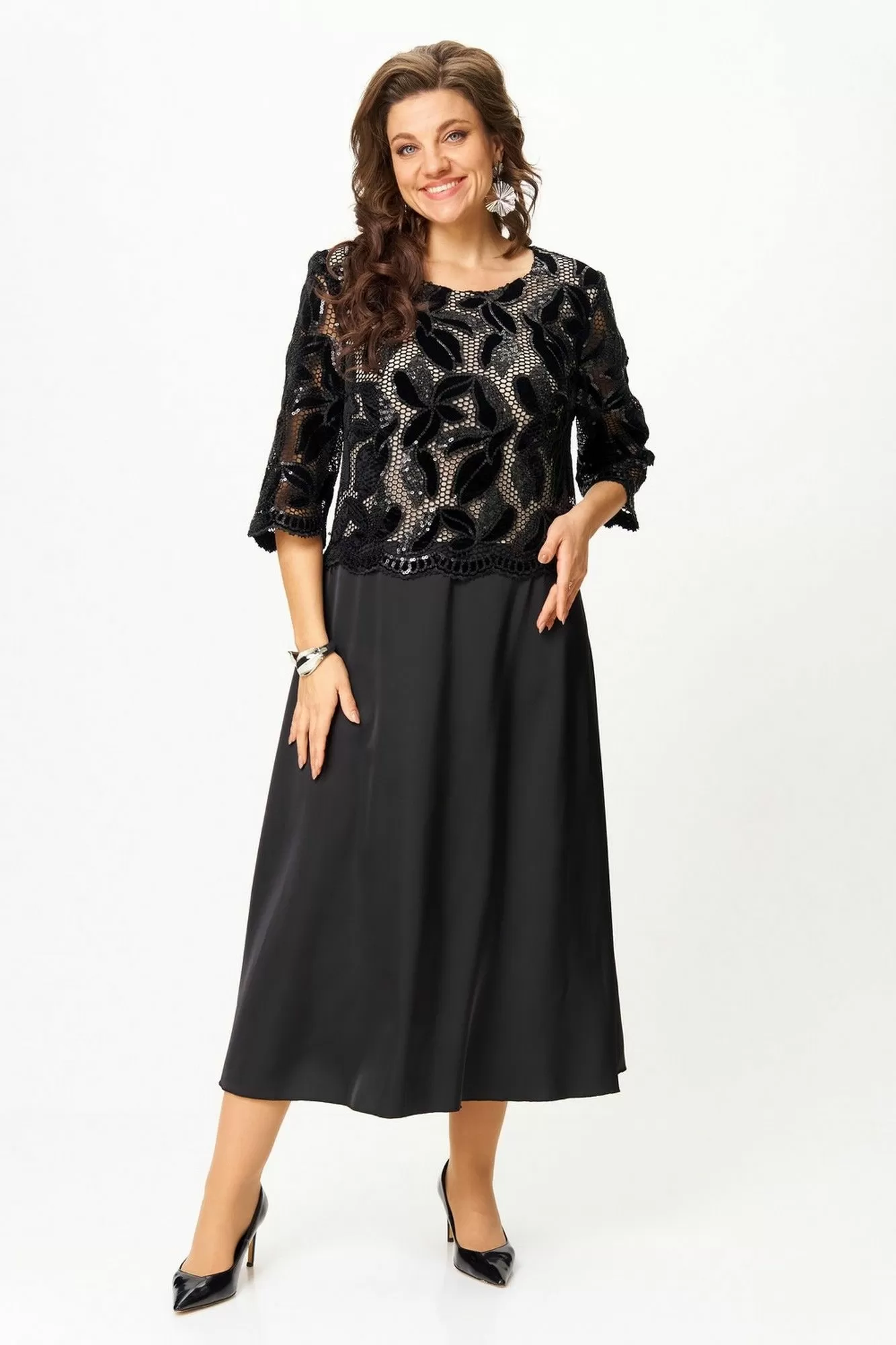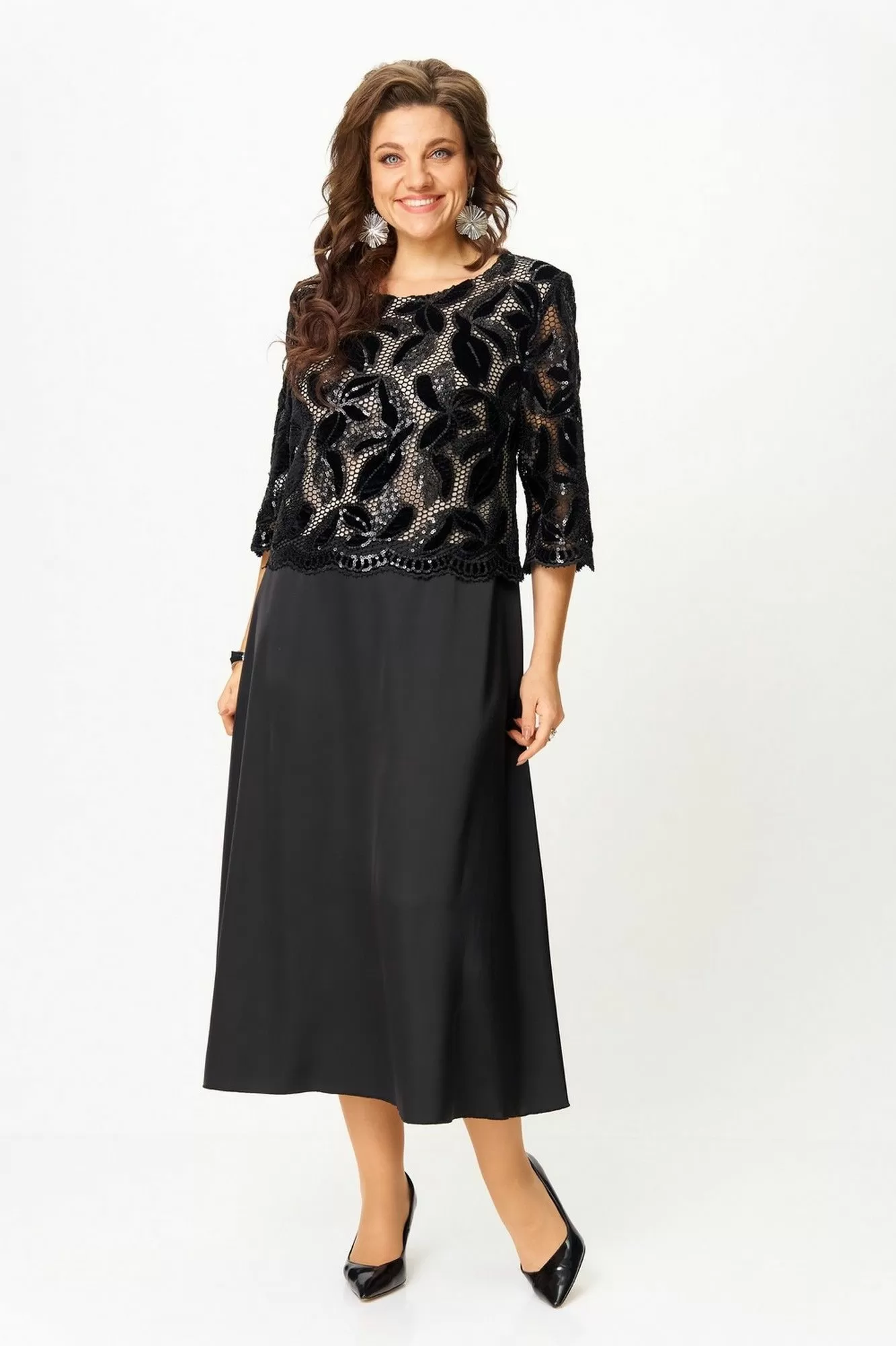 Платье женское полуприлегающего силуэта с расширением понизу. Платье выполнено как имитация комплекта. Верхняя часть платья из кружева на трикотажной подкладке, нижняя часть из атласа «Армани». По линии груди вытачки. Втачные рукава длиной ¾, добавляют романтичности и легкости. Такое платье отлично подойдет как для вечернего выхода, так и для более формальных событий.