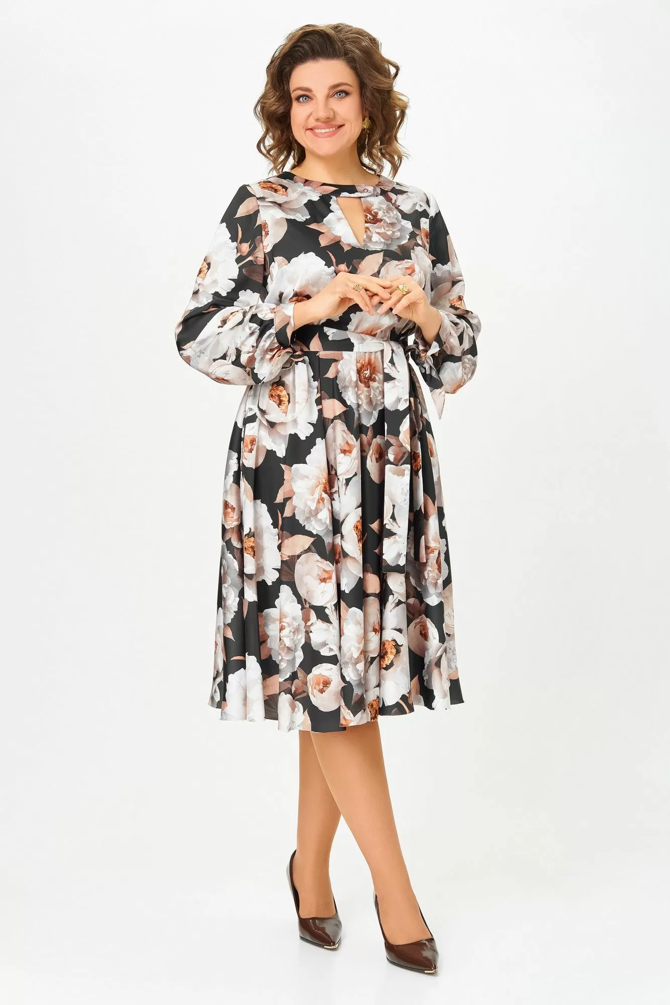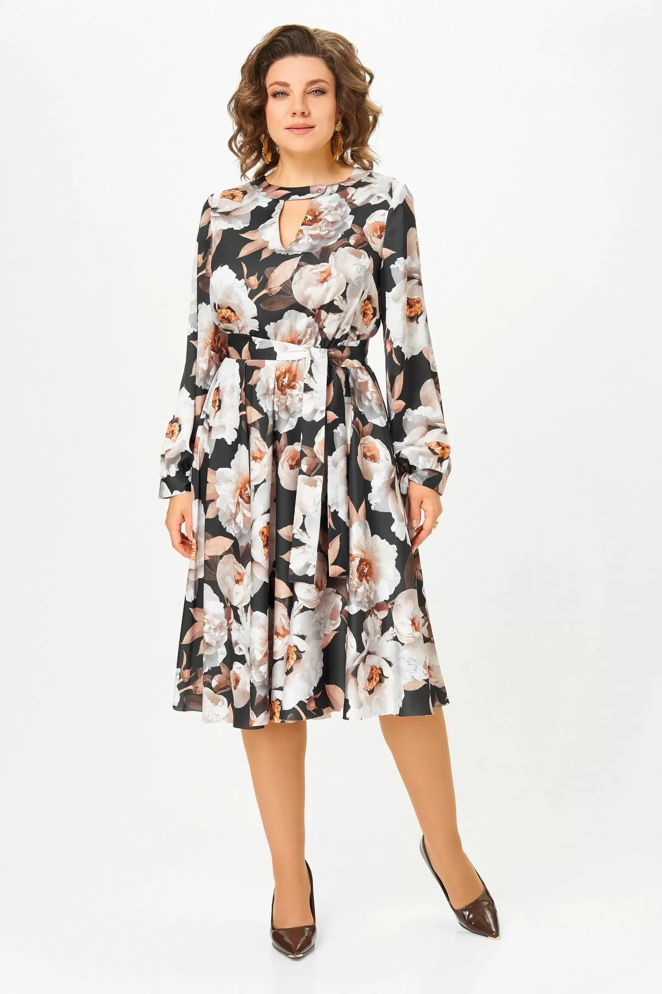 Платье из нежной ткани, имитирующей шёлк, Х-образного силуэта, отрезное по линии талии.