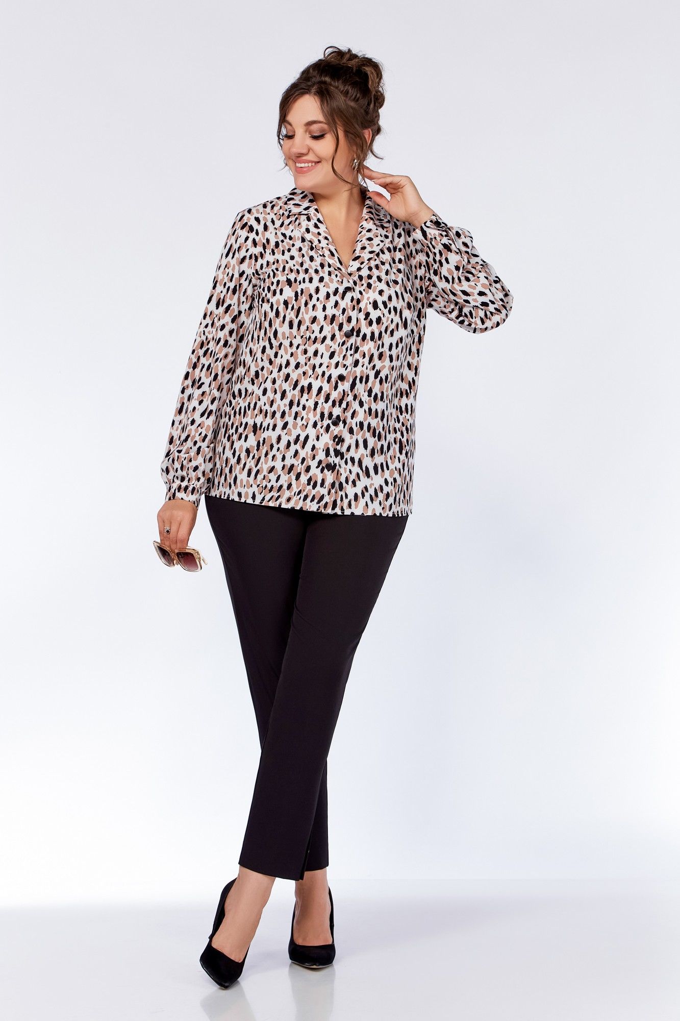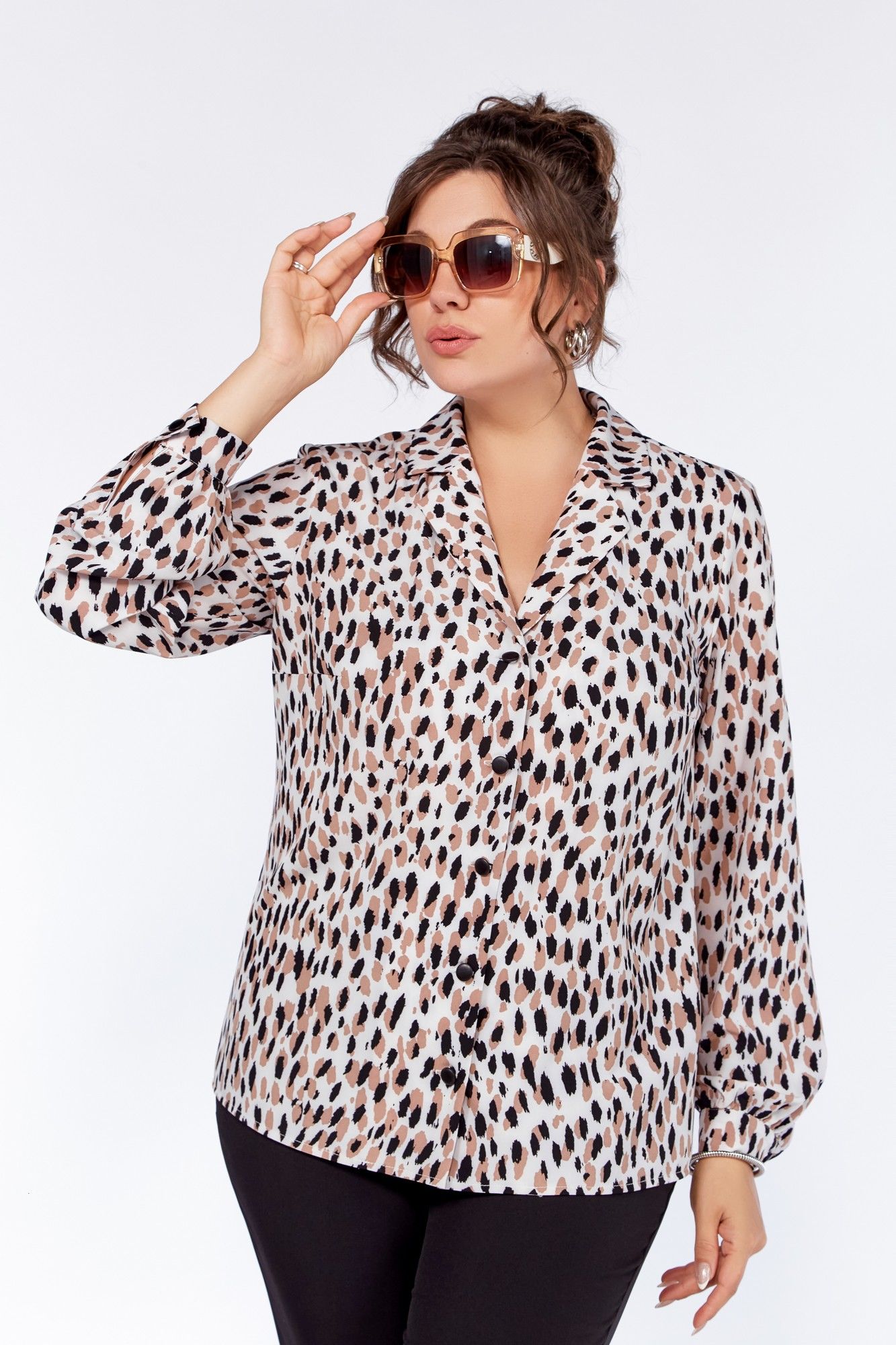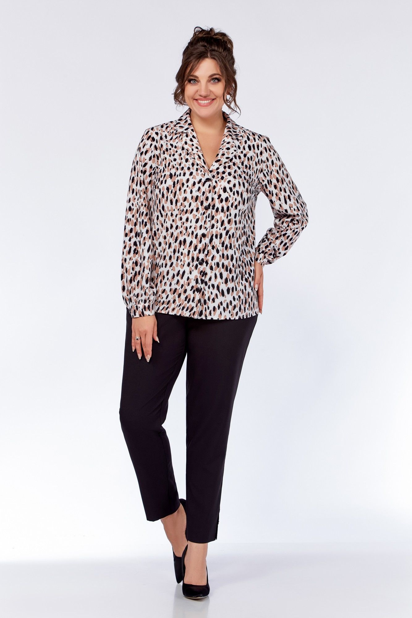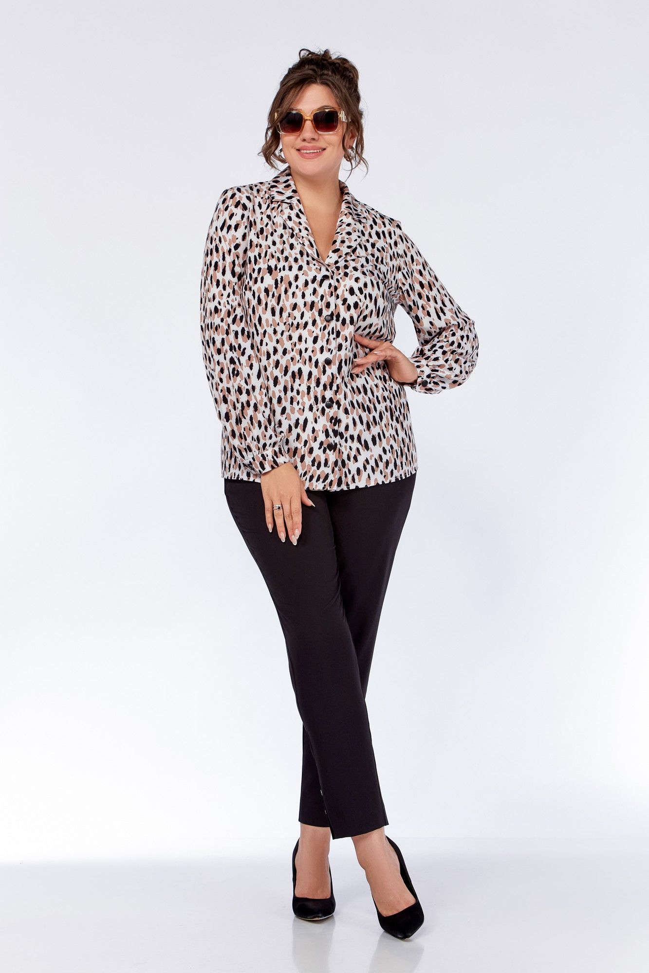 Блузка женская, прямого силуэта. По переду блузы обработаны нагрудные вытачки. Воротник – пиджачного типа. Застёжка центральная на петли и декоративные пуговицы. Спинка цельнокроеная. Рукав втачной одношовный, со сборкой. По низу рукава - притачная манжета, застёгивающаяся на петлю и декоративную пуговицу. Длина рукава 61 см (+-1 см). Длина по среднему шву спинки 64 см (+-1 см). Ремень не входит в комплект. Блуза прекрасно сочетается с брюками Модель 305, 342.