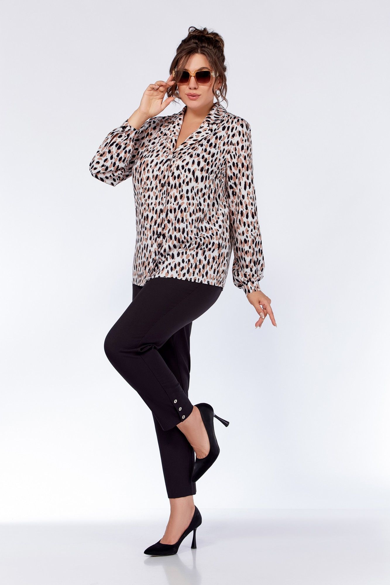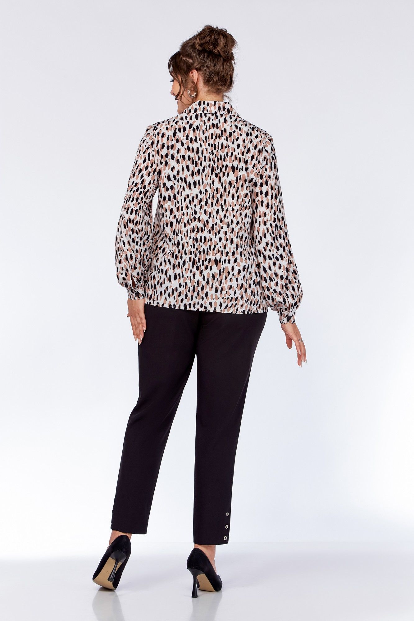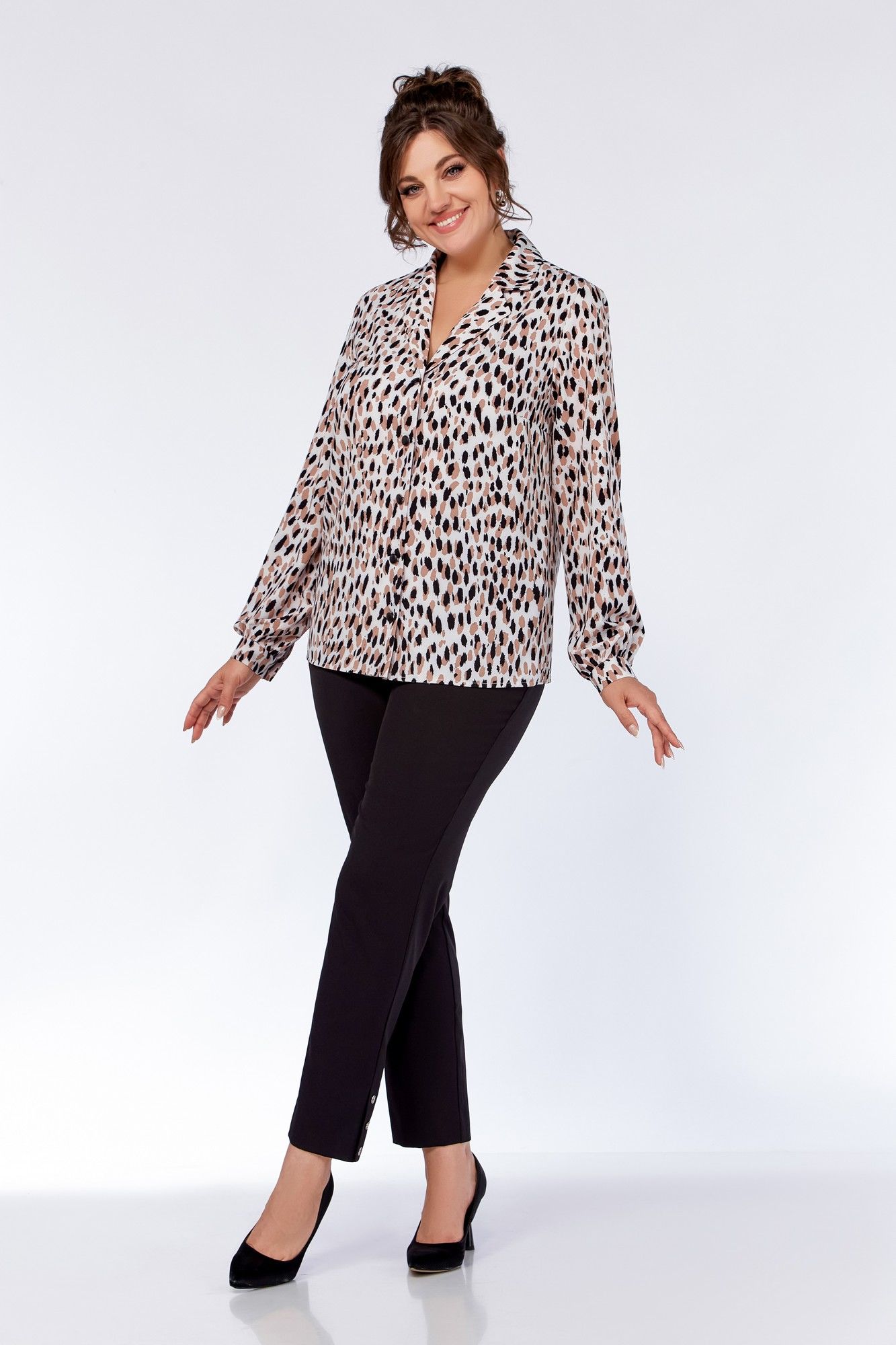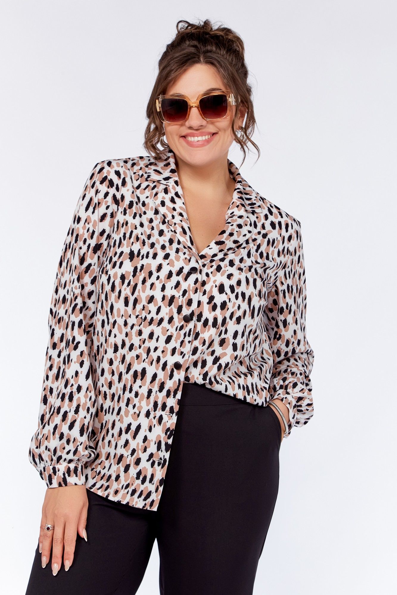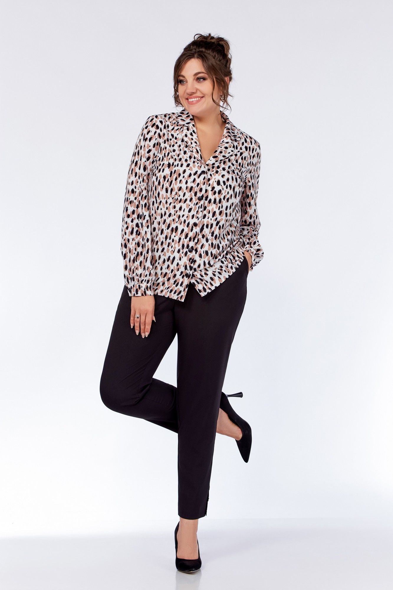 Блузка женская, прямого силуэта. По переду блузы обработаны нагрудные вытачки. Воротник – пиджачного типа. Застёжка центральная на петли и декоративные пуговицы. Спинка цельнокроеная. Рукав втачной одношовный, со сборкой. По низу рукава - притачная манжета, застёгивающаяся на петлю и декоративную пуговицу. Длина рукава 61 см (+-1 см). Длина по среднему шву спинки 64 см (+-1 см). Ремень не входит в комплект. Блуза прекрасно сочетается с брюками Модель 305, 342.