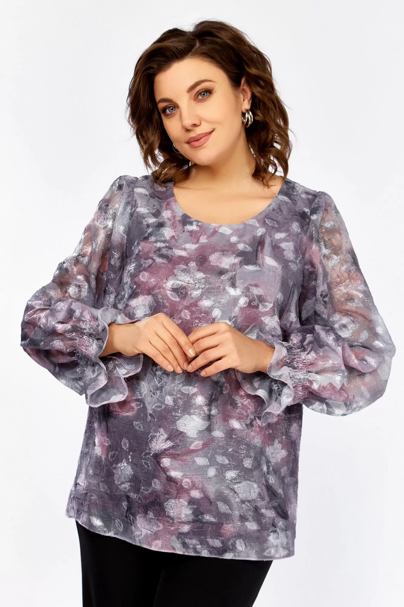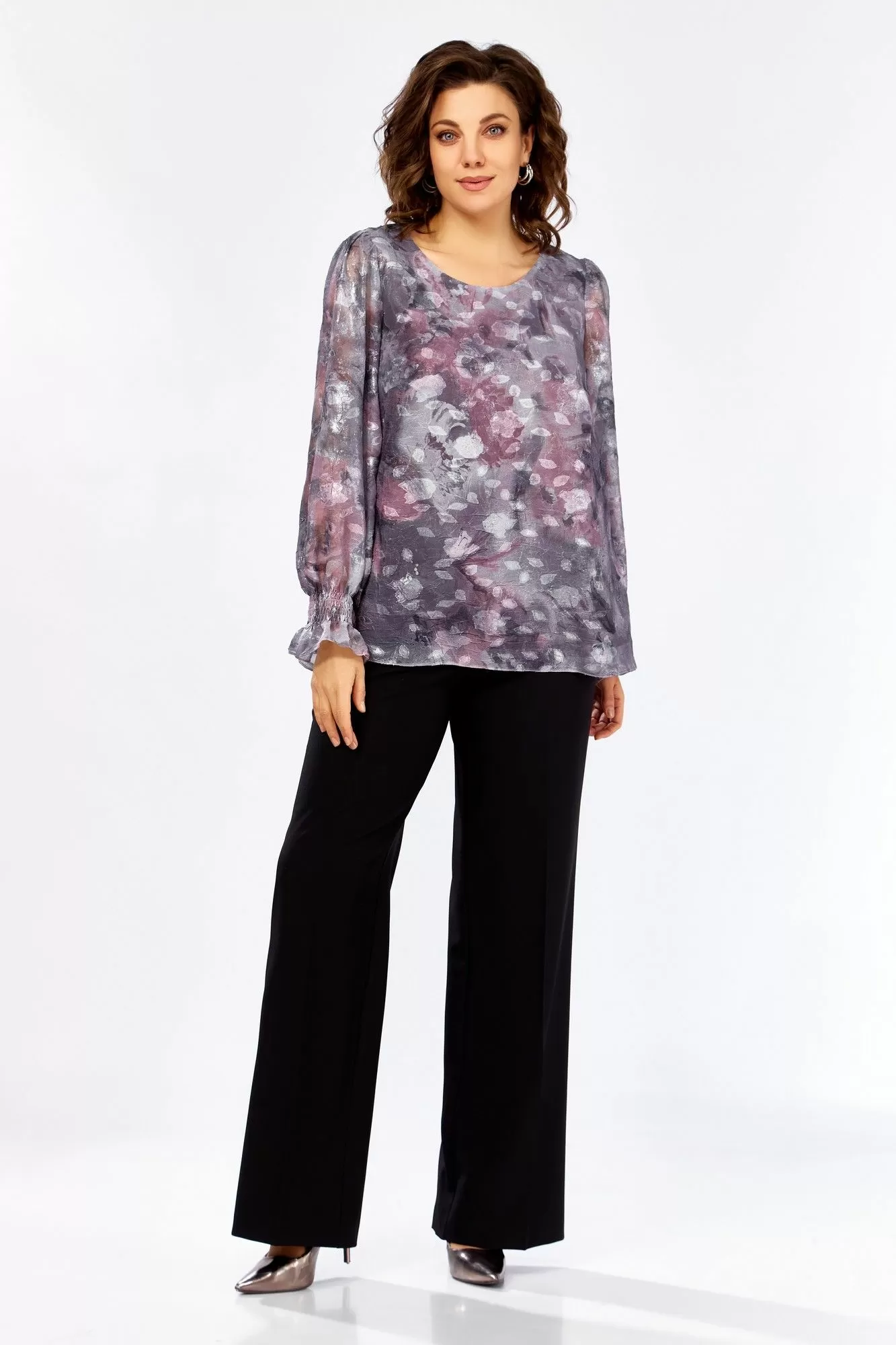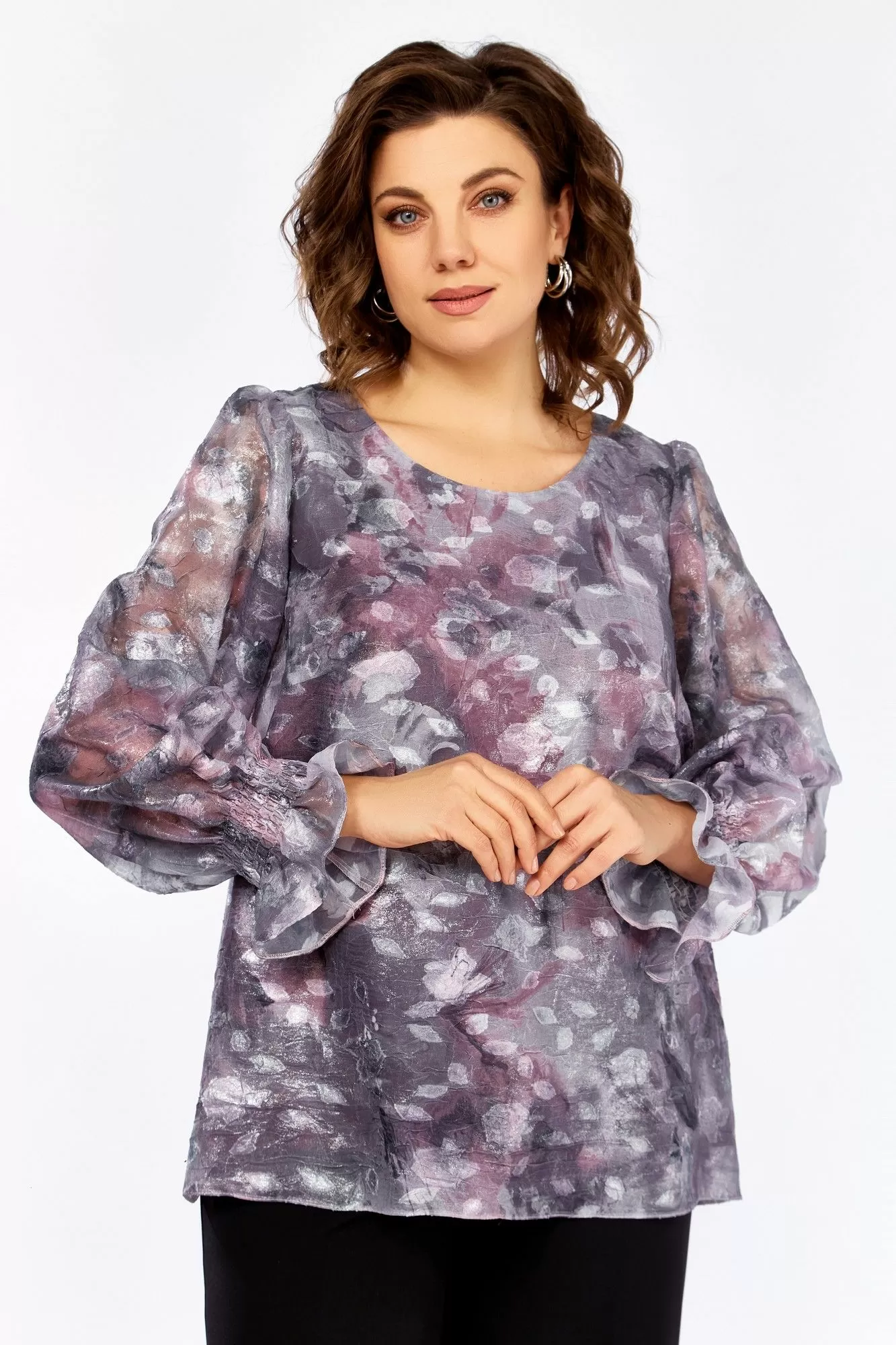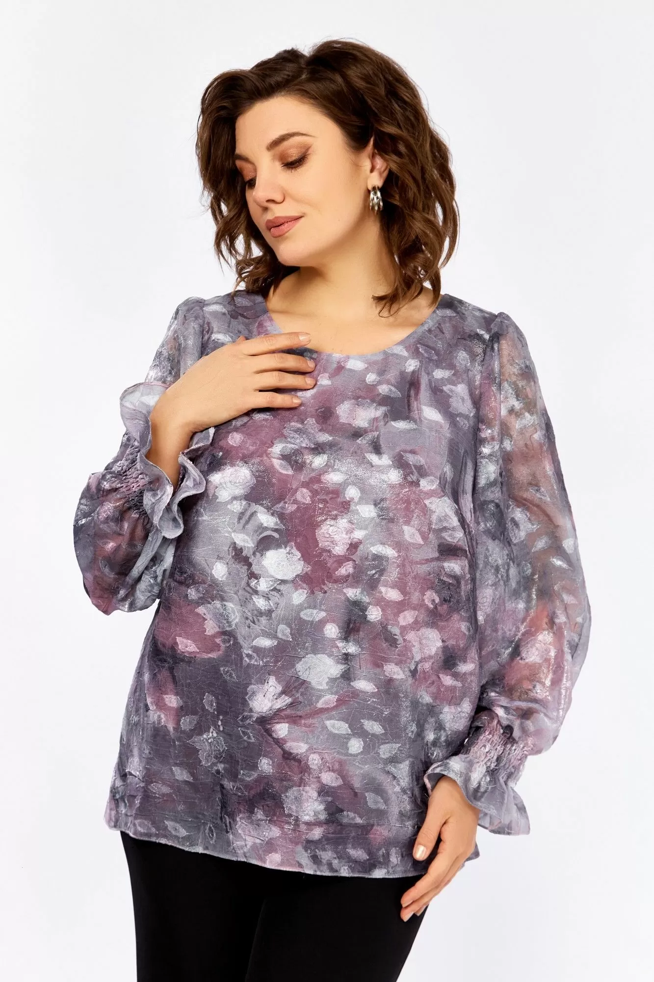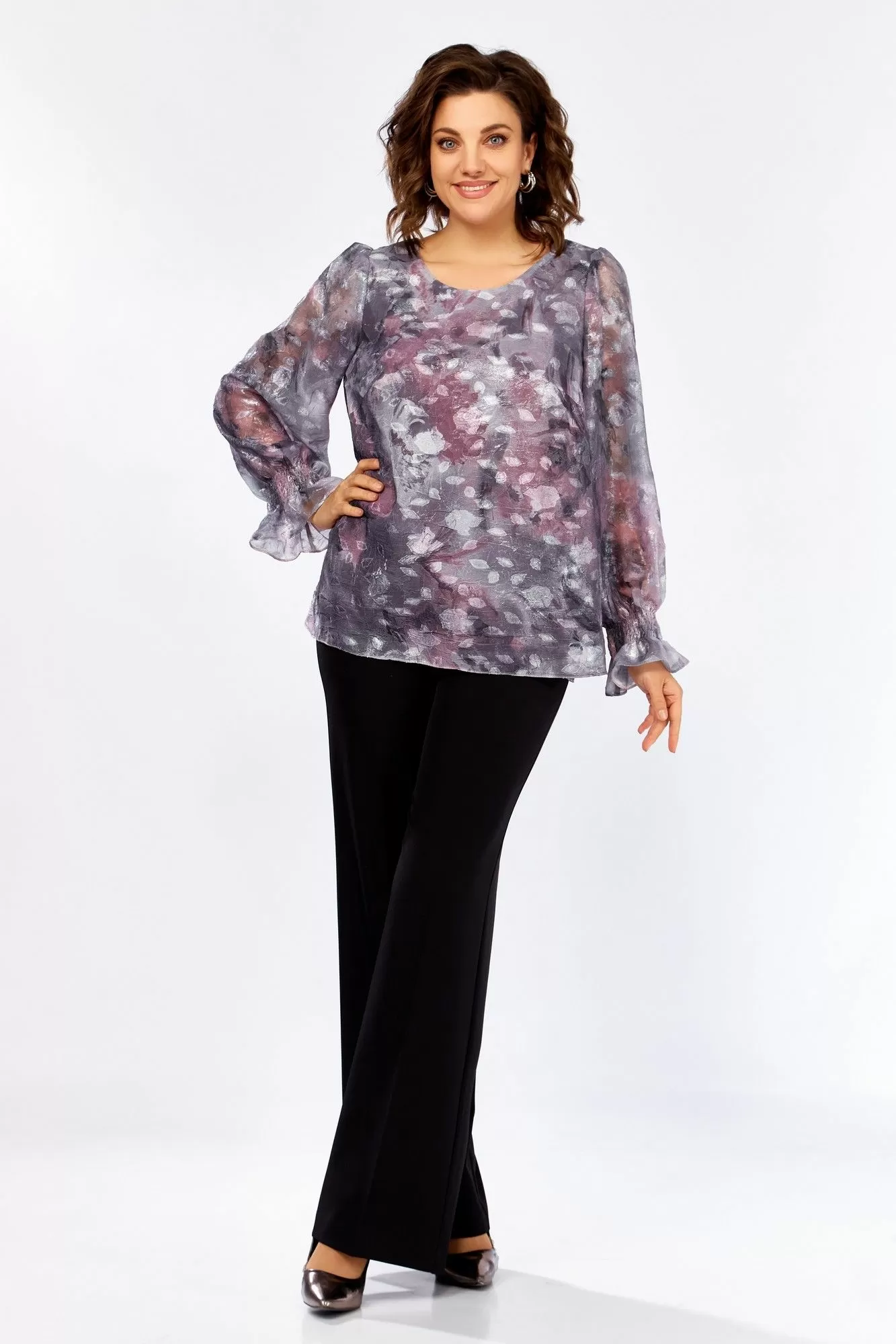 Блузка А-силуэта из нежной шифоновой ткани с лёгким эффектом «жатки», на подкладке из шифона. Полочка с нагрудными выточками, спинка без особенностей. Горловина круглая. Рукав втачной длинный по окату со сборкой, в нижней части собран на эластичную нить, которая внизу образует рюшу высотой 6 см.