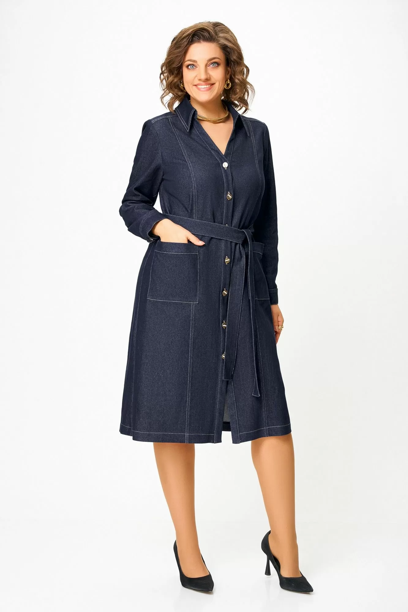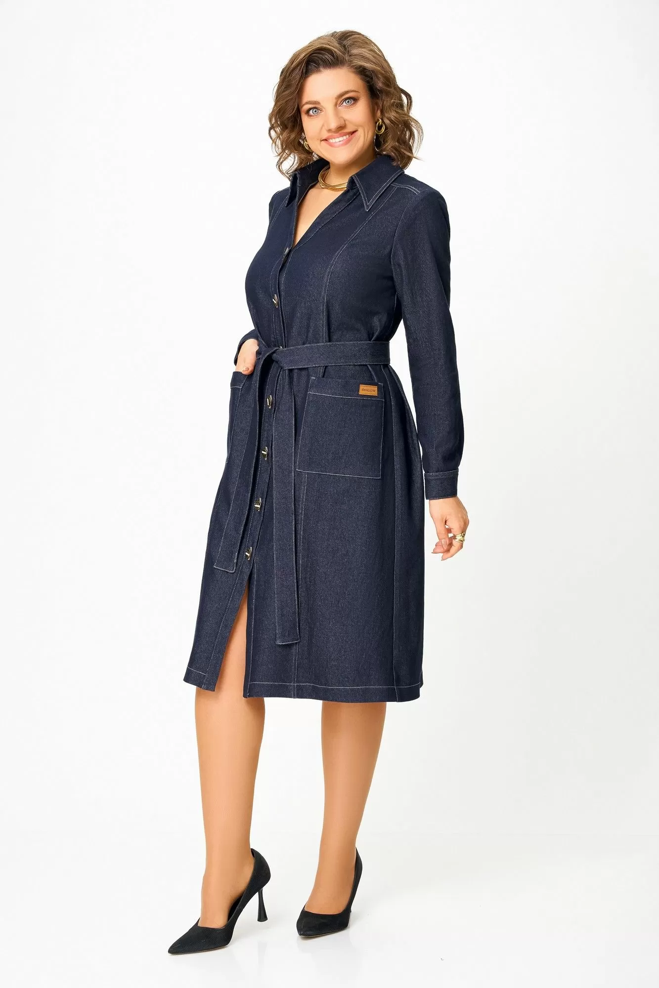 Платье из джинсовой ткани прямого силуэта с центральной застёжкой на петли и джинсовые пуговицы. Полочки с притачными фигурными планками, с рельефным швом и кокеткой, на уровне бёдер накладной карман с планкой и фирменной нашивкой «Swallow».
