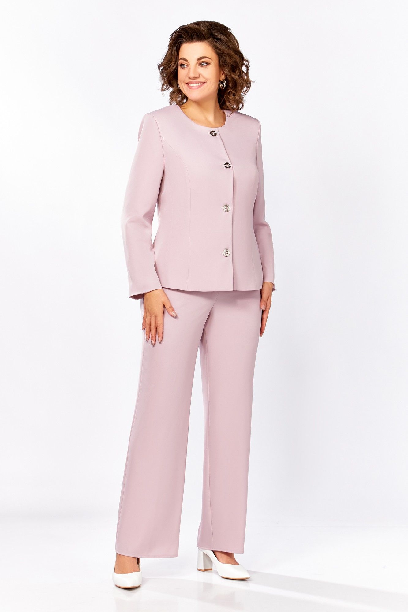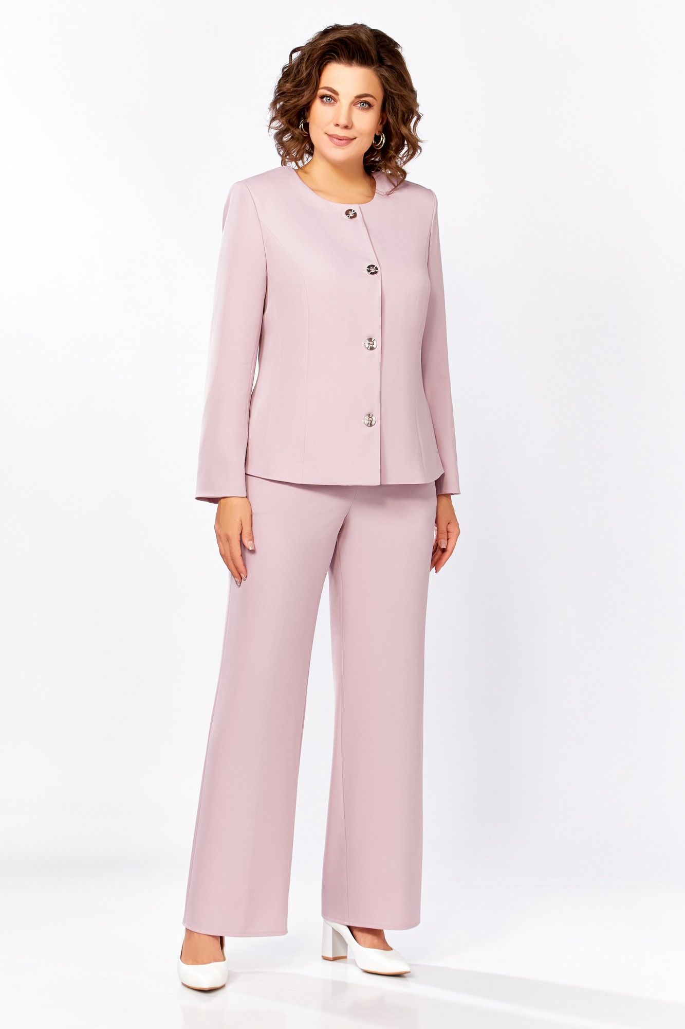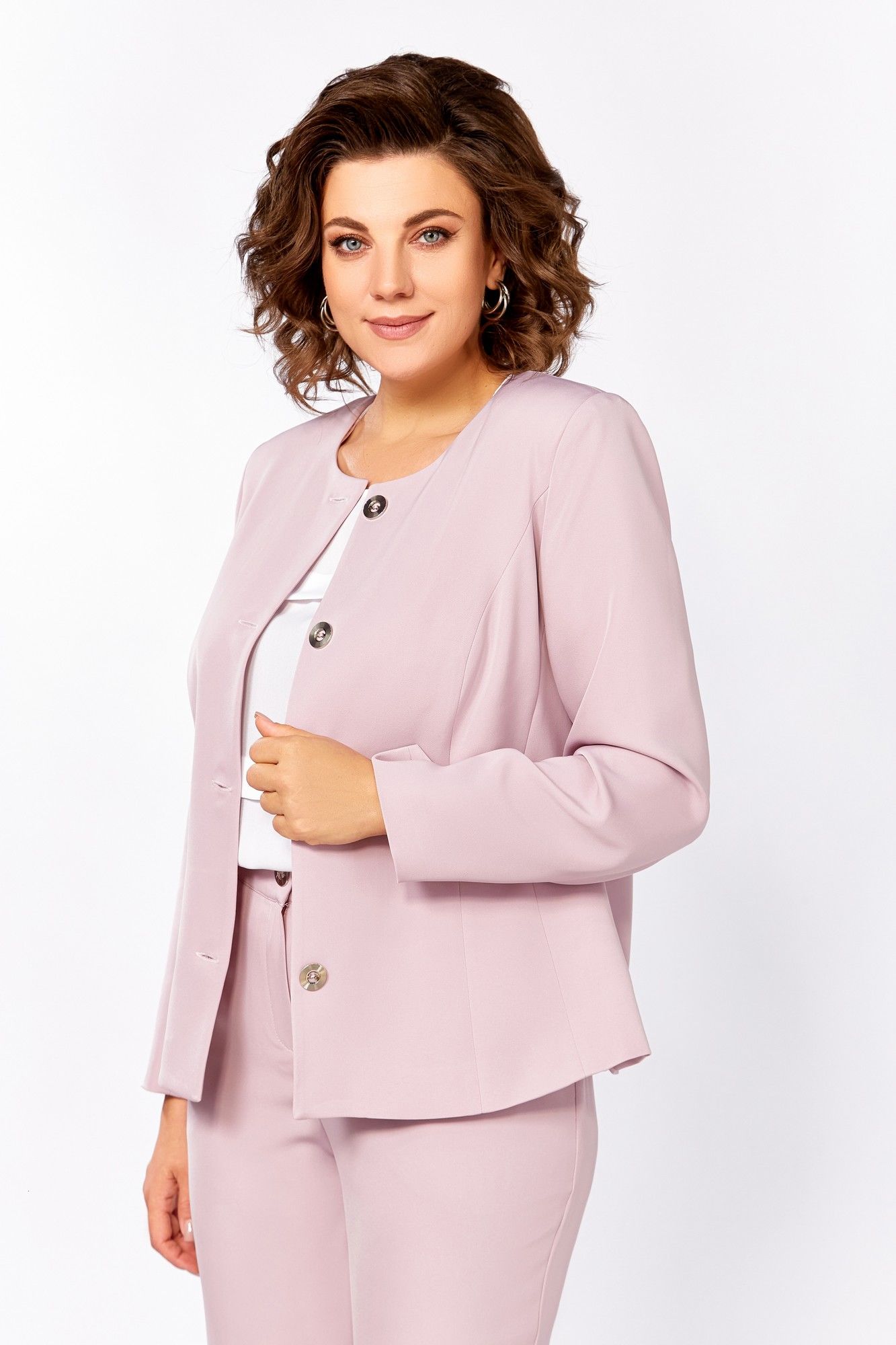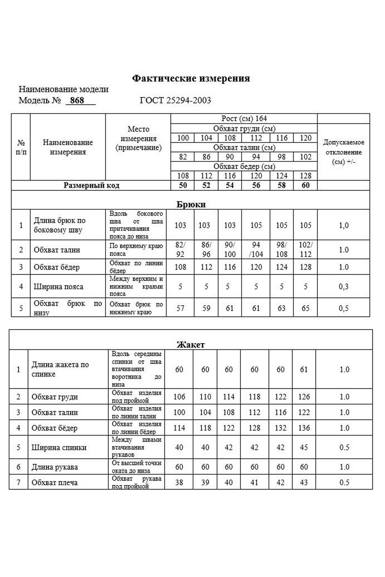 Костюм 2-х предметный, из поливискозной ткани состоящий из жакета и брюк. Жакет однобортный на подкладке, с центральной застёжкой на петли и декоративные пуговицы. По переду рельефы и отрезные бочки, по спинке - рельефы и средний шов. Горловина круглая. Рукав втачной двухшовный. Длина жакета по спинке 60 (+/-1) см. Длина рукава 60 (+/-1) см. Брюки прямого кроя. По передним половинкам боковые карманы с фигурным входом. По задним половинкам талиевые вытачки. Верх брюк обработан притачным поясом со шлёвками и с эластичной тесьмой-резинкой по спинке. Застёжка по переду на тесьму-молнию и петлю, пуговицу на поясе. Длина брюк по боковому шву, без учёта ширины пояса – 104 (+/- 1) см.