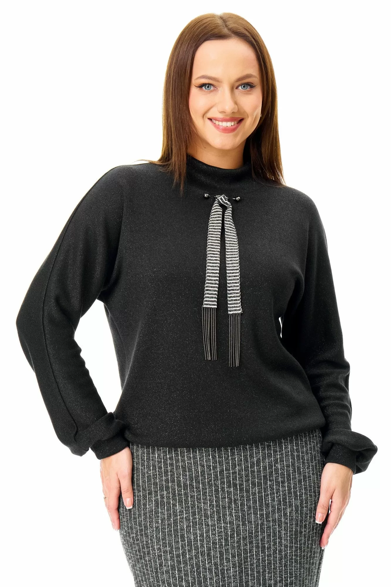 Джемпер свободного силуэта из однотонного трикотажного полотна с неярким блеском «люрекс». Горловина с невысокой «стойкой». Рукав цельнокроеный длинный с манжетой. По низу джемпера планка. Съемное стильное украшение соответствует юбке.