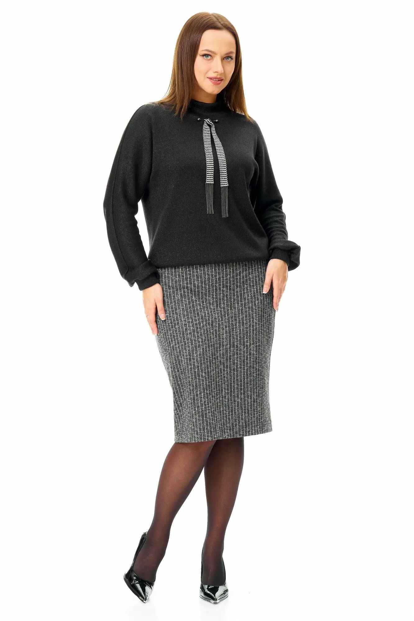 Классической длины юбка в полоску и свободный джемпер -универсальный костюм из трикотажного полотна.